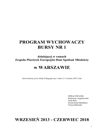 PROGRAM WYCHOWACZY BURSY NR 1 działającej w ramach Zespołu Placówek Europejski Dom Spotkań Młodzieży w WARSZAWIE Zatwierdzony przez Radę Pedagogiczną w dniu 11 września 2013 roku OPRACOWANIE: Katarzyna Augustowska Anna Kita Iwona Krop-Machalica Teresa Matusiak WRZESIEŃ 2013 - CZERWIEC 2018 1 PODSTAWA PRAWNA PROGRAMU WYCHOWAWCZEGO Konstytucji RP Konwencji Praw Dziecka; Europejskiej Karty Praw Człowieka Ustawy z dnia 26 stycznia 1982 r. Karta Nauczyciela Ustawa z dnia 19 marca 2009 r. O zmianie ustawy o systemie oświaty oraz o zmianie niektórych innych ustaw (Dz. U. Z 2009 r., Nr 56) Statut Bursy ROZPORZĄDZENIE MINISTRA EDUKACJI NARODOWEJ z dnia 12 maja 2011r. w sprawie rodzajów i szczegółowych zasad działania placówek publicznych, warunków pobytu dzieci i młodzieży w tych placówkach oraz wysokości i zasad odpłatności wnoszonej przez rodziców za pobyt ich dzieci w tych placówkach Podstawa programowa – Rozporządzenie MENiS z dn. 23 grudnia 2008r. ZAŁOŻENIA OGÓLNE Bursa jest placówką zapewniającą opiekę i wychowanie uczniom w okresie pobierania nauki poza miejscem stałego zamieszkania. Zapewnia opiekę i wychowanie uczniom gimnazjów i szkół ponadgimnazjalnych dla młodzieży, w tym uczniom wymagającym stosowania specjalnej organizacji nauki, metod pracy i wychowania. Zapewnia wychowankom: całodobową opiekę; warunki do nauki; pomoc w nauce; warunki do rozwijania zainteresowań i szczególnych uzdolnień; warunki umożliwiające uczestnictwo w kulturze, sporcie i turystyce. Działanie Bursy opiera się na wielostronnym zaufaniu, zaufaniu rodzica do dziecka, rodzica do wychowawcy, wychowawcy do dziecka i dziecka do wychowawcy. Celem ogólnym procesu wychowania i kształcenia jest wszechstronny rozwój osobowości młodego człowieka, ukierunkowany na osiąganie pełnej dojrzałości w czterech podstawowych sferach: fizycznej, psychicznej, społecznej i duchowej. Wymaga to podmiotowego traktowania go – postrzegania jego godności, wolności, niepowtarzalności, praw i obowiązków. Bursa realizuje swoje zadania we współpracy z rodzicami wychowanek, szkołą, do której uczęszczają wychowanki, oraz z poradniami psychologiczno-pedagogicznymi, w tym poradniami specjalistycznymi. Pierwotne i najważniejsze prawo wychowawcze mają rodzice, a bursa (i szkoła) przyjmuje jedynie rolę wspierającą w dziedzinie wychowania i opieki na okres pobytu wychowanki w placówce. Funkcję tę placówka realizuje w oparciu o program wychowawczy. Jego główne założenia to: • przygotowanie młodzieży pod względem społecznym, intelektualnym i moralnym do drogi w dorosłe życie; • respektowanie prawa do harmonijnego i wszechstronnego rozwoju osobowości młodego człowieka; • kształtowanie u wychowanek postaw prospołecznych i odpowiedzialności za własne czyny i słowa; • wspomaganie wychowanek w rozpoznawaniu własnych praw i obowiązków; • edukacja prozdrowotna; • kształtowanie poszanowania narodowego dziedzictwa kulturowego, europejskiego i światowego; • wpojenie zasad etyki respektujących uniwersalne wartości. 2 W bursie działa zespół wychowawczy do spraw okresowej oceny sytuacji wychowanek, powoływany przez dyrektora bursy. Do zadań zespołu wychowawczego należy w szczególności: diagnozowanie problemów wychowawczych wychowanek; opracowanie planu wychowawczego na dany rok szkolny; dokonywanie okresowej analizy i oceny skuteczności podejmowanych działań wychowawczych; doskonalenie metod pracy wychowawczej. W skład zespołu wychowawczego wchodzą: wicedyrektor bursy -jako przewodniczący zespołu; wychowawca grupy wychowawczej; psycholog oraz w miarę potrzeb inni specjaliści. Podstawową formą organizacyjną pracy z wychowankami w bursie jest grupa wychowawcza. Liczbę wychowanek w grupie wychowawczej określa dyrektor w uzgodnieniu z organem prowadzącym bursę. Grupą wychowawczą opiekuje się wychowawca grupy wychowawczej. Wymiar zajęć opiekuńczo-wychowawczych z jedną grupą wychowawczą w bursie określa tygodniowy plan zajęć, opracowany przez dyrektora bursy w uzgodnieniu z organem prowadzącym bursę. Opiekę w bursie w porze nocnej sprawuje wychowawca grupy wychowawczej. W uzasadnionych przypadkach opiekę w porze nocnej może sprawować osoba niebędąca wychowawcą, wyznaczona przez dyrektora bursy. Bursa prowadzi działalność przez cały rok szkolny jako placówka, w której są przewidziane ferie szkolne. ZASADY OGÓLNE W procesie wychowania, opieki i kształcenia nasza Bursa realizuje model humanistyczny zakorzeniony w uniwersalnych, ponadczasowych wartościach, takich jak: dobro, godność, człowieczeństwo, prawda, szacunek, odpowiedzialność, piękno i miłość. W oparciu o te wartości, które także akceptują wychowanki i ich rodzice, kształtowanie i rozwijanie właściwych postaw dziewcząt odbywa się zarówno w czasie codziennych, stałych oddziaływań opiekuńczo – wychowawczych, jak i zajęć o charakterze dydaktycznym. Podstawowym czynnikiem wychowawczym jest prawidłowa realizacja zadań opiekuńczych i dydaktycznych określona w statucie bursy. Dokument ten stanowi niezbędny element towarzyszący bursowemu programowi wychowawczemu. MISJA BURSY We wszystkich działaniach kierujemy się wyznawanymi wartościami oraz poszanowaniem praw i godności człowieka, zgodnie z Konwencją o Prawach Dziecka oraz Konwencją o Ochronie Praw Człowieka i Podstawowych Wolności. Wychowujemy młodzież w duchu uniwersalnych wartości moralnych, tolerancji, humanistycznych wartości, patriotyzmu, solidarności, demokracji, wolności i sprawiedliwości społecznej. Działania pedagogiczne i opiekuńczo – wychowawcze orientujemy na dobro wychowanek (tworząc warunki intelektualnego, emocjonalnego, społecznego, estetycznego i fizycznego rozwoju wychowanek ), a także ich dalszy los. Przygotowujemy młodzież do świadomego i racjonalnego funkcjonowania w świecie ludzi dorosłych oraz do pełni
