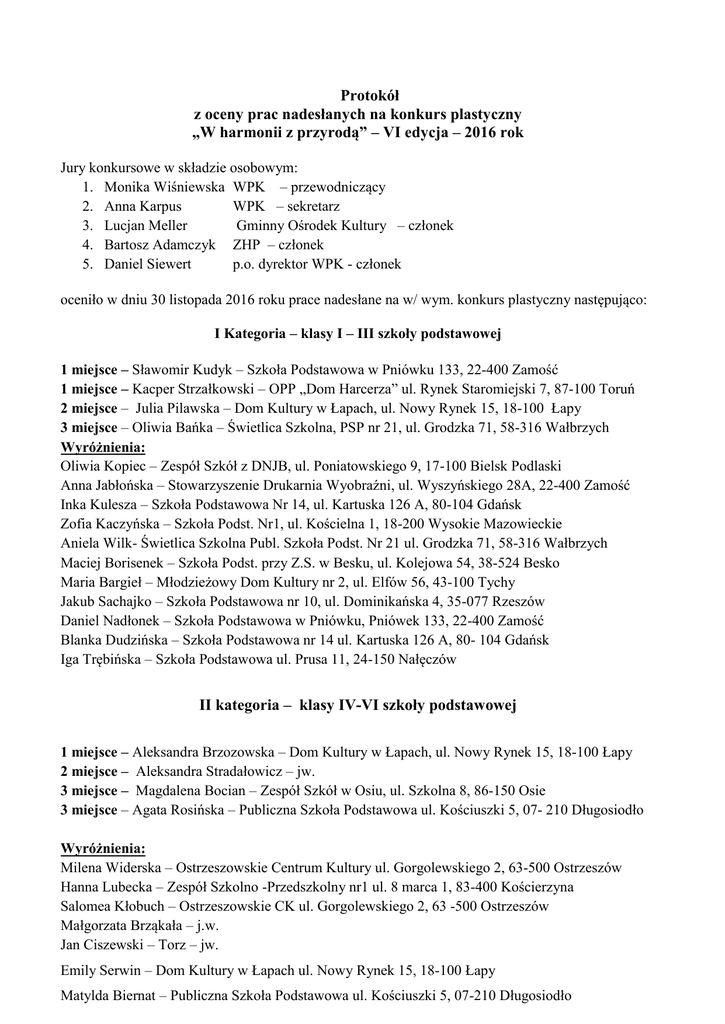 Protokół z oceny prac nadesłanych na konkurs plastyczny „W harmonii z przyrodą” – VI edycja – 2016 rok Jury konkursowe w składzie osobowym: 1. Monika Wiśniewska WPK – przewodniczący 2. Anna Karpus WPK – sekretarz 3. Lucjan Meller Gminny Ośrodek Kultury – członek 4. Bartosz Adamczyk ZHP – członek 5. Daniel Siewert p.o. dyrektor WPK - członek oceniło w dniu 30 listopada 2016 roku prace nadesłane na w/ wym. konkurs plastyczny następująco: I Kategoria – klasy I – III szkoły podstawowej 1 miejsce – Sławomir Kudyk – Szkoła Podstawowa w Pniówku 133, 22-400 Zamość 1 miejsce – Kacper Strzałkowski – OPP „Dom Harcerza” ul. Rynek Staromiejski 7, 87-100 Toruń 2 miejsce – Julia Pilawska – Dom Kultury w Łapach, ul. Nowy Rynek 15, 18-100 Łapy 3 miejsce – Oliwia Bańka – Świetlica Szkolna, PSP nr 21, ul. Grodzka 71, 58-316 Wałbrzych Wyróżnienia: Oliwia Kopiec – Zespół Szkół z DNJB, ul. Poniatowskiego 9, 17-100 Bielsk Podlaski Anna Jabłońska – Stowarzyszenie Drukarnia Wyobraźni, ul. Wyszyńskiego 28A, 22-400 Zamość Inka Kulesza – Szkoła Podstawowa Nr 14, ul. Kartuska 126 A, 80-104 Gdańsk Zofia Kaczyńska – Szkoła Podst. Nr1, ul. Kościelna 1, 18-200 Wysokie Mazowieckie Aniela Wilk- Świetlica Szkolna Publ. Szkoła Podst. Nr 21 ul. Grodzka 71, 58-316 Wałbrzych Maciej Borisenek – Szkoła Podst. przy Z.S. w Besku, ul. Kolejowa 54, 38-524 Besko Maria Bargieł – Młodzieżowy Dom Kultury nr 2, ul. Elfów 56, 43-100 Tychy Jakub Sachajko – Szkoła Podstawowa nr 10, ul. Dominikańska 4, 35-077 Rzeszów Daniel Nadłonek – Szkoła Podstawowa w Pniówku, Pniówek 133, 22-400 Zamość Blanka Dudzińska – Szkoła Podstawowa nr 14 ul. Kartuska 126 A, 80- 104 Gdańsk Iga Trębińska – Szkoła Podstawowa ul. Prusa 11, 24-150 Nałęczów II kategoria – klasy IV-VI szkoły podstawowej 1 miejsce – Aleksandra Brzozowska – Dom Kultury w Łapach, ul. Nowy Rynek 15, 18-100 Łapy 2 miejsce – Aleksandra Stradałowicz – jw. 3 miejsce – Magdalena Bocian – Zespół Szkół w Osiu, ul. Szkolna 8, 86-150 Osie 3 miejsce – Agata Rosińska – Publiczna Szkoła Podstawowa ul. Kościuszki 5, 07- 210 Długosiodło Wyróżnienia: Milena Widerska – Ostrzeszowskie Centrum Kultury ul. Gorgolewskiego 2, 63-500 Ostrzeszów Hanna Lubecka – Zespół Szkolno -Przedszkolny nr1 ul. 8 marca 1, 83-400 Kościerzyna Salomea Kłobuch – Ostrzeszowskie CK ul. Gorgolewskiego 2, 63 -500 Ostrzeszów Małgorzata Brząkała – j.w. Jan Ciszewski – Torz – jw. Emily Serwin – Dom Kultury w Łapach ul. Nowy Rynek 15, 18-100 Łapy Matylda Biernat – Publiczna Szkoła Podstawowa ul. Kościuszki 5, 07-210 Długosiodło Anastazja Rzyszkiewicz – Szkoła Podstawowa nr1 ul. Poniatowskiego 16, 62-030 Luboń Weronika Staroń – Szkoła Podstawowa nr 14, ul. Kartuska 126A, 80-104 Gdańsk Klaudia Jastrzębska – Dom Kultury w Łapach, ul. Nowy Rynek 15, 18-100 Łapy Dominik Smoleń – Publiczna Szkoła Podstawowa ul. Szkolna 11, 32-765 Rzezawa III kategoria – gimnazjum 1 miejsce – Paulina Rozwadowska – Publiczne Gimnazjum ul. 1Maja 2, 18- 210 Szepietowo 2 miejsce – Eryk Rapiej – Gimnazjum nr 8 ul. Miodowa 6, 35-303 Rzeszów 3 miejsce – Magdalena Okrój – Zespół Szk.- Przedsz. nr 3 ul. Mestwina II/3 83-400 Kościerzyna 3 miejsce – Zuzanna Zomkowska – Zespół Szkół w Osiu ul. Szkolna 8, 86-150 Osie Wyróżnienia: Wiktoria Antoniewicz – Ostrzeszowskie Centrum Kultury ul. Gorgolewskiego 2, 63-500 Ostrzeszów Laura Schumacher – j.w. Wiktoria Rusinek – Gimnazjum nr 8 ul. Miodowa 6 , 35-303 Rzeszów Julia Miąsik – j.w. Wiktoria Dzik – Publiczne Gimnazjum nr 3 ul. Konstytucji 3 Maja 23, 19-200 Grajewo Martyna Pietrzak – j.w. Klaudia Matuszewska – Zespół Szk. – Przedsz. Nr 1 Gimnazjum ul. Kaliska 39, 62-610 Sompolno Martyna Derengowska – Zespół Szk.- Przedsz. Nr3 ul. Mestwina II/3 83-400 Kościerzyna Szymon Mielczarek – Ośrodek Społeczno-Kulturalny SM „Podzamcze” Aleje Podwale 1, 58-316 Wałbrzych Urszula Dołęgowska – Publiczne Gimnazjum ul. 1Maja 2, 18-210 Szepietowo Emil Grużalski – Zespół Szkół w Osiu ul. Szkolna 8, 86-150 Osie Anna Dąbrowska – Publiczne Gimnazjum nr1 u. Reymonta 9, 18-400 Łomża IV kategoria – szkoły ponadgimnazjalne 1 miejsce – Zuzanna Dworakowska – IV LO ul. Zwierzyniecka 9a, 15- 312 Białystok 1 miejsce – Dariusz Begiedza – Liceum Plastyczne ul. Koszalińska 9, 76-200 Słupsk 2 miejsce – Stach Czomber – j.w. 3 miejsce – Ewelina Babis – j.w. Wyróżnienia: Klaudia Sznajder – Powiatowe Centrum Edukacji i Kompetencji Zawodowych ul. Witosa 2, 33- 230 Szczucin Weronika Utecht – Zespół Szkól Rolniczych w Grzybnie Technikum Architektury Krajobrazu 63-112 Brodnica Jessica Domańska – Zespół Szkół Ponadgimnazjalnych ul. Staszica 3, 56-416 Twardogóra Eryk Roman – Liceum Plastyczne ul. Koszalińska 9, 76-200 Słupsk Tadeusz Czomber – j.w. Dagmara Grzegorczyk – j.w. Aleksandra Klepin – j.w. Szymon Bocian – I LO ul. Gimnazjalna 3, 86-100 Świecie Karolina Olech – Zespół Szkół Ponadgimnazjalnych ul. Francuska 6, 59-900 Zgorzelec Zuzanna Woźnica – Bolesławiecki Ośrodek Kultury Plac Piłsudskiego 1c, 59-700 Bolesławiec Prace wyróżnione poza powyższymi kategoriami: Igor Bojanowski – Szkoła Podstawowa w Łążku – „0” Kamil Kozłowski – j.w Weronika Słomba – S. P. w Książnicach, 39-300 Mielec – oddział przedszkolny Kacper Musiński – Zespół Szkół Specjalnych ul. Nowogrodzka 4, 18- 400 Łomża Paweł Piwowarczyk – Specjalny Ośrodek Szkolno- Wychowawczy Osiedle Zielone 1A, 16 -100 Sokółka Na tym protokół zakończono i podpisano 1. …………………………………… 2. …………………………………… 3. …………………………………… 4. …………………………………… 5. ……………………………………