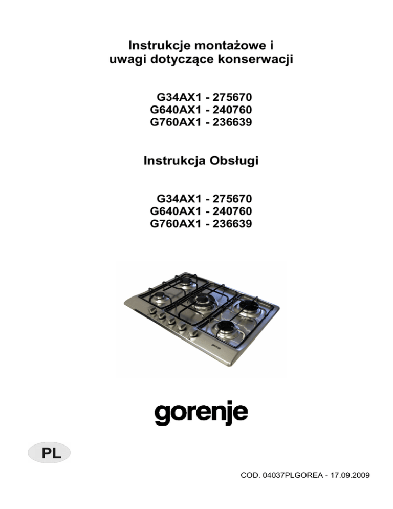 Instrukcje montażowe i uwagi dotyczące konserwacji G34AX1 - 275670 G640AX1 - 240760 G760AX1 - 236639 Instrukcja Obsługi G34AX1 - 275670 G640AX1 - 240760 G760AX1 - 236639 COD. 04037PLGOREA - 17.09.2009 OPIS PŁYT KUCHENNYCH TYP: G640AX1 - 240760 TYP: G760AX1 - 236639 TYP: G34AX1 - 275670 1. Palnik centralny trzykoronowy 2. Palnik szybkogotujący 3. Palnik średni przedni prawy 4. Palnik średni tylny lewy 5. Palnik pomocniczy przedni lewy 6. Ruszt emaliowany dwupalnikowy 7. Ruszt emaliowany centralny palnika trzykoronowego 8. Pokrętło sterujące palnikiem nr 1 – trzykoronowym 9. Pokrętło sterujące palnikiem nr 2 – szybkogotującym 10. Pokrętło sterujące palnikiem nr 3 – średnim przednim prawym 11. Pokrętło sterujące palnikiem nr 4 – średni tylny lewy 12. Pokrętło sterujące palnikiem nr 5 – pomocniczy przedni lewy 13. Przycisk zapalacza elektrycznego Moc 3100 W Moc 2800 W Moc 1850 W Moc 1850 W Moc 1100 W UWAGA! Płyta została wyposażona w zabezpieczenie przeciwwypływowe, które podnosi bezpieczeństwo użytkowania. W momencie zgaśnięcia płomienia w palniku, zostaje automatycznie odcięty dopływ gazu do palnika. Ponowne uruchomienie płyty następuje po ponownym zapaleniu palnika. 2 OBSŁUGA Podstawowe uwagi dotyczące bezpieczeństwa użytkowania Podczas użytkowania palników gazowych nie należy pozostawiać urządzenia bez nadzoru dorosłych. Nie należy pozostawiać dzieci w pobliżu urządzenia bez opieki dorosłych. Prosimy zwrócić uwagę, aby uchwyty naczyń kuchennych były ustawione w kierunku ściany. Nie używać aerozoli w pobliżu funkcjonującego urządzenia. Szklana pokrywa urządzenia (opcja) – nie należy zamykać pokrywy podczas funkcjonowania urządzenia lub gdy jest ono jeszcze gorące. Nie należy dotykać gołymi rękoma palników zaraz po wyłączeniu – są jeszcze gorące. Może dojść do oparzenia. Podczas użytkowania płyty kuchennej gazowej wydzielane jest ciepło oraz wilgoć. Pomieszczenie, w którym zainstalowana została kuchnia powinno posiadać odpowiedni przepływ powietrza (naturalna wentylacja, okapy kuchenne lub wentylatory). Rys. 3, 4, 5. 1) PALNIKI Na powierzchni płyty nad każdym pokrętłem znajduje się schemat, na którym przedstawiono, który palnik jest obsługiwany przez dane pokrętło. Po odkręceniu zaworu instalacji gazowej lub butli gazowej, palnik można zapalić w sposób następujący: − zapalanie ręczne Wcisnąć i przekręcić odpowiednie pokrętło w lewo, ustawić je w pozycji Maksimum (duży płomień, rys. 1) i zbliżyć do palnika zapaloną zapałkę. − Zapalanie elektryczne Wcisnąć i przekręcić odpowiednie pokrętło w lewo, ustawić je w pozycji Maksimum (duży płomień, rys. 1), a następnie nacisnąć i zwolnić przycisk zapalacza „E”. − Zapalanie elektryczne automatyczne Wcisnąć i przekręcić w lewo odpowiednie pokrętło, ustawiając je w pozycji Maksimum (duży płomień, rys. 1) i wcisnąć je do końca. − Zapalanie palników wyposażonych w zabezpieczenie przeciwwypływowe gazu Aby zapalić palnik wyposażony w zabezpieczenie przeciwwypływowe gazu, należy przekręcić odpowiednie pokrętło do pozycji Maksimum (duży płomień, rys. 1), a następnie wcisnąć pokrętło. Po zapaleniu się palnika przytrzymać wciśnięte pokrętło przez około 10 sekund (dotyczy modelu GMS70E). OPTYMALNE WYKORZYSTANIE PALNIKÓW Aby otrzymać jak najlepsze wyniki przy minimalnym zużyciu gazu, prosimy przestrzegać poniższych zaleceń: − po uruchomieniu palnika, wyregulować płomień do odpowiedniej wielkości w zależności od potrzeb. − Używać naczyń kuchennych o płaskim dnie. Płomień nie powinien wychodzić poza średnicę dna naczynia. − Po doprowadzeniu zawartości naczynia do wrzenia, ustawić pokrętło palnika pozycji Minimum (symbol małego płomienia). − Używać naczyń kuchennych łącznie z pokrywkami. 3 OBSŁUGA Palnik Palnik trzykoronowy Palnik szybkogotujący Palnik średni przedni prawy Palnik średni tylny lewy Palnik pomocniczy ∅ naczynia w (cm) Moc 3100 W 2800 W 1850 W 1850 W 1100 W 24 ÷ 26 20 ÷ 22 16 ÷ 18 16 ÷ 18 10 ÷ 14 − Zapalanie palników z zabezpieczeniem przeciwwypływowym gazu jest możliwe tylko wtedy, gdy pokrętło ustawione jest w pozycji Maksimum (duży płomień, rys. 1). − W przypadku braku zasilania elektrycznego, palniki można uruchomić ręcznie przy pomocy zapalniczki lub zapałek. − Podczas użytkowania palników, nie należy pozostawiać dzieci w pobliżu urządzenia bez opieki dorosłych. − Nie używać środków chemicznych w postaci sprayu w pobliżu urządzenia. − Nie zezwala się używania tego urządzenia osobom (także dzieciom) o zmniejszonych możliwościach fizycznych i mentalnych, lub nie posiadających doświadczenia w używaniu oprzyrządowania elektrycznego chyba, że zostały przeszkolone przez osoby doświadczone i odpowiedzialne za ich bezpieczeństwo. Dzieci muszą być kontrolowane aby mieć pewność, że nie bawią się tym urządzeniem. − Zaleca się używanie zbiorników, które wychodzą z brzegów płyty. RYS. 1 RYS. 2 4 OBSŁUGA Uwaga: podczas użytkowania płyty kuchennej gazowej wydzielane jest ciepło oraz wilgoć. Pomieszczenie, w którym zainstalowane zostało urządzenie powinno posiadać odpowiednią (zgodną z wymogami Prawa Budowlanego) wentylację nawiewno – wywiewną np. grawitacyjną (rys. 3). UWAGA! W przypadku zastosowania wentylacji mechanicznej pomieszczenie musi spełniać wszystkie wymagania dla tego typu wentylacji uregulowane przepisami Prawa Budowlanego (rys. 4 i 5). Przy intensywnym i długim wykorzystywaniu urządzenia, powinno się również korzystać z dodatkowych metod wentylacji. (*) WLOT POWIETRZA: PATRZ CZĘŚĆ DOTYCZĄCA INSTALACJI (rozdział 5 i 6) RYS. 3 RYS. 4 5 RYS. 5 CZYSZCZENIE Przed rozpoczęciem jakichkolwiek czynności konserwacyjnych lub czyszczących, należy odłączyć urządzenie od sieci zasilającej oraz zamknąć dopły