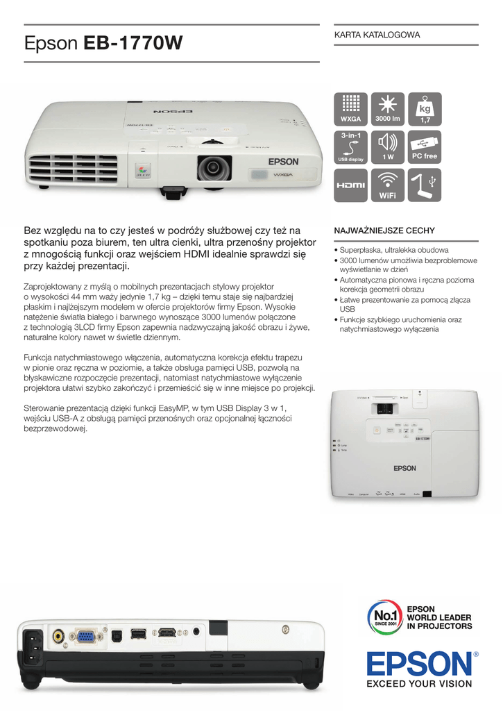 Epson EB-1770W KARTA KATALOGOWA 3000 lm Bez względu na to czy jesteś w podróży służbowej czy też na spotkaniu poza biurem, ten ultra cienki, ultra przenośny projektor z mnogością funkcji oraz wejściem HDMI idealnie sprawdzi się przy każdej prezentacji. Zaprojektowany z myślą o mobilnych prezentacjach stylowy projektor o wysokości 44 mm waży jedynie 1,7 kg – dzięki temu staje się najbardziej płaskim i najlżejszym modelem w ofercie projektorów firmy Epson. Wysokie natężenie światła białego i barwnego wynoszące 3000 lumenów połączone z technologią 3LCD firmy Epson zapewnia nadzwyczajną jakość obrazu i żywe, naturalne kolory nawet w świetle dziennym. Funkcja natychmiastowego włączenia, automatyczna korekcja efektu trapezu w pionie oraz ręczna w poziomie, a także obsługa pamięci USB, pozwolą na błyskawiczne rozpoczęcie prezentacji, natomiast natychmiastowe wyłączenie projektora ułatwi szybko zakończyć i przemieścić się w inne miejsce po projekcji. Sterowanie prezentacją dzięki funkcji EasyMP, w tym USB Display 3 w 1, wejściu USB-A z obsługą pamięci przenośnych oraz opcjonalnej łączności bezprzewodowej. 1,7 NAJWAŻNIEJSZE CECHY • Superpłaska, ultralekka obudowa • 3000 lumenów umożliwia bezproblemowe wyświetlanie w dzień • Automatyczna pionowa i ręczna pozioma korekcja geometrii obrazu • Łatwe prezentowanie za pomocą złącza USB • Funkcje szybkiego uruchomienia oraz natychmiastowego wyłączenia Epson EB-1770W DANE TECHNICZNE PRODUKTU TECHNOLOGIA PROJEKCJI Technologia 3LCD 0,59 cala z MLA ROZDZIELCZOŚĆ WXGA – 1280 x 800 (format obrazu 16:10) Do 1080p NATĘŻENIE ŚWIATŁA BIAŁEGO* Tryb zwykły/oszczędzania energii 3000/1700 lumenów NATĘŻENIE ŚWIATŁA BARWNEGO* Tryb zwykły/oszczędzania energii 3000/1700 lumenów KONTRAST 2000:1 ROZMIAR EKRANU od 30 cali do 300 cali ODLEGŁOŚĆ PROJEKCJI 60-calowy obraz z odległości 1,35 – 1,62 m WSPÓŁCZYNNIK RZUTU 1,04 – 1,26 WSPÓŁCZYNNIK POWIĘKSZENIA Optyczny, x 1,2 KOREKCJA GEOMETRII OBRAZU Automatyczna pionowa ±30°, ręczna pozioma ±30° TYP OBIEKTYWU Przysłona Ogniskowa Przesunięcie Ostrość 1,58 – 1,7 13,52–16,22 mm 10:1 Ręczne LAMPA Żywotność (tryb normalny/ekonomiczny) Rodzaj 4000/4000 godzin 230 W UHE MOŻLIWOŚCI POŁĄCZEŃ Wejście wideo Wejście audio Wejście cyfrowe Wejście komputerowe Wejście kontrolne Wejście pamięci USB Wejście na wizualizer Epson Połączenie bezprzewodowe FUNKCJE ZAAWANSOWANE Zabezpieczenia Obsługa Ekran JĘZYKI 1 x RCA, 1 x HDMI, 1 x component (przez D-sub 15-stykowe) 1 x Stereo mini jack, 1 x HDMI 1 x HDMI 1 x D-sub 15-stykowe (RGB), 1 x USB 2.0 typ B 1 x USB 2.0 typu B 1 x USB 2.0 typu A Zgodne z ELPDC06 1 x opcjonalny moduł bezprzewodowy (ELPAP07), 1 x opcjonalne szybkie połączenie bezprzewodowe (ELPAP08) Otwór blokady Kensington, ochrona hasłem Bezpośrednie włączanie/wyłączenie zasilania, natychmiastowe wyłączenie, szybkie włączanie, wyświetlacz USB 3 w 1 (Windows i Mac), funkcja EasyMP PC Free, funkcja Easy MP Network Projection, wyciszenie obrazu/dźwięku 9 trybów kolorów angielski/francuski/niemiecki/włoski/hiszpański/holenderski/portugalski/rosyjski/ szwedzki/norweski/fiński/duński/bułgarski/polski/węgierski/czeski/słowacki/rumuński/ chorwacki/słoweński/ ukraiński/kataloński/grecki/turecki/arabski/hebrajski/hindi/ japoński/uproszczony chiński/tradycyjny chiński/koreański/tajski/indonezyjski/ malajski/wietnamski POZIOM HAŁASU Tryb zwykły/oszczędzania energii 40/30 dB DŹWIĘK 1 x 1 W MASA 1,7 kg WYMIARY (szer. x gł. x wys.) 210 x 292 x 44 mm POBÓR MOCY Tryb zwykły/oszczędzania energii Stan gotowości 304/203 W 0,4 W GWARANCJA** 3 lata na projektor, 1 rok na lampę EB-1770W_ds_1PL_10/10 * Miara oparta na normie ISO 21118 ** Oferty gwarancyjne nie są dostępne we wszystkich krajach. Prosimy o kontakt sie z lokalnym przedstawicielem firmy Epson. Znaki towarowe oraz zastrzeżone znaki towarowe są własnością firmy Seiko Epson Corporation lub odpowiednich firm. Informacje o produkcie mogą ulec zmianie bez uprzedzenia. ZAWARTOŚĆ OPAKOWANIA • Projektor • Przewód zasilający 3 m • Kabel komputerowy 1,8 m • Kabel USB • Pilot z bateriami • Torba • Pakiet oprogramowania • Naklejka ochrony hasłem • Instrukcja obsługi AKCESORIA OPCJONALNE • Zapasowa lampa V13H010L65 (ELPLP65) • Filtr powietrza V13H134A31 (ELPAF31) • 80-calowy przenośny ekran V12H002S21 (ELPSC21) • 80-calowy składany ekran V12H002S24 (ELPSC24) • Ekran z możliwością zmiany proporcji 65/74/80 cali V13H003S26 (ELPSC26) • Płyta montażowa V12H003D01 (ELPPT01) • Uchwyt sufitowy V12H003B23 (ELPMB23) • Rura dystansowa 450 mm V12H003P13 (ELPFP13) • Rura dystansowa 700 mm V12H003P14 (ELPFP14) • Wizualizer Epson V12H321003 (ELPDC06) • Moduł bezprzewodowy V12H418P13 (ELPAP07) • Klucz USB do szybkiego połączenia bezprzewodowego V12H005M08 (ELPAP08)
