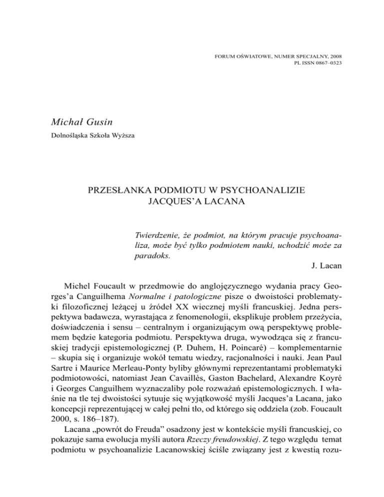 FORUM OŚWIATOWE, numer specjalny, 2008 PL ISSN 0867–0323 Michał Gusin Dolnośląska Szkoła Wyższa Przesłanka podmiotu w psychoanalizie Jacques’a Lacana Twierdzenie, że podmiot, na którym pracuje psychoanaliza, może być tylko podmiotem nauki, uchodzić może za paradoks. J. Lacan Michel Foucault w przedmowie do anglojęzycznego wydania pracy Georges’a Canguilhema Normalne i patologiczne pisze o dwoistości problematyki filozoficznej leżącej u źródeł XX wiecznej myśli francuskiej. Jedna perspektywa badawcza, wyrastająca z fenomenologii, eksplikuje problem przeżycia, doświadczenia i sensu – centralnym i organizującym ową perspektywę problemem będzie kategoria podmiotu. Perspektywa druga, wywodząca się z francuskiej tradycji epistemologicznej (P. Duhem, H. Poincaré) – komplementarnie – skupia się i organizuje wokół tematu wiedzy, racjonalności i nauki. Jean Paul Sartre i Maurice Merleau-Ponty byliby głównymi reprezentantami problematyki podmiotowości, natomiast Jean Cavaillès, Gaston Bachelard, Alexandre Koyré i Georges Canguilhem wyznaczaliby pole rozważań epistemologicznych. I właśnie na tle tej dwoistości sytuuje się wyjątkowość myśli Jacques’a Lacana, jako koncepcji reprezentującej w całej pełni tło, od którego się oddziela (zob. Foucault 2000, s. 186–187). Lacana „powrót do Freuda” osadzony jest w kontekście myśli francuskiej, co pokazuje sama ewolucja myśli autora Rzeczy freudowskiej. Z tego względu temat podmiotu w psychoanalizie Lacanowskiej ściśle związany jest z kwestią rozu- 198 Michał Gusin mienia naukowości psychoanalizy. Można by prześledzić różne modele podmiotu w porządku diachronicznym (od stadium zwierciadła, przez koncepcję „podmiotu podzielonego” i „podmiotu przypuszczalnej wiedzy”, po podmiot syntomu), jednak byłaby to praca wielokrotnie przekraczająca dopuszczalne rozmiary artykułu. Ograniczę się przeto do kwestii ujęcia podmiotu od strony epistemologicznej. Pominę cały psychoanalityczny wkład (koncepcję pragnienia, mowy, jouissance) w problematykę podmiotowości, aby pokazać znaczenie Lacanowskiej operacji „unaukowienia” psychoanalizy. Operacja ta oczywiście była rozciągnięta w czasie i przebiegała na kilku poziomach. W niniejszym artykule omawiam tylko jeden jej aspekt, związany ze strukturalizmem jako specyficzną próbą syntezy wspomnianych na wstępie perspektyw badawczych. Jakkolwiek by oceniać dwudziestowieczne refutacje pojęcia podmiotu, jedno jest pewne: współczesne horyzonty myślenia o podmiocie zostają ustanowione o kartezjańską przesłankę ego cogito, a jest to sprawa o tyle ważna, że z tą przesłanką związana jest nowożytna koncepcja nauki. Kartezjusz, poszukując ugruntowania wiedzy, w ramach której można byłoby posługiwać się kryterium oczywistości w dochodzeniu do prawdy (analiza jako metoda rozkładu całości na elementy pierwsze, których prawdziwość potwierdzona jest mocą oczywistości – stąd aksjomatyka), dochodzi do argumentu, którego nie może podważyć argument demona-zwodziciela: ego cogito ego sum. Oto więc otwiera się droga odzyskiwania zawieszonej wiedzy, ale opartej tym razem na niepodważalnej pewności. Logika Medytacji o pierwszej filozofii pokazuje, że pewność ego cogito ostatecznie uwarunkowana jest przez istnienie Boga, a dokładniej jeszcze przez zawartą w tymże akcie cogito ideę nieskończoności. Tym bardziej pojawiające się określenie podmiotu jest jakościowe: podmiot jest rzeczą myślącą a to oznacza, że „wątpi, pojmuje, twierdzi, przeczy, chce, nie chce, a także wyobraża sobie i czuje” (Descartes 2001, s. 51). Określenie to – jakby uczynione zbyt pospiesznie, na co zwracać będzie uwagę dwudziestowieczna filozofia od Husserla po Derridę – zapoznaje, a przynajmniej zasłania, sposób rozumowania w tym ustanowieniu pewności podmiotu z wątpienia obecny. Mianowicie myśl niezależnie od swej treści, od postaci jaką przybiera, formy i wyrazu jest samym momentem i podstawą ustanowienia1 – podmiot zostaje ustanowiony przez myśl pozbawioną jakości. Jednocześnie w takim ustanowieniu nie występuje samozwrotność, tzn. fundującą cechą ego cogito nie jest dyspozycja świadomości do samo-ujmowania, do tego, że sama może stać się swoim przedmiotem, krótko mówiąc – dyspozycja samoświadomości. Rzecz jasna, kartezjański podmiot ta1 Wokół tej kwestii krąży także po wielokroć już opisywane „starcie” Derrida – Foucault na temat ekskluzji szaleństwa także z dyskursu siedemnastowiecznej nauki kartezjańskim gestem. Przesłanka podmiotu w psychoanalizie Jacques’a Lacana 199 kiej dyspozycji nie wyklucza (u Kanta, reprezentującego już uformowane pojęcie podmiotu, mamy transcendentalną jedność apercepcji), ale też nie jest ona fundamentalna. Charakter podstawy podmiotowości samoświadomość uzyskuje dopiero za sprawą Leibniza2. Jeśli uznać, jak powszechnie się to czyni, że model (empirycznej) nauki nowożytnej wypracowany zostaje za sprawą zerwania z jakościowym myśleniem odziedziczonym po Arystotelesie i transmitowanym przez tradycję scholastyczną, zaś pozytywnie – dzięki cudownemu użyciu matematyki, która z punktu widzenia greckiej episteme w żaden sposób nie mogła odnosić się do zmiennego świata empirycznego, to widać, jakie znaczenie odgrywa kartezjański podmiot jako podmiot nauki. Po pierwsze: nauka nowożytna aby się ukonstytuować, odciąć się musi od myśli antycznej. Po drugie, wzorcem dla niej będzie metoda Galileusza, a więc matematyzacja opisywanego obiektu czy zjawiska. Po trzecie, istotą matematyzacji jest to, iż dzięki niej można abstrahować od wszelkich jakości zmysłowych, które towarzyszą badanym obiektom. Podmiot kartezjański byłby więc efektem tej samej logiki, która doprowadziła w wieku XVII do wyłonienia się koncepcji nowożytnej nauki – koncepcji oczywiśc