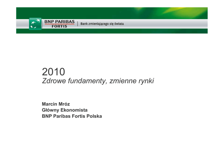 2010 Zdrowe fundamenty, zmienne rynki Marcin Mróz Główny Ekonomista BNP Paribas Fortis Polska Na początku roku prognozy rynkowe mocno wskazywały na lepsze wyniki polskiej gospodarki, ale… Prognozy rynkowe wg agencji Reuters (styczeń 2010) 2009 PKB: 1.7%..... 2010 PKB: 2.6% (1.9%-3.5%) CPI: 3.5%.......... Inflacja: 2.4% (1.8%-3.0%) Pomimo całkiem dobrych fundamentów prognozy rynkowe są mocno zróŜnicowane. W styczniu prognozy dla EUR/PLN na koniec roku wahały się pomiędzy 3.30 a 4.15. (*) (*) wg agencji Bloomberg. Fortis Bank Polska SA | Grupa BNP Paribas | 2 Polska 2010: DuŜo zalet i tylko jedna wada. + - mocne fundamenty: wciąŜ lider wzrostu - mocna sytuacja płatnicza - problemy fiskalne mniej straszne niŜ się spodziewano PKB: 3.0+% Inflacja: 2.2% BOB: -2.5% PKB - krajowe rynki finansowe nie kierują się sytuacją fundamentalną lecz sentymentem globalnym Prognozy BNP Paribas Fortis Fortis Bank Polska SA | Grupa BNP Paribas | 3 2009 – pierwsza recesja od II WŚ, a na rynkach hossa W 2009 rynki finansowe zaczęły mocno odrabiać straty [roczna zmiana] Styczniowe nastroje rynkowe – bezkryzysowy optymizm Zgodnie z badaniami ankietowymi przeprowadzonymi wśród globalnych funduszy inwestycyjnych zarządzających aktywami wartymi 539 mld $ (*) w styczniu 2010: odsetek inwestorów oczekujących mocniejszych wyników gospodarczych pozostawał najwyŜszy od 2003 roku. apetyt na ryzyko wrócił do poziomów sprzed 2007 roku. zmniejszyła się alokacja w gotówkę i obligacje, rośnie natomiast zaangaŜowanie w akcje. PrzewaŜenie w akcjach deklarowało 52% ankietowanych co jest najwyŜszym poziomem od 2007 roku. Źródło: Bloomberg. akcje rynków wschodzących pozostają ulubieńcem inwestorów Fortis Bank Polska SA | Grupa BNP Paribas | 4 2010: globalne rynki finansowe – optymizm w obliczu ryzyk Globalna „strategia wyjścia” Problemy sektora finansowego Fiskalne problemy południa Europy Stabilność strefy euro Rynki finansowe okresowo są tak optymistyczne jak w normalnych czasach. A czasy wciąŜ nie są normalne. Bańka spekulacyjna Inne niespodzianki Fortis Bank Polska SA | Grupa BNP Paribas | 5 Wnioski: wyspa otoczona wzburzonym morzem? Krajowe fundamenty wyglądają całkiem dobrze, ryzyka krajowe są ograniczone - Główne ryzyka dla polskiej gospodarki pochodzą natomiast ze strony międzynarodowych rynków finansowych i (potencjalnie) ze strony zmiany scenariusza fundamentalnego dla gospodarki światowej. - Czyli… - … pod względem gospodarczym czeka nas całkiem niezły rok lecz okresowe zawirowania rynkowe wciąŜ pozostają istotnym czynnikiem ryzyka Fortis Bank Polska SA | Grupa BNP Paribas | 6