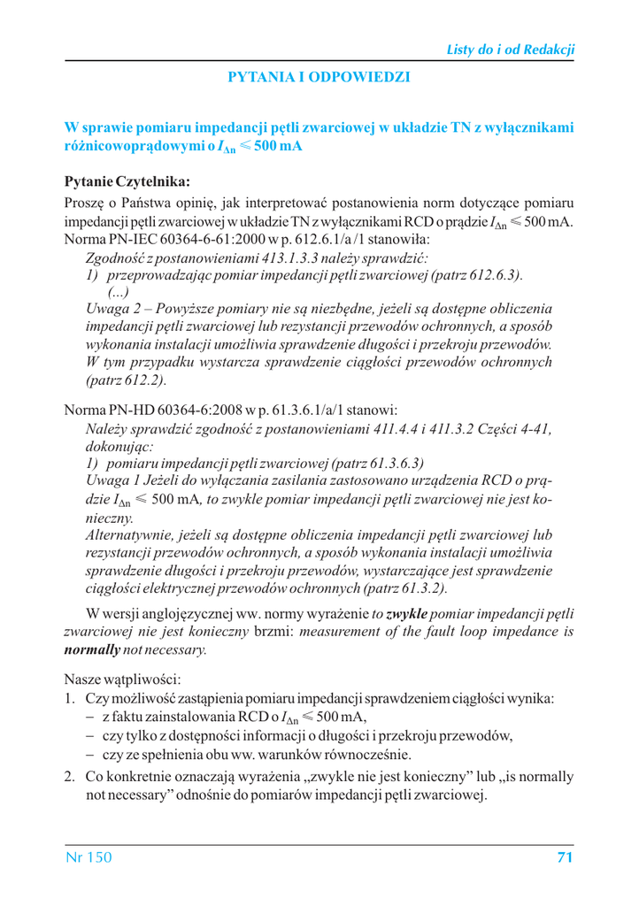 Listy do i od Redakcji PYTANIA I ODPOWIEDZI W sprawie pomiaru impedancji pętli zwarciowej w układzie TN z wyłącznikami różnicowoprądowymi o IΔn ≤ 500 mA Pytanie Czytelnika: Proszę o Państwa opinię, jak interpretować postanowienia norm dotyczące pomiaru impedancji pętli zwarciowej w układzie TN z wyłącznikami RCD o prądzie IΔn ≤500 mA. Norma PN-IEC 60364-6-61:2000 w p. 612.6.1/a /1 stanowiła: Zgodność z postanowieniami 413.1.3.3 należy sprawdzić: 1) przeprowadzając pomiar impedancji pętli zwarciowej (patrz 612.6.3). (...) Uwaga 2 – Powyższe pomiary nie są niezbędne, jeżeli są dostępne obliczenia impedancji pętli zwarciowej lub rezystancji przewodów ochronnych, a sposób wykonania instalacji umożliwia sprawdzenie długości i przekroju przewodów. W tym przypadku wystarcza sprawdzenie ciągłości przewodów ochronnych (patrz 612.2). Norma PN-HD 60364-6:2008 w p. 61.3.6.1/a/1 stanowi: Należy sprawdzić zgodność z postanowieniami 411.4.4 i 411.3.2 Części 4-41, dokonując: 1) pomiaru impedancji pętli zwarciowej (patrz 61.3.6.3) Uwaga 1 Jeżeli do wyłączania zasilania zastosowano urządzenia RCD o prądzie IΔn ≤ 500 mA, to zwykle pomiar impedancji pętli zwarciowej nie jest konieczny. Alternatywnie, jeżeli są dostępne obliczenia impedancji pętli zwarciowej lub rezystancji przewodów ochronnych, a sposób wykonania instalacji umożliwia sprawdzenie długości i przekroju przewodów, wystarczające jest sprawdzenie ciągłości elektrycznej przewodów ochronnych (patrz 61.3.2). W wersji anglojęzycznej ww. normy wyrażenie to zwykle pomiar impedancji pętli zwarciowej nie jest konieczny brzmi: measurement of the fault loop impedance is normally not necessary. Nasze wątpliwości: 1. Czy możliwość zastąpienia pomiaru impedancji sprawdzeniem ciągłości wynika: z faktu zainstalowania RCD o IΔn ≤ 500 mA, czy tylko z dostępności informacji o długości i przekroju przewodów, czy ze spełnienia obu ww. warunków równocześnie. 2. Co konkretnie oznaczają wyrażenia „zwykle nie jest konieczny” lub „is normally not necessary” odnośnie do pomiarów impedancji pętli zwarciowej. Nr 150 71 Listy do i od Redakcji Odpowiedź: Warunek skuteczności ochrony przez samoczynne wyłączanie zasilania w układzie TN jest określony zależnością (1) gdzie: Ia – prąd wyłączający zabezpieczenia [A], Uo – znamionowe napięcie względem ziemi [V], Zs – impedancja pętli zwarciowej [W ]. Prąd wyłączający zależy od typu wyłącznika różnicowo-prądowego i określonego przez normę [2] największego dopuszczalnego czasu wyłączania zasilania (tablica 1). Tablica 1. Prąd wyłączający Ia wyłączników różnicowoprądowych [1] w zależności od największego dopuszczalnego czasu wyłączania zasilania podanego w normie [2] Czas Prąd wyłączający Ia wyłączników różnicowoprądowych wyłączania bezzwłocznych i krótkozwłocznych selektywnych [s] AC 0,2 0,4 5 2ID n ID n ID n A (30 mA) 4ID n 2ID n 2ID n B AC A B 4ID 2ID 2,8ID 4ID n n n n 2ID 2ID 2,8ID 4ID n n n n 2ID ID 1,4ID 2ID n n n n Jeżeli przyjąć, że największy dopuszczalny czas wyłączania zasilania jest równy 0,4 s, a napięcie Uo = 230 V, to dla przykładowych wyłączników typu AC dopuszcza się wartości impedancji pętli zwarciowej Zs podane w tablicy 2. Tablica 2. Największa dopuszczalna wartość impedancji pętli zwarciowej w układzie TN w zależności od znamionowego prądu różnicowego zadziałania wyłącznika różnicowoprądowego typu AC. Czas wyłączania t ≤ 0,4 s Wyłącznik różnicowoprądowy typu AC o IΔn 30 mA 100 mA 300 mA 500 mA Największa dopuszczalna impedancja pętli zwarciowej Zs 7666 Ω bezzwłoczny i krótkozwłoczny 2300 Ω 766 Ω 460 Ω zwłoczny Największa dopuszczalna impedancja pętli zwarciowej Zs –* 1150 Ω 383 Ω 230 Ω * Nie ma wyłączników różnicowoprądowych zwłocznych o IΔn = 30 mA. Zatem największa dopuszczalna impedancja pętli zwarciowej jest rzędu setek, a dla najpowszechniej stosowanych wyłączników różnicowoprądowych o IΔn = 30 mA nawet tysięcy omów. Jeżeli jest zachowana ciągłość przewodów, to impedancja pętli zwarciowej nie przekracza kilku omów. Zachowanie ciągłości przewodów w obwodzie chronionym wyłącznikiem różnicowoprądowym o IΔn ≤ 500 mA zapewnia samoczynne wyłączanie zasilania przy zwarciu doziemnym. Nie ma konieczności wykonywania pomiaru impedancji pętli zwarciowej, ponieważ nieistotne jest to, czy impedancja ta ma wartość ułamka oma, dwóch czy trzech omów. Jeżeli zatem obwód jest chroniony wyłącznikiem różnicowoprądowym o IΔn ≤ 500 mA, to wystarczający 72 Listy do i od Redakcji jest pomiar ciągłości przewodów ochronnych. Nie jest też konieczne wykonywanie obliczeń impedancji pętli zwarciowej lub rezystancji przewodów ochronnych ani sprawdzanie długości i przekrojów przewodów. Odstępstwo o dopuszczalności zastąpienia pomiaru impedancji pętli zwarciowej sprawdzeniem ciągłości elektrycznej przewodów ochronnych dotyczy wszelkich obwodów spełniających podane w normie warunki (są dostępne obliczenia impedancji pętli zwarciowej lub rezystancji przewodów ochronnych, a sposób wykonania instalacji umożliwia sprawdzenie długości i przekroju przewodów) niezależnie od rodzaju zabezpieczenia dokonującego samoczynnego wyłączania zasilania (nadprądowe, różnicowoprądowe) i jego prądu wyłączającego. Pozwala na to zarówno norma PN-HD 60364-6:2008 [3], jak i wcześniejsze jej wydanie [4]. Wystarczy obliczeniowo potwierdzić, że impedancja pętli zwarciowej nie przekracza wartości dopuszczalnej lub że napięcia dotykowe nie przekraczają wartości dopuszczalnej długotrwale. Zachodzi jednak zasadnicza wątpliwość, czy to „ulgowe” postępowanie wynikające z dopuszczonego odstępstwa nie jest bardziej pracochłonne, a jego wynik mniej wiarygodny niż w przypadku tradycyjnego pomiaru impedancji pętli