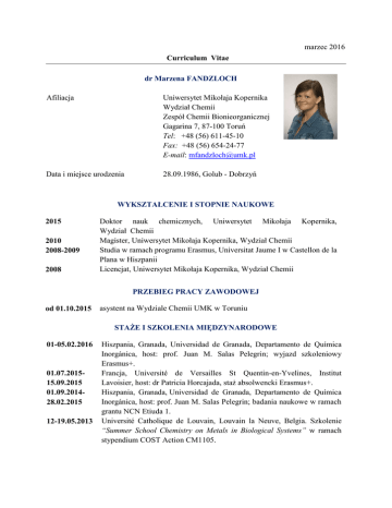 marzec 2016 Curriculum Vitae dr Marzena FANDZLOCH Afiliacja Uniwersytet Mikołaja Kopernika Wydział Chemii Zespół Chemii Bionieorganicznej Gagarina 7, 87-100 Toruń Tel: +48 (56) 611-45-10 Fax: +48 (56) 654-24-77 E-mail: [email protected] Data i miejsce urodzenia 28.09.1986, Golub - Dobrzyń WYKSZTAŁCENIE I STOPNIE NAUKOWE 2015 2010 2008-2009 2008 Doktor nauk chemicznych, Uniwersytet Mikołaja Kopernika, Wydział Chemii Magister, Uniwersytet Mikołaja Kopernika, Wydział Chemii Studia w ramach programu Erasmus, Universitat Jaume I w Castellon de la Plana w Hiszpanii Licencjat, Uniwersytet Mikołaja Kopernika, Wydział Chemii PRZEBIEG PRACY ZAWODOWEJ od 01.10.2015 asystent na Wydziale Chemii UMK w Toruniu STAŻE I SZKOLENIA MIĘDZYNARODOWE 01-05.02.2016 01.07.201515.09.2015 01.09.201428.02.2015 12-19.05.2013 Hiszpania, Granada, Universidad de Granada, Departamento de Química Inorgánica, host: prof. Juan M. Salas Pelegrin; wyjazd szkoleniowy Erasmus+. Francja, Université de Versailles St Quentin-en-Yvelines, Institut Lavoisier, host: dr Patricia Horcajada, staż absolwencki Erasmus+. Hiszpania, Granada, Universidad de Granada, Departamento de Química Inorgánica, host: prof. Juan M. Salas Pelegrin; badania naukowe w ramach grantu NCN Etiuda 1. Université Catholique de Louvain, Louvain la Neuve, Belgia. Szkolenie “Summer School Chemistry on Metals in Biological Systems” w ramach stypendium COST Action CM1105. STAŻE KRAJOWE 05-30.11.2012 05-30.11.2012 Instytut Immunologii i Terapii Doświadczalnej im. Ludwika Hirszfelda, Polska Akademia Nauk we Wrocławiu. Staż w Laboratorium Doświadczalnej Terapii Przeciwnowotworowej pod opieką dr hab. Joanny Wietrzyk, prof. PAN. Uniwersytet Wrocławski, Wydział Chemii. Staż naukowy w zespole Zastosowań strukturalnych EPR pod opieką prof. dr hab. Julii Jezierskiej. REALIZOWANE PROJEKTY BADAWCZE Uczelniane 2015 2013 2012 2011 Grant Młodych Dziekana Wydziału Chemii UMK (2360/Ch) na realizację projektu: “Synteza i charakterystyka strukturalna nowych kompleksów Ru(II) z pochodnymi triazolopirymidyn”, kierownik projektu. Grant Młodych Dziekana Wydziału Chemii UMK (1500/Ch) na realizację projektu: “Nowe mono- i didonorowe kompleksy Ru(II) z wybranymi triazolopirymidynami. Badanie wpływu struktury nowych kompleksów na cytotoksyczność in vitro”, kierownik projektu. Grant Młodych Dziekana Wydziału Chemii UMK (1111/Ch) na realizację projektu pt.: “Synteza i analiza strukturalna związków rutenu(III) o potencjalnych właściwościach cytotoksycznych”, kierownik projektu. Grant Dziekana Wydziału Chemii UMK (14/2011) na realizację projektu: “Synteza, badania strukturalne i cytotoksyczne in vitro nowych kompleksów rutenu(III) z 5,7-ditertbutylo-1,2,4-triazolo[1,5-a]pirymidyną”, kierownik projektu. Narodowego Centrum Nauki (NCN) 2013-2014 2011-2014 Grant Narodowego Centrum Nauki w konkursie ETIUDA 1 (2013/08/T/ST5/00391) na realizację projektu: “Poszukiwanie nowych związków koordynacyjnych rutenu z triazolopirymidynami o potencjalnych właściwościach cytotoksycznych”, kierownik projektu. Grant Narodowego Centrum Nauki w konkursie PRELUDIUM 1 (2011/01/N/ST5/02535) na realizację projektu: “Synteza, badania strukturalne i cytotoksyczne in vitro nowych związków koordynacyjnych rutenu z modyfikowanymi ligandami purynowymi”, kierownik projektu. WYRÓŻNIENIA WYNIKAJĄCE Z PROWADZENIA BADAŃ NAUKOWYCH Wyróżnienia międzynarodowe 2013 2012 2010 Stypendium w ramach European Cooperation in Science and Technology COST Action CM1105 “Functional metal complexes that bind to biomolecules” na pokrycie kosztów uczestnictwa w Summer School Chemistry on Metals in Biological Systems w Louvain la Neuve/Belgia. Grant konferencyjny Student's Bursary przyznany przez Organizatorów (Prof. Eugenio Coronado, prof. Santiago Alvarez) 40th International Conference on Coordination Chemistry (ICCC40) dla najlepszych 32 doktorantów z całego świata. Grant konferencyjny przyznany przez Organizatorów (prof. Jorge A. Rodriguez Navarro) na pokrycie kosztów uczestnictwa w 5th EuCheMS Conference on NITROGEN LIGANDS in Coordination Chemistry, Metalorganic Chemistry, Bioinorganic Chemistry, Materials & Catalysis. Wyróżnienia krajowe 2012 2012 2012 2011 Wyróżnienie w konkursie na najlepszy komunikat naukowy “Kompleksy rutenu nowym rozwiązaniem farmakologicznym w zwalczaniu chorób nowotworowych” wygłoszony na VI Kopernikańskim Seminarium Doktoranckim. Stypendium Marszałka Województwa Kujawsko-Pomorskiego “Krok w przyszłość – stypendia dla doktorantów IV edycja”. Stypendium Ministra Nauki i Szkolnictwa Wyższego za wybitne osiągnięcia na rok akademicki 2012/2013 dla studentów i doktorantów. Stypendium konferencyjne Fundacji na Rzecz Nauki Polskiej na częściowe finansowanie wyjazdu na 5th EuCheMS Conference on NITROGEN LIGANDS in Coordination Chemistry, Metal-organic Chemistry, Bioinorganic Chemistry, Materials & Catalysis, Granada (Hiszpania). Wyróżnienia uczelniane 2015 2015 2012-2014 2012-2014 2013 Zespołowe wyróżnienie Rektora UMK za osiągnięcia uzyskane w dziedzinie naukowo-badawczej w 2014 roku. Wyróżnienie uchwałą Rady Wydziału Chemii UMK rozprawy doktorskiej pt.: „Poszukiwanie nowych związków koordynacyjnych rutenu z triazolopirymidynami o potencjalnych właściwościach cytotoksycznych”. Stypendium projakościowe - zwiększenie stypendium doktoranckiego dla 30 % najlepszych doktorantów UMK z dotacji podmiotowej na dofinansowanie zadań projakościowych. Stypendium naukowe dla najlepszych doktorantów UMK. Zespołowe wyróżnienie Rektora UMK za osiągnięcia uzyskane w dziedzinie naukowo-badawczej w 2012 roku. 2012 2010 Zespołowa Nagroda Rektora UMK III stopnia za osiągnięcia uzyskane w dziedzinie naukowo-badawczej w 2011 roku. I miejsce i tytuł najlepszej pracy magisterskiej na Wydziale Chemii UMK. Nagrodę ufundował Zarząd Oddziału Stowarzyszenia Inżynierów i Techni