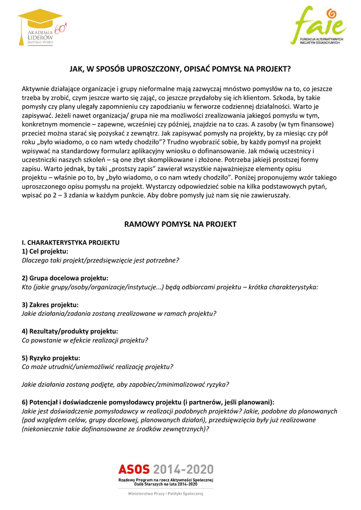 JAK, W SPOSÓB UPROSZCZONY, OPISAĆ POMYSŁ NA PROJEKT? Aktywnie działające organizacje i grupy nieformalne mają zazwyczaj mnóstwo pomysłów na to, co jeszcze trzeba by zrobić, czym jeszcze warto się zająć, co jeszcze przydałoby się ich klientom. Szkoda, by takie pomysły czy plany ulegały zapomnieniu czy zapodzianiu w ferworze codziennej działalności. Warto je zapisywać. Jeżeli nawet organizacja/ grupa nie ma możliwości zrealizowania jakiegoś pomysłu w tym, konkretnym momencie – zapewne, wcześniej czy później, znajdzie na to czas. A zasoby (w tym finansowe) przecież można starać się pozyskać z zewnątrz. Jak zapisywać pomysły na projekty, by za miesiąc czy pół roku „było wiadomo, o co nam wtedy chodziło”? Trudno wyobrazić sobie, by każdy pomysł na projekt wpisywać na standardowy formularz aplikacyjny wniosku o dofinansowanie. Jak mówią uczestnicy i uczestniczki naszych szkoleń – są one zbyt skomplikowane i złożone. Potrzeba jakiejś prostszej formy zapisu. Warto jednak, by taki „prostszy zapis” zawierał wszystkie najważniejsze elementy opisu projektu – właśnie po to, by „było wiadomo, o co nam wtedy chodziło”. Poniżej proponujemy wzór takiego uproszczonego opisu pomysłu na projekt. Wystarczy odpowiedzieć sobie na kilka podstawowych pytań, wpisać po 2 – 3 zdania w każdym punkcie. Aby dobre pomysły już nam się nie zawieruszały. RAMOWY POMYSŁ NA PROJEKT I. CHARAKTERYSTYKA PROJEKTU 1) Cel projektu: Dlaczego taki projekt/przedsięwzięcie jest potrzebne? 2) Grupa docelowa projektu: Kto (jakie grupy/osoby/organizacje/instytucje...) będą odbiorcami projektu – krótka charakterystyka: 3) Zakres projektu: Jakie działania/zadania zostaną zrealizowane w ramach projektu? 4) Rezultaty/produkty projektu: Co powstanie w efekcie realizacji projektu? 5) Ryzyko projektu: Co może utrudnić/uniemożliwić realizację projektu? Jakie działania zostaną podjęte, aby zapobiec/zminimalizować ryzyka? 6) Potencjał i doświadczenie pomysłodawcy projektu (i partnerów, jeśli planowani): Jakie jest doświadczenie pomysłodawcy w realizacji podobnych projektów? Jakie, podobne do planowanych (pod względem celów, grupy docelowej, planowanych działań), przedsięwzięcia były już realizowane (niekoniecznie takie dofinansowane ze środków zewnętrznych)? Jakimi zasobami (ludzkimi, organizacyjnymi, materialnymi, innymi) dysponuje/może dysponować organizacja by zrealizować projekt? 7) Sposób zarządzania projektem: Kadra: Zaplecze techniczne: 7) Sposób ewaluacji projektu: Po czym będzie można poznać, że projekt się udał? Kto i kiedy dokona takiej oceny? II. BUDŻET 1) Koszty bezpośrednie* – związane z merytoryczną realizacją projektu: ………………………….. 2) Koszty administracyjne* (koszt zarządzania, księgowości, materiałów biurowych, telefonu i wykorzystania innych urządzeń...): ……………………………………………. 3) 3) Koszty promocji projektu*: ………………………………….. * brutto brutto – czyli z VAT lub zawierające wszystkie składki pracownicze Planowany budżet projektu łącznie: ………………………………. III. HARMONOGRAM Przez jaki okres czasu będzie realizowany projekt (6 miesięcy/ 1 rok/ 2 lata…)? Jakie są etapy realizacji projektu? Krótki opis zawartości poszczególnych etapów + orientacyjny czas trwania etapu (np. miesiąc/ 2 miesiące…) IV. Zgodność propozycji ze specjalizacją/celami działania organizacji (statut): W jaki sposób proponowany projekt przyczyni się do realizacji celów statutowych organizacji? V. Projekt a strategia rozwoju organizacji: W jaki sposób pomysł na projekt wpisuje się w strategię rozwoju organizacji? Jak może się przyczynić do rozwoju organizacji? Opracowanie: Agnieszka Dadak Fundacja Alternatywnych Inicjatyw Edukacyjnych Bielsko-Biała, 2015