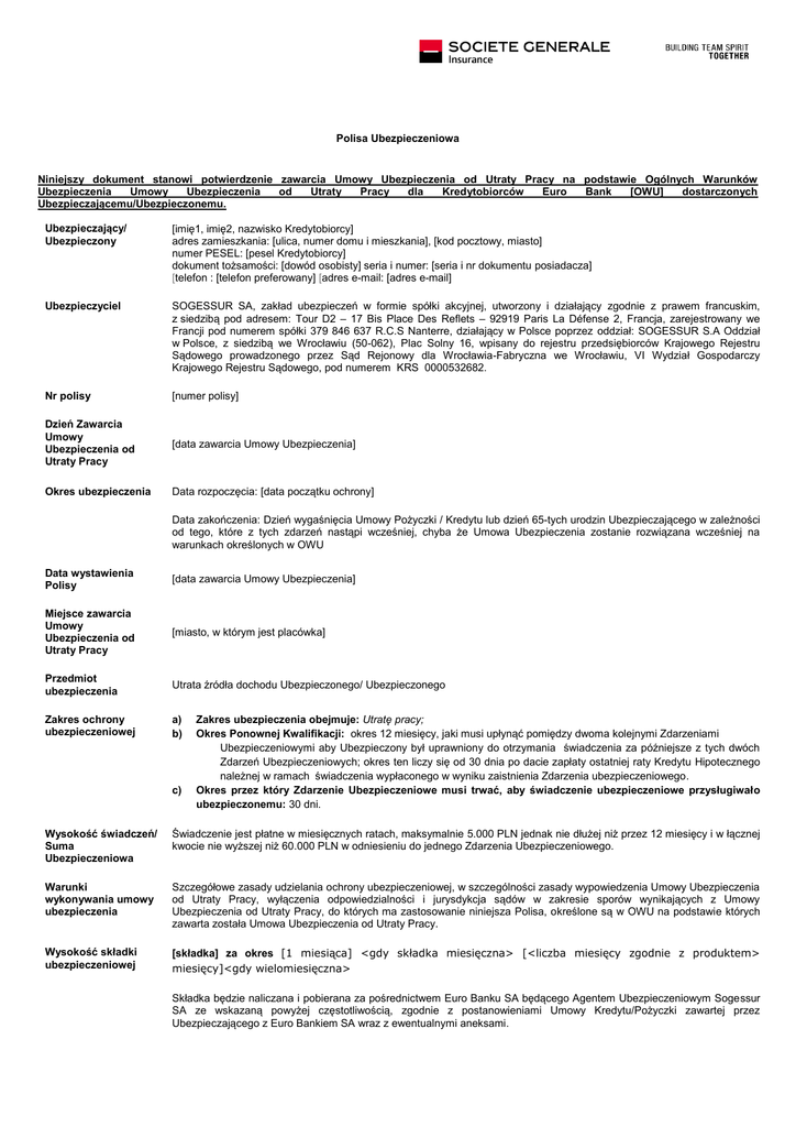 Polisa Ubezpieczeniowa Niniejszy dokument stanowi potwierdzenie zawarcia Umowy Ubezpieczenia od Utraty Pracy na podstawie Ogólnych Warunków Ubezpieczenia Umowy Ubezpieczenia od Utraty Pracy dla Kredytobiorców Euro Bank [OWU] dostarczonych Ubezpieczającemu/Ubezpieczonemu. Ubezpieczający/ Ubezpieczony [imię1, imię2, nazwisko Kredytobiorcy] adres zamieszkania: [ulica, numer domu i mieszkania], [kod pocztowy, miasto] numer PESEL: [pesel Kredytobiorcy] dokument tożsamości: [dowód osobisty] seria i numer: [seria i nr dokumentu posiadacza] [telefon : [telefon preferowany] [adres e-mail: [adres e-mail] Ubezpieczyciel SOGESSUR SA, zakład ubezpieczeń w formie spółki akcyjnej, utworzony i działający zgodnie z prawem francuskim, z siedzibą pod adresem: Tour D2 – 17 Bis Place Des Reflets – 92919 Paris La Défense 2, Francja, zarejestrowany we Francji pod numerem spółki 379 846 637 R.C.S Nanterre, działający w Polsce poprzez oddział: SOGESSUR S.A Oddział w Polsce, z siedzibą we Wrocławiu (50-062), Plac Solny 16, wpisany do rejestru przedsiębiorców Krajowego Rejestru Sądowego prowadzonego przez Sąd Rejonowy dla Wrocławia-Fabryczna we Wrocławiu, VI Wydział Gospodarczy Krajowego Rejestru Sądowego, pod numerem KRS 0000532682. Nr polisy [numer polisy] Dzień Zawarcia Umowy Ubezpieczenia od Utraty Pracy [data zawarcia Umowy Ubezpieczenia] Okres ubezpieczenia Data rozpoczęcia: [data początku ochrony] Data zakończenia: Dzień wygaśnięcia Umowy Pożyczki / Kredytu lub dzień 65-tych urodzin Ubezpieczającego w zależności od tego, które z tych zdarzeń nastąpi wcześniej, chyba że Umowa Ubezpieczenia zostanie rozwiązana wcześniej na warunkach określonych w OWU Data wystawienia Polisy [data zawarcia Umowy Ubezpieczenia] Miejsce zawarcia Umowy Ubezpieczenia od Utraty Pracy [miasto, w którym jest placówka] Przedmiot ubezpieczenia Utrata źródła dochodu Ubezpieczonego/ Ubezpieczonego Zakres ochrony ubezpieczeniowej a) b) c) Zakres ubezpieczenia obejmuje: Utratę pracy; Okres Ponownej Kwalifikacji: okres 12 miesięcy, jaki musi upłynąć pomiędzy dwoma kolejnymi Zdarzeniami Ubezpieczeniowymi aby Ubezpieczony był uprawniony do otrzymania świadczenia za późniejsze z tych dwóch Zdarzeń Ubezpieczeniowych; okres ten liczy się od 30 dnia po dacie zapłaty ostatniej raty Kredytu Hipotecznego należnej w ramach świadczenia wypłaconego w wyniku zaistnienia Zdarzenia ubezpieczeniowego. Okres przez który Zdarzenie Ubezpieczeniowe musi trwać, aby świadczenie ubezpieczeniowe przysługiwało ubezpieczonemu: 30 dni. Wysokość świadczeń/ Suma Ubezpieczeniowa Świadczenie jest płatne w miesięcznych ratach, maksymalnie 5.000 PLN jednak nie dłużej niż przez 12 miesięcy i w łącznej kwocie nie wyższej niż 60.000 PLN w odniesieniu do jednego Zdarzenia Ubezpieczeniowego. Warunki wykonywania umowy ubezpieczenia Szczegółowe zasady udzielania ochrony ubezpieczeniowej, w szczególności zasady wypowiedzenia Umowy Ubezpieczenia od Utraty Pracy, wyłączenia odpowiedzialności i jurysdykcja sądów w zakresie sporów wynikających z Umowy Ubezpieczenia od Utraty Pracy, do których ma zastosowanie niniejsza Polisa, określone są w OWU na podstawie których zawarta została Umowa Ubezpieczenia od Utraty Pracy. Wysokość składki ubezpieczeniowej [składka] za okres [1 miesiąca] <gdy składka miesięczna> [<liczba miesięcy zgodnie z produktem> miesięcy]<gdy wielomiesięczna> Składka będzie naliczana i pobierana za pośrednictwem Euro Banku SA będącego Agentem Ubezpieczeniowym Sogessur SA ze wskazaną powyżej częstotliwością, zgodnie z postanowieniami Umowy Kredytu/Pożyczki zawartej przez Ubezpieczającego z Euro Bankiem SA wraz z ewentualnymi aneksami. -2- Właściwość sądu Powództwo o roszczenia wynikające z Umowy Ubezpieczenia od Utraty Pracy można wytoczyć albo według przepisów o właściwości ogólnej albo przed sąd właściwy dla miejsca zamieszkania lub siedziby Ubezpieczającego/Ubezpieczonego lub uprawnionego z Umowy Ubezpieczenia od Utraty Pracy. ………………………………………………………… (w imieniu of Sogessur SA) Niniejszym potwierdzam, że otrzymałem OWU przed zawarciem Umowy Ubezpieczenia. ______________________________________ Imię, nazwisko i podpis Ubezpieczającego/Ubezpieczonego ______ (data)