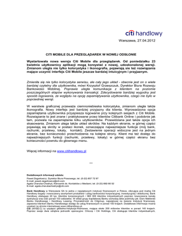 Warszawa, 27.04.2012 CITI MOBILE DLA PRZEGLĄDAREK W NOWEJ ODSŁONIE Wystartowała nowa wersja Citi Mobile dla przeglądarek. Od poniedziałku 23 kwietnia uŜytkownicy aplikacji mogą korzystać z nowej, udoskonalonej wersji. Zmianom uległa nie tylko kolorystyka i ikonografia, pojawiają sie teŜ rozwiązania mające uczynić interfejs Citi Mobile jeszcze bardziej intuicyjnym i przyjaznym. Zmieniła się nie tylko kolorystyka serwisu, ale cały jego układ - obecnie jest on o wiele bardziej czytelny dla uŜytkownika, mówi Krzysztof Grzeszczuk, Dyrektor Biura Rozwoju Bankowości Mobilnej. Poprawie uległa komunikacja z klientem na poziomie poszczególnych etapów wykonywania transakcji. Zdecydowanie bardziej wygodny jest sposób logowania, ze względu na opcję zapamiętywania uŜytkownika, czego nie było w poprzedniej wersji. W warstwie graficznej przewaŜa ciemnoniebieska kolorystyka, zmianom uległa takŜe ikonografia. Nowy interfejs jest bardziej przyjazny dla klienta. Wprowadzona opcja zapamiętania uŜytkownika przyspiesza logowanie przy kolejnych sesjach z Citi Mobile. Rozwiązanie to jest znane i praktykowane przez klientów Citibank Online i podobnie jak tam, pozwala na zapamiętanie kilku uŜytkowników. Przewidziana jest takŜe opcja ich skasowania. Zmianom ulega takŜe układ skrótów. Na kaŜdym ekranie, w górnej części pojawiają się skróty w postaci ikonek, oznaczające najwazniejsze funkcje (mój bank, rachunki, przelewy, lokaty, kontakt). Zestawienie operacji widoczne jest na jednym ekranie, bez konieczności przechodzenia na kolejne strony. Klient ma teŜ dostęp do najwaŜniejszych funkcji (rachunki, przelewy, lokaty) w górnej części ekranu bez konieczności powrotu do głownego menu. Więcej informacji na www.citihandlowy.pl *** Dodatkowych informacji udziela: Paweł Zegarłowicz, Dyrektor Biura Prasowego, tel. (0-22) 657 72 97 E-mail: [email protected] Agata Charuba-Chadryś, Kierownik ds. Kontaktów z Mediami, tel. (0-22) 692-90 52 E-mail: [email protected] Bank Handlowy w Warszawie SA to jedna z największych instytucji finansowych w Polsce, oferująca pod marką Citi Handlowy bogaty i nowoczesny asortyment produktów i usług bankowości korporacyjnej, inwestycyjnej i detalicznej. Bank Handlowy obsługuje 20 tys. klientów korporacyjnych i 965 000 klientów indywidualnych poprzez nowoczesne kanały dystrybucji oraz sieć ponad 153 oddziałów. W skład grupy kapitałowej Banku wchodzą takie podmioty jak: Dom Maklerski Banku Handlowego i Handlowy Leasing. PrzynaleŜność do Citigroup, największej na świecie instytucji finansowej, zapewnia klientom Banku Handlowego dostęp do usług finansowych w ponad 100 krajach. Dodatkowe informacje moŜna uzyskać na stronie internetowej www.citihandlowy.pl. Citi (NYSE:C) to wiodąca globalna instytucja finansowa, mająca około 200 milionów klientów w ponad 140 krajach. Poprzez swoje dwie odrębne jednostki operacyjne: Citicorp i Citi Holdings, Citi obsługuje klientów indywidualnych, korporacyjnych, rządowych i instytucjonalnych zapewniając im bogaty wachlarz produktów i usług finansowych w zakresie bankowości detalicznej, bankowości korporacyjnej i inwestycyjnej, usług maklerskich i zarządzania aktywami. Dodatkowe informacje moŜna uzyskać na stronie internetowej www.citigroup.com lub or www.citi.com.