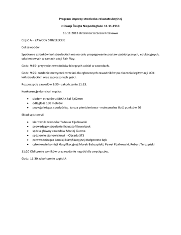 Program imprezy strzelecko-rekonstrukcyjnej z Okazji Święta Niepodległości 11.11.1918 16.11.2013 strzelnica Szczecin Krzekowo Część A – ZAWODY STRZELECKIE Cel zawodów Spotkanie członków kół strzeleckich ma na celu propagowanie postaw patriotycznych, edukacyjnych, szkoleniowych w ramach akcji Fair Play. Godz. 9:15- przybycie zawodników biorących udział w zawodach. Godz. 9:25- rozdanie metryczek strzelań dla zgłoszonych zawodników po okazaniu legitymacji LOKkół strzeleckich oraz zaproszonych gości. Rozpoczęcie zawodów 9:30 - zakończenie 11:15. Konkurencje damska i męska: siedem strzałów z KBKAK kal 7,62mm odległość 100 metrów pozycja leżąca z podpórką, tarcza pierścieniowa - maksymalna ilość punktów 50 Skład sędziowski kierownik zawodów Tadeusz Fijałkowski prowadzący strzelanie Krzysztof Kowalczyk sędzia główny zawodów Maciej Gucma sędziowie stanowiskowi - Obsada STS przewodnicząca komisji klasyfikacyjnej Małgorzata Bąk członkowie komisji klasyfikacyjnej Marek Babczyński, Paweł Fijałkowski, Robert Terczyński 11:20 Obliczenie wyników oraz rozdanie nagród dla zwycięzców. Godz. 11:30 zakończenie części A Część B –POKAZY I REKONSTRUKCJA „MY POLACY NASZ ORZEŁ BIAŁY A W RĘKU BIAŁO CZERWONA" Postawy patriotyczne to dominujące cechy działań kół strzeleckich w tym koła LOK Strzelec W celu kształtowania w nas cech wysoce patriotycznych opartych o przykłady wielkich Polaków w tym Marszałka Józefa Piłsudskiego, zarząd koła LOK Strzelec w porozumieniu z zarządem rejonowym LOK Szczecin oraz organizacjami patriotycznymi jak: Grupa „Borujsko" w dniu 16 Lis 2013r w godzinach 11:45-13:00 przeprowadzi inscenizację historyczną dla uświęcenia Dnia Niepodległości pod hasłem „Naród Józefowi Piłsudskiemu" w rocznice 95. Odzyskania Niepodległości. W imprezie organizatorzy mają zaszczyt gościć kombatantów walk o niepodległość Rzeczypospolitej oraz przedstawicieli Urzędu Marszałkowskiego woj. Zachodniopomorskiego, IPN, 12 Brygady Zmechanizowanej, Urzędu Miasta w Szczecinie, właściciela strzelnicy Delve GT Szczecin, grup „Grajcar", „Wiking" „STS". Pokaz historyczny przygotuje Borujsko - Grupa Rekonstrukcji Historycznej. Organizatorzy zapewniają bufet z gorącym posiłkiem. UWAGI 1. W przypadku opadów deszczu, śniegu, silnego wiatru lub mrozu impreza zostaje przeniesiona ze strzelnicy „Krzekowo" w Szczecinie na strzelnicę „Delve GT" przy ul. Czarneckiego w tych samych godzinach. Będziemy informować odpowiednio wcześniej. 2. Przypominam, że strzelnica „Krzekowo" znajduje się na zapleczu nowo wybudowanej hali sportowej przy ul. Szafera w Szczecinie. Dogodny dojazd autobusem przed skrzyżowaniem z rondem do ul. Szerokiej od ul. Wojska Polskiego. 3. Przywitanie naczelnika J. Piłsudskiego a następnie pokaz broni przygotuje Grupa Rekonstrukcji Historycznej „Borujsko" pod kierownictwem pana T. Sawickiego. 4. W przypadku przeniesienia zawodów do Delve GT odbędzie się strzelanie z pistoletu Glock 17 do tarczy pierścieniowej w ilości 5 sztuk na zawodnika. Maksymalna ocena 50 pkt. Pozycja stojąca. Do 9.11. proszę wpłacać składkę za imprezę - 20 zł. Osoby towarzyszące - 10 zł. Zaproszeni goście bezpłatnie. Zgłoszenia proszę kierować na e-mail [email protected] lub do prezesa KS Strzelec. Prosimy podawać imię nazwisko i nr telefonu.
