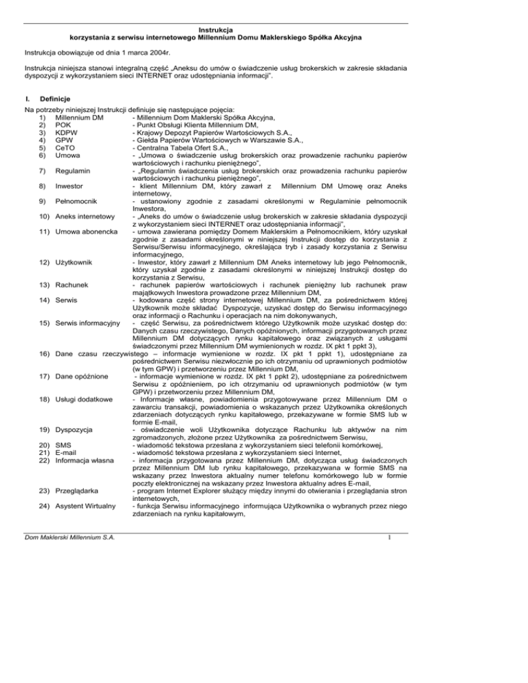 Instrukcja korzystania z serwisu internetowego Millennium Domu Maklerskiego Spółka Akcyjna Instrukcja obowiązuje od dnia 1 marca 2004r. Instrukcja niniejsza stanowi integralną część „Aneksu do umów o świadczenie usług brokerskich w zakresie składania dyspozycji z wykorzystaniem sieci INTERNET oraz udostępniania informacji”. I. Definicje Na potrzeby niniejszej Instrukcji definiuje się następujące pojęcia: 1) Millennium DM - Millennium Dom Maklerski Spółka Akcyjna, 2) POK - Punkt Obsługi Klienta Millennium DM, 3) KDPW - Krajowy Depozyt Papierów Wartościowych S.A., 4) GPW - Giełda Papierów Wartościowych w Warszawie S.A., 5) CeTO - Centralna Tabela Ofert S.A., 6) Umowa - „Umowa o świadczenie usług brokerskich oraz prowadzenie rachunku papierów wartościowych i rachunku pieniężnego”, 7) Regulamin - „Regulamin świadczenia usług brokerskich oraz prowadzenia rachunku papierów wartościowych i rachunku pieniężnego”, 8) Inwestor - klient Millennium DM, który zawarł z Millennium DM Umowę oraz Aneks internetowy, 9) Pełnomocnik - ustanowiony zgodnie z zasadami określonymi w Regulaminie pełnomocnik Inwestora, 10) Aneks internetowy - „Aneks do umów o świadczenie usług brokerskich w zakresie składania dyspozycji z wykorzystaniem sieci INTERNET oraz udostępniania informacji”, 11) Umowa abonencka - umowa zawierana pomiędzy Domem Maklerskim a Pełnomocnikiem, który uzyskał zgodnie z zasadami określonymi w niniejszej Instrukcji dostęp do korzystania z Serwisu/Serwisu informacyjnego, określająca tryb i zasady korzystania z Serwisu informacyjnego, 12) Użytkownik - Inwestor, który zawarł z Millennium DM Aneks internetowy lub jego Pełnomocnik, który uzyskał zgodnie z zasadami określonymi w niniejszej Instrukcji dostęp do korzystania z Serwisu, 13) Rachunek - rachunek papierów wartościowych i rachunek pieniężny lub rachunek praw majątkowych Inwestora prowadzone przez Millennium DM, 14) Serwis - kodowana część strony internetowej Millennium DM, za pośrednictwem której Użytkownik może składać Dyspozycje, uzyskać dostęp do Serwisu informacyjnego oraz informacji o Rachunku i operacjach na nim dokonywanych, 15) Serwis informacyjny - część Serwisu, za pośrednictwem którego Użytkownik może uzyskać dostęp do: Danych czasu rzeczywistego, Danych opóźnionych, informacji przygotowanych przez Millennium DM dotyczących rynku kapitałowego oraz związanych z usługami świadczonymi przez Millennium DM wymienionych w rozdz. IX pkt 1 ppkt 3), 16) Dane czasu rzeczywistego – informacje wymienione w rozdz. IX pkt 1 ppkt 1), udostępniane za pośrednictwem Serwisu niezwłocznie po ich otrzymaniu od uprawnionych podmiotów (w tym GPW) i przetworzeniu przez Millennium DM, 17) Dane opóźnione - informacje wymienione w rozdz. IX pkt 1 ppkt 2), udostępniane za pośrednictwem Serwisu z opóźnieniem, po ich otrzymaniu od uprawnionych podmiotów (w tym GPW) i przetworzeniu przez Millennium DM, 18) Usługi dodatkowe - Informacje własne, powiadomienia przygotowywane przez Millennium DM o zawarciu transakcji, powiadomienia o wskazanych przez Użytkownika określonych zdarzeniach dotyczących rynku kapitałowego, przekazywane w formie SMS lub w formie E-mail, 19) Dyspozycja - oświadczenie woli Użytkownika dotyczące Rachunku lub aktywów na nim zgromadzonych, złożone przez Użytkownika za pośrednictwem Serwisu, 20) SMS - wiadomość tekstowa przesłana z wykorzystaniem sieci telefonii komórkowej, 21) E-mail - wiadomość tekstowa przesłana z wykorzystaniem sieci Internet, 22) Informacja własna - informacja przygotowana przez Millennium DM, dotycząca usług świadczonych przez Millennium DM lub rynku kapitałowego, przekazywana w formie SMS na wskazany przez Inwestora aktualny numer telefonu komórkowego lub w formie poczty elektronicznej na wskazany przez Inwestora aktualny adres E-mail, 23) Przeglądarka - program Internet Explorer służący między innymi do otwierania i przeglądania stron internetowych, 24) Asystent Wirtualny - funkcja Serwisu informacyjnego informująca Użytkownika o wybranych przez niego zdarzeniach na rynku kapitałowym, Dom Maklerski Millennium S.A. 1 25) ePROMAK 26) WEB INWESTOR 27) Urządzenia 28) Klucz prywatny 29) Transakcja OTP 30) Kurs odniesienia 31) Skrót 32) Portfel 33) 34) 35) 36) 37) NIK Rynek CTO Parser Pomoc Opcja 38) Walor II. - program służący do uzyskania dostępu do Serwisu w zakresie składania Dyspozycji, uzyskiwania informacji o Rachunku i operacjach na nim dokonywanych oraz umożliwiający dostęp do Danych opóźnionych lub Danych czasu rzeczywistego w zakresie notowań GPW, w opcji bez wykorzystania Urządzeń, - program służący do uzyskania dostępu do Serwisu w zakresie składania Dyspozycji, uzyskiwania informacji o Rachunku i operacjach na nim dokonywanych, w opcji z wykorzystaniem Urządzeń, - urządzenia techniczne (karta mikroprocesorowa i/lub czytnik) do szyfrowania Dyspozycji, wykorzystywane przez program WEB INWESTOR, zwiększające bezpieczeństwo składania Dyspozycji przez Użytkownika, - klucz szyfrujący generowany i zapisywany na karcie mikroprocesorowej Użytkownika, - transakcja z odroczonym terminem płatności, - 1. dla papierów wartościowych notowanych w systemie kursu jednolitego jest to ostatni kurs jednolity, - 2. dla papierów wartościowych notowanych w systemie notowań ciągłych kursem odniesienia dla kursów: otwarcia, transakcyjnego oraz zamknięcia jest ostatni kurs zamknięcia, - tekst z przypisanym adresem strony internetowej, - pozycje otwarte w różnych seriach praw pochodnych lub praw majątkowych i oznaczone, zgodnie z przepisami KDPW, tym samym identyfikatorem, - Numer Identyfikacyjny Klienta w KDPW, - rynek pozagiełdowy prowadzony przez CeTO, - moduł Przeglądarki służący do obsługi strony internetowej napisanej w języku XML, - moduł pomocy technicznej zawierający opis programu ePROMAK, - zobowiązanie wystawcy opcji do
