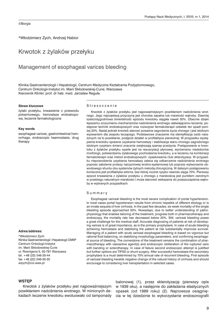 Postępy Nauk Medycznych, t. XXVII, nr 1, 2014 ©Borgis *Włodzimierz Zych, Andrzej Habior Krwotok z żylaków przełyku Management of esophageal varices bleeding Klinika Gastroenterologii i Hepatologii, Centrum Medyczne Kształcenia Podyplomowego, Centrum Onkologii-Instytut im. Marii Skłodowskiej-Curie, Warszawa Kierownik Kliniki: prof. dr hab. med. Jarosław Reguła Słowa kluczowe Streszczenie żylaki przełyku, krwawienie z przewodu pokarmowego, hemostaza endoskopowa, leczenie farmakologiczne Krwotok z żylaków przełyku jest najpoważniejszym powikłaniem nadciśnienia wrotnego. Jego najczęstszą przyczyną jest choroba zapalna lub marskość wątroby. Dawniej sześciotygodniowa śmiertelność epizodu krwotoku sięgała nawet 50%. Obecnie dzięki lepszemu zrozumieniu mechanizmów nadciśnienia wrotnego ułatwiającemu leczenie, postępowi technik endoskopowych oraz rozwojowi farmakoterapii odsetek ten spadł poniżej 20%. Nadal jednak krwotok stanowi poważne zagrożenie życia chorego i jest istotnym wyzwaniem dla zespołu leczącego. Podstawowe znaczenie ma identyfikacja osób narażonych na to powikłanie, podjęcie działań w profilaktyce pierwotnej. W przypadku wystąpienia krwotoku sprawne uzyskanie hemostazy i stabilizacja stanu chorego zagrożonego istotnym ryzykiem śmierci znacznie zwiększają szansę przeżycia. Postępowanie w krwotoku z żylaków przełyku oparte jest na resuscytacji płynowej, wyrównaniu niedoborów morfologii, potwierdzeniu żylakowego pochodzenia krwotoku, a w leczeniu na kombinacji farmakoterapii oraz metod endoskopowych: opaskowania i/lub sklerotyzacji. W przypadku niepowodzenia uzyskania hemostazy zaleca się odbarczenie nadciśnienia wrotnego poprzez założenie protezy naczyniowej wrotno-systemowej lub poprzez wytworzenie obwodowego shuntu obu systemów żylnych metodą chirurgiczną. W dalszym postępowaniu konieczna jest profilaktyka wtórna, bez której roczne ryzyko nawrotu sięga 70%. Pierwszy epizod krwawienia z żylaków przełyku u chorego z marskością jest punktem zwrotnym w przebiegu naturalnym marskości i może stanowić wskazanie do przeszczepienia wątroby w wybranych przypadkach. Key words esophageal varices, gastrointestinal hemorrhage, endoscopic haemostasis, drug therapy Summary Adres/address: *Włodzimierz Zych Klinika Gastroenterologii i Hepatologii CMKP Centrum Onkologii-Instytut im. Marii Skłodowskiej-Curie ul. Roentgena 5, 02-781 Warszawa tel. +48 (22) 546-30-44 fax +48 (22) 546-30-35 [email protected] Esophageal variceal bleeding is the most severe complication of portal hypertension. In most cases portal hypertension results from chronic hepatitis of different etiology or is an innate sequela of liver cirrhosis. In the past few decades, six week mortality of the single bleeding episode approached 50%. Nowadays, due to better understanding of pathophysiology that enables tailoring of the treatment, progress both in pharmacotherapy and endoscopy, the mortality rate has decreased below 20%. Still, variceal bleeding poses a great challenge for the medical staff. Accurate diagnosing of patients at risk of developing varices is of great importance, as is the primary prophylaxis. In case of acute bleeding achieving hemostasis and stabilizing the patient at risk substantially improves survival. Managing of a patient with acute variceal esophageal bleeding is based on vigorous but rational fluid balancing, on stabilizing morphology parameters, and confirming esophageal source of bleeding. The cornerstone of the treatment remains the combination of pharmacotherapy with vasoactive agent(s) and endoscopic obliteration of the ruptured varix with banding or sclerotherapy. In case of failure second endoscopic attempt is justified but further options are TIPSS or shunt surgery. After successful hemostasis the secondary prophylaxis is a must determined by 70% annual rate of recurrent bleeding. First episode of variceal bleeding heralds negative change of the natural history of cirrhosis and should encourage to considering liver transplantation in selected cases. Wstęp Krwotok z żylaków przełyku jest najpoważniejszym powikłaniem nadciśnienia wrotnego. W minionych dekadach leczenie krwotoku ewoluowało od tamponady balonowej (1), przez sklerotyzację (pierwszy opis w 1939 oku), a następnie do zakładania elastycznych opasek (od 1989 roku) (2). Najnowsze osiągnięcia w tej dziedzinie to wykorzystanie endosonografii 9 Włodzimierz Zych, Andrzej Habior w diagnostyce i celowanym leczeniu, a także zakładanie usuwalnych powlekanych samorozprężalnych protez przełykowych w sytuacjach ratunkowych. Techniki endoskopowe uzupełnia istotnie farmakoterapia. Nadal jednak nie dysponujemy możliwością opanowania krwotoku w każdym przypadku. Wczesne nawroty czy niepowodzenia leczenia endoskopowego skłaniają do zastosowania w drugim rzucie technik radiologii interwencyjnej. Interwencja chirurgiczna, wcześniej będąca podstawą leczenia, ma obecnie marginalne znaczenie jedynie w najcięższych, wybranych przypadkach. Różne metody stosowane w leczeniu krwotoku przedstawia tabela 1. Postępy diagnostyki i leczenia endoskopowego, a także coraz sprawniejsze zapobieganie wczesnym powikłaniom krwotoku, takim jak sepsa, niewydolność nerek czy encefalopatia wrotna przyczyniły się do zmniejszenia sześciotygodniowej śmiertelności epizodu krwotoku z niemal 50% w epoce dostępności jedynie sondy Sengstakena do poniżej 20% obecnie. Krwotok z żylaków przełyku u chorego z uszkodzeniem wątroby zawsze stanowi zagrożenie życia, jest przejawem niekorzystnego przebiegu choroby i skłania do rozważenia kierowania do przeszczepienia wątroby. Tabela 1. Metody leczenia krwotoku z żylaków przełyku. Farmakoterapia Okterotyd/somatostatyna Wazopresyna/nitrogliceryna Terlipresyna Obliteracja endoskopowa Opaskowanie Sklerotyzacja Tamponada Sonda Sengstakena-Blakemora/Lintona Powlekana proteza samorozprężalna TIPSS Chirurgia Operacj