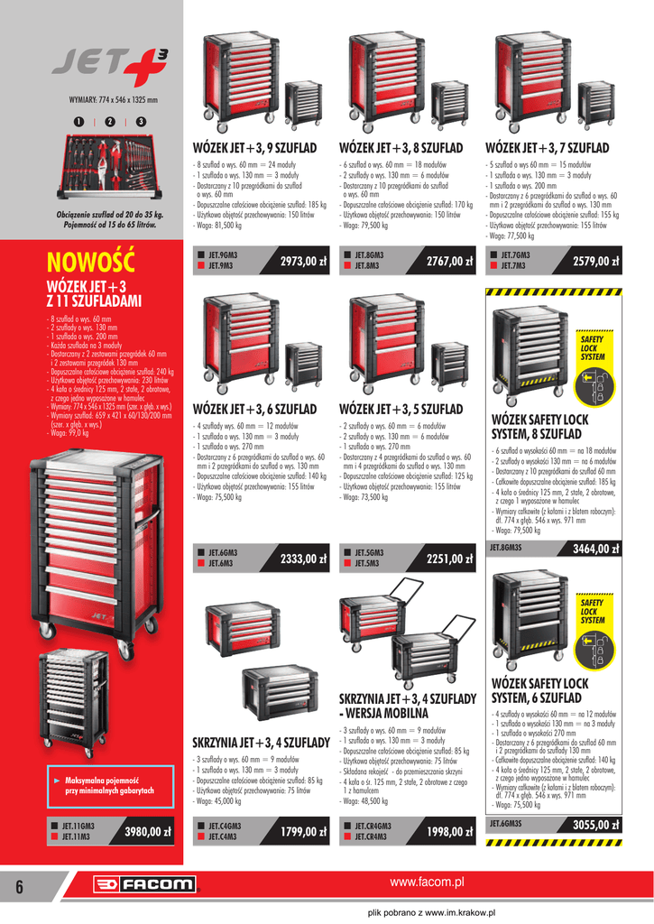 WYMIARY: 774 x 546 x 1325 mm 1 2 3 Obciązenie szuflad od 20 do 35 kg. Pojemność od 15 do 65 litrów. NOWOŚĆ WÓZEK JET+3, 9 SZUFLAD WÓZEK JET+3, 8 SZUFLAD WÓZEK JET+3, 7 SZUFLAD -8 szuflad o wys. 60 mm = 24 moduły - 1 szuflada o wys. 130 mm = 3 moduły - Dostarczany z 10 przegródkami do szuflad o wys. 60 mm - Dopuszczalne całościowe obciążenie szuflad: 185 kg - Użytkowa objętość przechowywania: 150 litrów - Waga: 81,500 kg -6 szuflad o wys. 60 mm = 18 modułów - 2 szuflady o wys. 130 mm = 6 modułów - Dostarczany z 10 przegródkami do szuflad o wys. 60 mm - Dopuszczalne całościowe obciążenie szuflad: 170 kg - Użytkowa objętość przechowywania: 150 litrów - Waga: 79,500 kg -5 szuflad o wys 60 mm = 15 modułów - 1 szuflada o wys. 130 mm = 3 moduły - 1 szuflada o wys. 200 mm - Dostarczany z 6 przegródkami do szuflad o wys. 60 mm i 2 przegródkami do szuflad o wys. 130 mm - Dopuszczalne całościowe obciążenie szuflad: 155 kg - Użytkowa objętość przechowywania: 155 litrów - Waga: 77,500 kg P JET.9GM3 P JET.9M3 2973,00 zł P JET.8GM3 P JET.8M3 2767,00 zł P JET.7GM3 P JET.7M3 2579,00 zł WÓZEK JET+3 Z 11 SZUFLADAMI -8 szuflad o wys. 60 mm -2 szuflady o wys. 130 mm -1 szuflada o wys. 200 mm -Każda szuflada na 3 moduły -Dostarczany z 2 zestawami przegródek 60 mm i 2 zestawami przegródek 130 mm -Dopuszczalne całościowe obciążenie szuflad: 240 kg -Użytkowa objętość przechowywania: 230 litrów -4 koła o średnicy 125 mm, 2 stałe, 2 obrotowe, z czego jedno wyposażone w hamulec -Wymiary: 774 x 546 x 1325 mm (szer. x głęb. x wys.) -Wymiary szuflad: 659 x 421 x 60/130/200 mm (szer. x głęb. x wys.) -Waga: 99,0 kg SAFETY LOCK SYSTEM WÓZEK JET+3, 6 SZUFLAD WÓZEK JET+3, 5 SZUFLAD -4 szuflady wys. 60 mm = 12 modułów - 1 szuflada o wys. 130 mm = 3 moduły - 1 szuflada o wys. 270 mm - Dostarczany z 6 przegródkami do szuflad o wys. 60 mm i 2 przegródkami do szuflad o wys. 130 mm - Dopuszczalne całościowe obciążenie szuflad: 140 kg - Użytkowa objętość przechowywania: 155 litrów - Waga: 75,500 kg -2 szuflady o wys. 60 mm = 6 modułów - 2 szuflady o wys. 130 mm = 6 modułów - 1 szuflada o wys. 270 mm - Dostarczany z 4 przegródkami do szuflad o wys. 60 mm i 4 przegródkami do szuflad o wys. 130 mm - Dopuszczalne całościowe obciążenie szuflad: 125 kg - Użytkowa objętość przechowywania: 155 litrów - Waga: 73,500 kg P JET.6GM3 P JET.6M3 2333,00 zł P JET.5GM3 P JET.5M3 2251,00 zł WÓZEK SAFETY LOCK SYSTEM, 8 SZUFLAD - 6 szuflad o wysokości 60 mm = na 18 modułów - 2 szuflady o wysokości 130 mm = na 6 modułów - Dostarczany z 10 przegródkami do szuflad 60 mm - Całkowite dopuszczalne obciążenie szuflad: 185 kg - 4 koła o średnicy 125 mm, 2 stałe, 2 obrotowe, z czego 1 wyposażone w hamulec - Wymiary całkowite (z kołami i z blatem roboczym): dł. 774 x głęb. 546 x wys. 971 mm - Waga: 79,500 kg JET.8GM3S 3464,00 zł SAFETY LOCK SYSTEM SKRZYNIA JET+3, 4 SZUFLADY - WERSJA MOBILNA SKRZYNIA JET+3, 4 SZUFLADY Maksymalna pojemność przy minimalnych gabarytach P JET.11GM3 P JET.11M3 6 3980,00 zł -3 szuflady o wys. 60 mm = 9 modułów - 1 szuflada o wys. 130 mm = 3 moduły - Dopuszczalne całościowe obciążenie szuflad: 85 kg - Użytkowa objętość przechowywania: 75 litrów - Waga: 45,000 kg P JET.C4GM3 P JET.C4M3 1799,00 zł -3 szuflady o wys. 60 mm = 9 modułów - 1 szuflada o wys. 130 mm = 3 moduły - Dopuszczalne całościowe obciążenie szuflad: 85 kg - Użytkowa objętość przechowywania: 75 litrów - Składana rekojeść - do przemieszczania skrzyni - 4 koła o śr. 125 mm, 2 stałe, 2 obrotowe z czego 1 z hamulcem - Waga: 48,500 kg P JET.CR4GM3 P JET.CR4M3 1998,00 zł WÓZEK SAFETY LOCK SYSTEM, 6 SZUFLAD - 4 szuflady o wysokości 60 mm = na 12 modułów - 1 szuflada o wysokości 130 mm = na 3 moduły - 1 szuflada o wysokości 270 mm - Dostarczany z 6 przegródkami do szuflad 60 mm i 2 przegródkami do szuflady 130 mm - Całkowite dopuszczalne obciążenie szuflad: 140 kg - 4 koła o średnicy 125 mm, 2 stałe, 2 obrotowe, z czego jedno wyposażone w hamulec -Wymiary całkowite (z kołami i z blatem roboczym): dł. 774 x głęb. 546 x wys. 971 mm - Waga: 75,500 kg JET.6GM3S www.facom.pl plik pobrano z www.im.krakow.pl 3055,00 zł