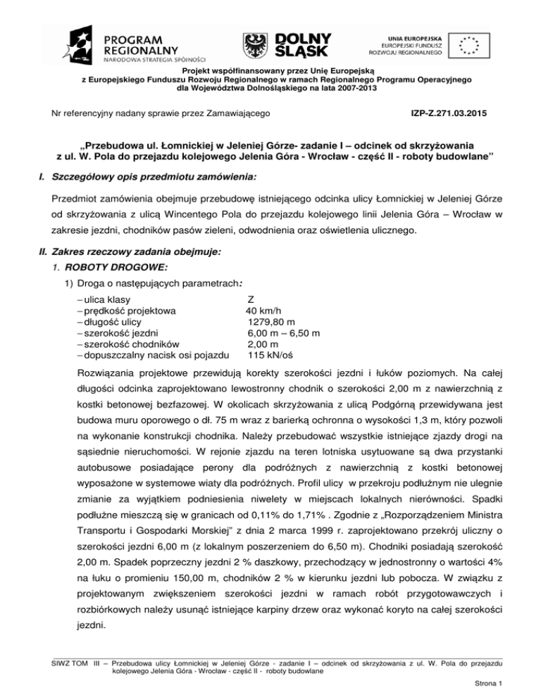 Projekt współfinansowany przez Unię Europejską z Europejskiego Funduszu Rozwoju Regionalnego w ramach Regionalnego Programu Operacyjnego dla Województwa Dolnośląskiego na lata 2007-2013 Nr referencyjny nadany sprawie przez Zamawiającego IZP-Z.271.03.2015 „Przebudowa ul. Łomnickiej w Jeleniej Górze- zadanie I – odcinek od skrzyżowania z ul. W. Pola do przejazdu kolejowego Jelenia Góra - Wrocław - część II - roboty budowlane” I. Szczegółowy opis przedmiotu zamówienia: Przedmiot zamówienia obejmuje przebudowę istniejącego odcinka ulicy Łomnickiej w Jeleniej Górze od skrzyżowania z ulicą Wincentego Pola do przejazdu kolejowego linii Jelenia Góra – Wrocław w zakresie jezdni, chodników pasów zieleni, odwodnienia oraz oświetlenia ulicznego. II. Zakres rzeczowy zadania obejmuje: 1. ROBOTY DROGOWE: 1) Droga o następujących parametrach: − ulica klasy − prędkość projektowa − długość ulicy − szerokość jezdni − szerokość chodników − dopuszczalny nacisk osi pojazdu Z 40 km/h 1279,80 m 6,00 m – 6,50 m 2,00 m 115 kN/oś Rozwiązania projektowe przewidują korekty szerokości jezdni i łuków poziomych. Na całej długości odcinka zaprojektowano lewostronny chodnik o szerokości 2,00 m z nawierzchnią z kostki betonowej bezfazowej. W okolicach skrzyżowania z ulicą Podgórną przewidywana jest budowa muru oporowego o dł. 75 m wraz z barierką ochronna o wysokości 1,3 m, który pozwoli na wykonanie konstrukcji chodnika. Należy przebudować wszystkie istniejące zjazdy drogi na sąsiednie nieruchomości. W rejonie zjazdu na teren lotniska usytuowane są dwa przystanki autobusowe posiadające perony dla podróżnych z nawierzchnią z kostki betonowej wyposażone w systemowe wiaty dla podróżnych. Profil ulicy w przekroju podłużnym nie ulegnie zmianie za wyjątkiem podniesienia niwelety w miejscach lokalnych nierówności. Spadki podłużne mieszczą się w granicach od 0,11% do 1,71% . Zgodnie z „Rozporządzeniem Ministra Transportu i Gospodarki Morskiej” z dnia 2 marca 1999 r. zaprojektowano przekrój uliczny o szerokości jezdni 6,00 m (z lokalnym poszerzeniem do 6,50 m). Chodniki posiadają szerokość 2,00 m. Spadek poprzeczny jezdni 2 % daszkowy, przechodzący w jednostronny o wartości 4% na łuku o promieniu 150,00 m, chodników 2 % w kierunku jezdni lub pobocza. W związku z projektowanym zwiększeniem szerokości jezdni w ramach robót przygotowawczych i rozbiórkowych należy usunąć istniejące karpiny drzew oraz wykonać koryto na całej szerokości jezdni. _______________________________________________________________________________________________________________ SIWZ TOM III – Przebudowa ulicy Łomnickiej w Jeleniej Górze - zadanie I – odcinek od skrzyżowania z ul. W. Pola do przejazdu kolejowego Jelenia Góra - Wrocław - część II - roboty budowlane Strona 1 2) Zakłada się wykonanie konstrukcji ciągów komunikacyjnych według następujących przekrojów: a) Konstrukcja jezdni: − 5 cm – warstwa ścieralna z mieszanki SMA o uziarnieniu 0/11 mm, układana na całej szerokości w jednym przebiegu − 6 cm – warstwa wiążąca z betonu asfaltowego o uziarnieniu 0/16 mm, − 7 cm – podbudowa z betonu asfaltowego o uziarnieniu 0/22 mm , − 20 cm - podbudowa pomocnicza z kruszywa stabilizowanego mechanicznie z kruszywa o uziarnieniu 0/31,5mm − 15 cm – warstwa gruntu stabilizowanego cementem o RM = 1,50 MPa. b) Konstrukcja jezdni na zjazdach: − 5 cm – warstwa ścieralna z mieszanki SMA o uziarnieniu 0/11 mm, − 6 cm – warstwa wiążąca z betonu asfaltowego o uziarnieniu 0/16 mm, − 22 cm - podbudowa z kruszywa stabilizowanego mechanicznie z kruszywa o uziarnieniu 0/31,5mm, − 20 cm – warstwa odsączająca z pospółki lub piasku. c) Konstrukcja jezdni ulicy Koziej i Wincentego Pola: − 5 cm – warstwa ścieralna z mieszanki SMA o uziarnieniu 0/11 mm ( układana na całej szerokości jezdni w jednym przebiegu, po uprzednim sfrezowaniu istniejącej warstwy ścieralnej) − 6 cm – warstwa wiążąca z betonu asfaltowego o uziarnieniu 0/16 mm − 7 cm – podbudowa z betonu asfaltowego o uziarnieniu 0/22 mm − 20 cm - podbudowa pomocnicza z kruszywa stabilizowanego mechanicznie z kruszywa o uziarnieniu 0/31,5mm − 15 cm – warstwa gruntu stabilizowanego cementem o RM = 1,50 MPa d) Konstrukcja chodnika: − 8 cm – kostka brukowa betonowa bezfazowa szara wibroprasowana gat. I − 3 cm – podsypka piaskowa − 15 cm – podbudowa z kruszywa łamanego o uziarnieniu ciągłym 0/31,5 mm − 10 cm – warstwa odsączająca z piasku 3) W uzupełnieniu robót drogowych zakłada się wykonanie oznakowania poziomego i pionowego całego odcinka ulicy oraz wyprofilowanie i uporządkowanie rowów i terenów zielonych w pasie drogowym. 2. ROBOTY ELEKTRYCZNE: 1) Oświetlenie ul. Łomnickiej: Przy istniejącej stacji transformatorowej PT 22711 należy posadowić szafkę oświetleniową. Z szafki oświetleniowej należy wyprowadzić dwie linie kablowe kablem YAKXS 4x35 mm2. _______________________________________________________________________________________________________________ SIWZ TOM III – Przebudowa ulicy Łomnickiej w Jeleniej Górze - zadanie I – odcinek od skrzyżowania z ul. W. Pola do przejazdu kolejowego Jelenia Góra - Wrocław - część II - roboty budowlane Strona 2 Jedną w dół ulicy poprzez słupy nr L1/1 do słupa nr L1/14 i drugą w górę ulicy przez słup nr L2/1 aż do słupa nr L2/25. Linie kablowe na wszystkich odcinkach układać w rurach ochronnych dwuściennych wykonanych z polietylenu wysokiej gęstości (HDPE), z karbowana ścianką zewnętrzną i gładka ścianką wewnętrzna, o średnicy zewnętrznej 75 mm i o średnicy wewnętrznej 63 mm, przy przejściach przez jezdnię o średnicy zewnętrznej 110 mm i o średnicy wewnętrznej 95mm. Zastosować słupy aluminiowe 9 m (zabezpieczenie elastomerem w kolorze słupa do wysokości 350 mm) z wysięgnikiem 1,0 