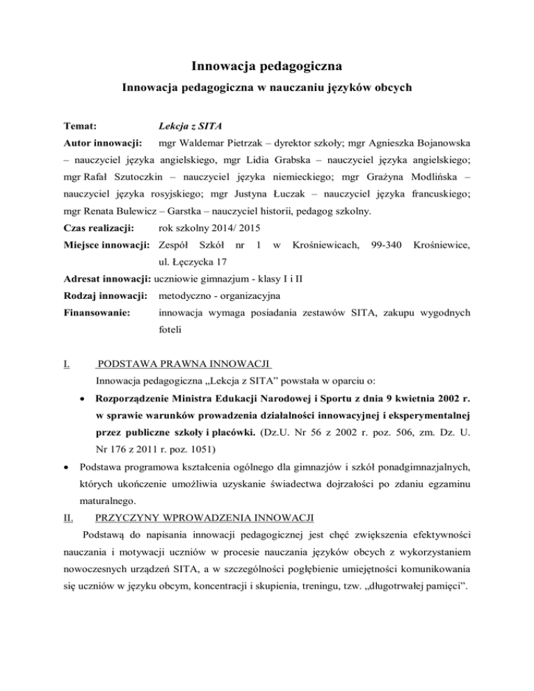 Innowacja pedagogiczna Innowacja pedagogiczna w nauczaniu języków obcych Temat: Lekcja z SITA Autor innowacji: mgr Waldemar Pietrzak – dyrektor szkoły; mgr Agnieszka Bojanowska – nauczyciel języka angielskiego, mgr Lidia Grabska – nauczyciel języka angielskiego; mgr Rafał Szutoczkin – nauczyciel języka niemieckiego; mgr Grażyna Modlińska – nauczyciel języka rosyjskiego; mgr Justyna Łuczak – nauczyciel języka francuskiego; mgr Renata Bulewicz – Garstka – nauczyciel historii, pedagog szkolny. Czas realizacji: rok szkolny 2014/ 2015 Miejsce innowacji: Zespół Szkół nr 1 w Krośniewicach, 99-340 Krośniewice, ul. Łęczycka 17 Adresat innowacji: uczniowie gimnazjum - klasy I i II Rodzaj innowacji: metodyczno - organizacyjna Finansowanie: innowacja wymaga posiadania zestawów SITA, zakupu wygodnych foteli I. PODSTAWA PRAWNA INNOWACJI Innowacja pedagogiczna „Lekcja z SITA” powstała w oparciu o: Rozporządzenie Ministra Edukacji Narodowej i Sportu z dnia 9 kwietnia 2002 r. w sprawie warunków prowadzenia działalności innowacyjnej i eksperymentalnej przez publiczne szkoły i placówki. (Dz.U. Nr 56 z 2002 r. poz. 506, zm. Dz. U. Nr 176 z 2011 r. poz. 1051) Podstawa programowa kształcenia ogólnego dla gimnazjów i szkół ponadgimnazjalnych, których ukończenie umożliwia uzyskanie świadectwa dojrzałości po zdaniu egzaminu maturalnego. II. PRZYCZYNY WPROWADZENIA INNOWACJI Podstawą do napisania innowacji pedagogicznej jest chęć zwiększenia efektywności nauczania i motywacji uczniów w procesie nauczania języków obcych z wykorzystaniem nowoczesnych urządzeń SITA, a w szczególności pogłębienie umiejętności komunikowania się uczniów w języku obcym, koncentracji i skupienia, treningu, tzw. „długotrwałej pamięci”. III. ZASADY INNOWACJI: Innowacja pedagogiczna będzie realizowana w czasie zajęć języków obcych i wychowania fizycznego. Wprowadzona innowacja przewiduje 2 godziny dodatkowe w tygodniu z języka obcego, jako rozszerzenie realizacji podstawy programowej w gimnazjum, utrwalenie wcześniej zdobytych jak również dodatkowe zajęcia relaksacyjne prowadzone umiejętności językowych, w czasie zajęć wychowania fizycznego lub zajęć sportowo – rekreacyjnych. IV. CELE OGÓLNE INNOWACJI rozbudzanie, pogłębianie wiedzy i pasji związanej z językami obcymi, rozwijanie kompetencji językowych na wszystkich płaszczyznach szczególnie, jeżeli chodzi o umiejętność mówienia, słuchania i czytania w języku obcym, zastosowanie zdobytej wiedzy teoretycznej w praktycznych sytuacjach językowych, rozwijanie umiejętności koncentracji i relaksacji. V. CELE SZCZEGÓŁOWE: uczeń odkrywa indywidualne zdolności i predyspozycje poprzez uczenie się metodą SITA, skutecznie używa języka obcego w mowie (łatwiej rozumie wypowiedzi w języku obcym dzięki przygotowanym nagraniom z dialogami, potrafi użyć strategii komunikacyjnych dotyczących danego tematu, wyrazić opinię, opisać zdarzenia, prowadzić rozmowę związaną z konkretnym zdarzeniem, zadawać pytania i udzielać odpowiedzi, nabywa nowego słownictwa), rozumie tekst mówiony (rozumienie ogólnego sensu danego tekstu lub wypowiedzi, wybieranie określonych informacji ze słyszanego tekstu, uzyskiwanie informacji szczegółowych), rozumie swój własny proces uczenia się, wykorzystując stan relaksacji, ćwiczy umiejętność pracy w zespole. W zakresie doskonalenia sprawności językowych uczeń powinien: tworzyć spójne i logiczne wypowiedzi ustne, poprawne pod względem stylistycznym i gramatyczno - leksykalnym, w swoich wypowiedziach ustnych starać się stosować poprawną wymowę, intonację i akcent, komunikować się skutecznie w zakresie sprawności produktywnych (mówienie) i receptywnych (czytanie i słuchanie). W zakresie doskonalenia sprawności mówienia uczeń powinien: rozpoczynać i kończyć rozmowę podejmując różne role w procesie komunikacyjnym, zadawać pytania, tak aby upewnić się, że poprawnie zrozumiał intencje mówiącego, wyrażać prośbę o wyjaśnienie, powtórzenie, opinię (przedstawiać i uzasadniać kwestie dotyczące danego tematu, umieć bronić własnych opinii, a także argumentować za i przeciw, reagować na wyrażane uczucia - takie jak: zadowolenie, zdziwienie, smutek, zainteresowanie, obojętność), składać propozycje i reagować na nie odpowiednio, opowiadać o swoich zainteresowaniach, odpowiadać na zadane po swojej wypowiedzi proste i bardziej złożone pytania, stosować środki językowe adekwatne do ich funkcji komunikacyjnych, dla wyrażania intencji, uczuć, emocji W zakresie doskonalenia sprawności rozumienia ze słuchu uczeń powinien: określać główną myśl słyszanego tekstu, określać główny wątek wysłuchanych dialogów, rozumieć wypowiadany dialog, wskazywać określone informacje związane z usłyszanym dialogiem, selekcjonować potrzebne informacje, określać potencjalnego odbiorcę dialogu. W zakresie doskonalenia sprawności rozumienia tekstu czytanego uczeń powinien: rozumieć krótkie, proste dialogi dotyczące spraw związanych z życiem codziennym, określać przydatność przeczytanego dialogu w zależności od sytuacji, selekcjonować potrzebne mu informacje. W zakresie autonomii uczenia się uczeń powinien: stosować różnorodne pomocne strategie uczenia się zgodne z jego predyspozycjami, planować własny proces uczenia się poprzez, np. podejmowanie własnych inicjatyw takich jak np. systematyczne uczestnictwo w zajęciach w celu odbywania kolejnych faz zajęć. VI. OCZEKIWANE EFEKTY: Celem innowacji jest osiągnięcie w stosunkowo krótkim czasie zadowalających efektów nauczania języków obcych tj. wzrost poziomu sprawności językowych oraz znaczna poprawa umiejętności swobodnego komunikowania się w języku obcym. Po rocznym kursie metodą SITA uczniowie nabędą umiejętność nawiązania swobodnego kontaktu interpersonalnego w języku obcym, przezwyciężą, 