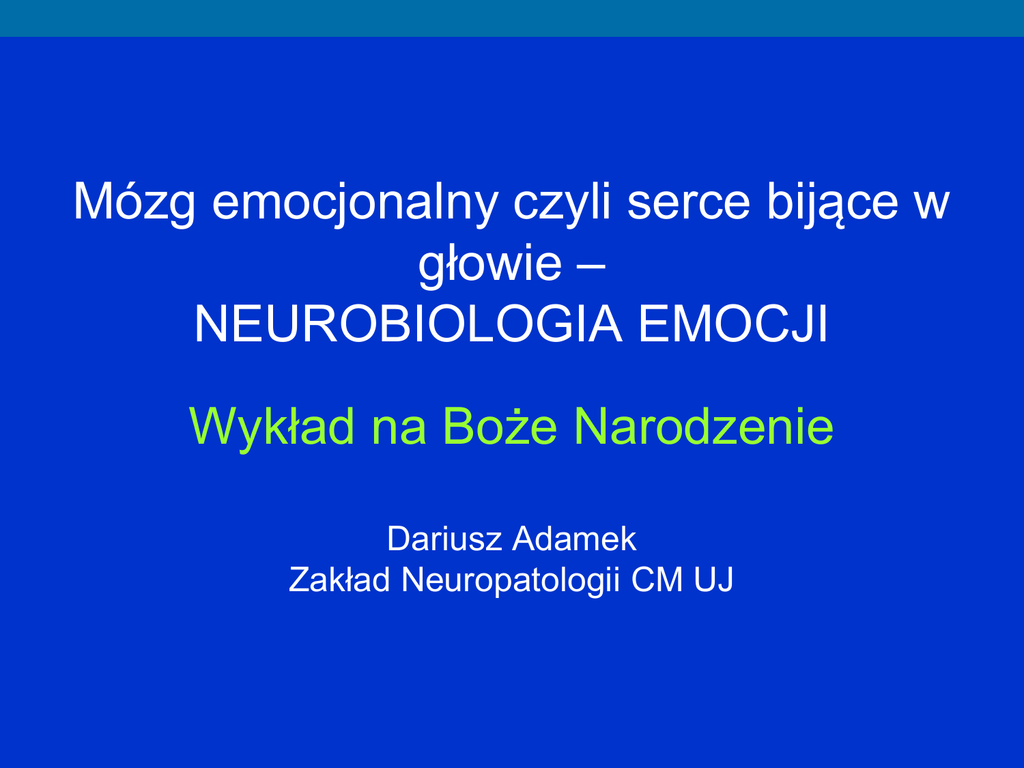 Mózg emocjonalny czyli serce bijące w głowie – NEUROBIOLOGIA EMOCJI Wykład na Boże Narodzenie Dariusz Adamek Zakład Neuropatologii CM UJ NEUROBIOLOGIA EMOCJI uwagi wstępne n.t. emocji 1. Reakcje emocjonalne (zwł wegetatywne) odzwierciedlają ukrytą prawdę o człowieku („serce”) 2. Emocje to główny „napęd” aktywności. 3. Nastrój decyduje o efektywności naszej pracy i nauki. 4. Prawidłowa ocena i kontrola emocji własnych i u innych osób decydują o osobniczym sukcesie społecznym. 5. Nieprawidłowe reakcje emocjonalne cechują liczne schorzenia psychiatryczne oraz… 6. są przyczyną schorzeń tzw psychosomatycznych. Znaczenie badań neuronalnych „obwodów” emocji: Rola emocjonalności i jej zaburzeń: • Patomechanizmy schorzeń „psychiatrycznych” zwłaszcza depresji • Modulacja procesów kognitywnych – – – – efektywność uczenia się, sprawność procesów decyzyjnych, działanie w sytuacji stresowej, koncentracja uwagi. • Zachowaniach społecznych – tworzenie lub utratę więzi społecznych, – zdolność/niezdolność do współpracy w obrębie „celowej grupy”, np. drużyny sportowej czy załogi samolotu itp. – oddziaływanie reklam, – wpływ na wybory polityczne, • „Inteligencja emocjonalna” • Mayer-Salovey-Caruso Emotional Intelligence Test – spostrzeganie emocji, – wykorzystywanie emocji w procesach poznawczych (facilitating thought) – rozumienie emocji – kierowanie emocjami GDY MÓWIMY: „SERCE” … Można tłumić ekspresję emocji ale skrajnie trudne jest tłumienie „samych emocji” Bo serce nie jest sługa, nie zna, co to pany, I nie da się przemocą okuwać w kajdany. A.Mickiewicz SERCE vs ROZUM Serce ma swoje racje, których rozum nie zna. Blais Pascal Amplifikacja racjonalna i technologiczna reakcji emocjonalnych Problemem naszego wieku nie jest bomba atomowa, lecz serce ludzkie. Albert Einstein Emocje są „wbudowane” w kondycję człowieka – stanowią „napęd emocjonalny” ludzkich działań; „serce” jako motywator. "Uczyniłeś nas dla siebie o Panie, i niespokojne jest serce człowieka dopóki nie spocznie w Tobie". Św. Augustyn: “Wyznania”, Księga I. • Napęd emocjonalny (także pamięć emocjonalna) każe nam „wracać” … – (istota wszelkich „reunions”) • Scherzo h-moll Op.20 F. z motywem kolędy „Lulajże Jezuniu” - Chopin „wraca” do Bożego Narodzenia dzieciństwa… • Serce, ono bije mocniej gdy nam na czymś zależy, gdy się niepokoimy, także o siebie, bo przecież zależy nam na nas… • „Serce” to symbol naszej emocjonalności, więcej, symbol „najgłebszego JA” również tego, co powoduje, że robię rzeczy „nieracjonalne” • Gdzie jest to „serce”? • HAMM (wearily): “… There's something dripping in my head. (Pause.) A heart, a heart in my head. (Pause.) NAGG (soft): Do you hear him? A heart in his head! (He chuckles cautiously.)” -Samuel Beckett “Endgame” „Serce” jest w mózgu… Jakie są „emocjonalne uzwojenia” mózgu? • PERCEPCJA EMOCJI • EKSPRESJA EMOCJI • PERCEPCJA EMOCJI – Świadoma i nieświadoma – Empatia (elementy świadome i nieświadome) • pojawia się u naczelnych, • (neurony zwierciadlane?) • EKSPRESJA EMOCJI – Świadoma („wolicjonalna”) i nieświadoma • Środki ekspresji emocji: – Reakcje trzewnego ruchowego układu nerwowego (autonomicznego) – Mimika twarzy – Prozodia mowy – „Mowa ciała” (body language) • „Trójjedyny” mózg (Paul MacLean 1990) – „gadzi” • pień mózgu, móżdżek,jądra podstawy, wzgórze opuszki węchowe – „ssaczy” • system limbiczny – „naczelno-człowieczy” • Supresja lub augmentacja emocjonalności, empatia • Teorie emocji : – James’a-Lange’a (William James, Carl Lange -koniec XIX w.): objawy generowane poprzez działanie głównie autonomicznego układu nerwowego odczuwamy jako emocję – Cannon’a-Barda (Walter Cannon, Philip Bard - lata 20-te XX w.): Czynnik postrzegany jako „emocjonalny” wywołuje reakcję centralnego układu nerwowego prowadzącą do odpowiednich zmian w funkcji różnych narządów i reakcji ruchowych – somatycznych (np. ucieczka). – Schachter-Singer tzw. teoria dwóch czynników (Stanley Schachter, Jerome Singer – 60-te lata XXw): interpretacja kognitywna reakcji fizjologicznych –Schachter-Singer tzw. teoria dwóch czynników (Stanley Schachter, Jerome Singer – 60-te lata XXw): interpretacja kognitywna reakcji fizjologicznych Przeciwstawne teorie emocji : James’a-Lange’a oraz Cannon’a-Barda • Przykład „obustronności” związku „emocjonalnego umysłu” i ciała: – Wyobrażenie stanu emocjonalnego → „obwodowe” zmiany „emocjonalne” • (np. wzrost akcji serca, pocenie się itp.) [techniki biofeedback?? Zdolności fakirów??] – „Instrumentalne” (według czysto mechanicznej instrukcji) wytwarzanie emocjonalnego wyrazu twarzy → „obwodowe” zmiany „emocjonalne” (zgodne z mimiką). • [aktor może znacznie głębiej „wczuwać się” w rolę…?] • Systemy emocjonalne mózgu ssaków* • wg Jaak Panksepp’a (2006) • Od urodzenia: – – – – SEEKING (POSZUKIWANIE) FEAR (STRACH) c.n. amygdala - PAG RAGE (WŚCIEKŁOŚĆ) • „Pierwotne” emocje: PANIC (PANIKA) – Złość Nieco później: – LUST (RZĄDZA) – CARE (OPIEKUŃCZOŚĆ) – PLAY (ZABAWA – WESOŁOŚĆ) – – – – Strach Przyjemność Smutek Obrzydzenie • *Nie ma tu „afektów” (nienawiść, zazdrość, miłość) Obwód Papez’a • • • • • • Hipokamp – (fornix)c.suteczkowate – (tr.mammillothalamicus)j.przednie wzgórza(włókna projekcyjne do zakrętu obręczy)• zakręt obręczy • (włokna projekcyjne z zakretu obręczy do hipokampa)• hipokamp Uszkodzenie fornix- zab. pamięci, Uszkodzenie c. suteczkowatych (zesp. Korsakoff’a) Obwód Papez’a Obwód Papez’a • Rola układu limbicznego w ekspresji e
