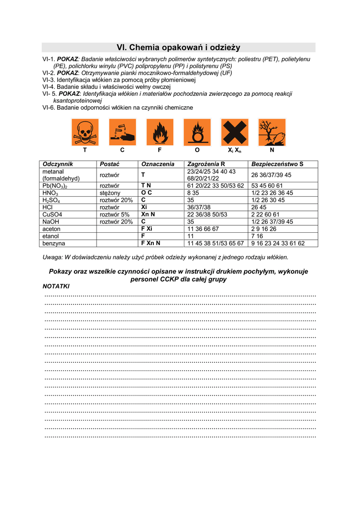 VI. Chemia opakowań i odzieży VI-1. POKAZ: Badanie właściwości wybranych polimerów syntetycznych: poliestru (PET), polietylenu (PE), polichlorku winylu (PVC) polipropylenu (PP) i polistyrenu (PS) VI-2. POKAZ: Otrzymywanie pianki mocznikowo-formaldehydowej (UF) VI-3. Identyfikacja włókien za pomocą próby płomieniowej VI-4. Badanie składu i właściwości wełny owczej VI- 5. POKAZ: Identyfikacja włókien i materiałów pochodzenia zwierzęcego za pomocą reakcji ksantoproteinowej VI-6. Badanie odporności włókien na czynniki chemiczne T Odczynnik metanal (formaldehyd) Pb(NO3)2 HNO3 H2SO4 HCl CuSO4 NaOH aceton etanol benzyna C F Postać Oznaczenia roztwór T roztwór stężony roztwór 20% roztwór roztwór 5% roztwór 20% TN OC C Xi Xn N C F Xi F F Xn N O Xi Xn Zagrożenia R 23/24/25 34 40 43 68/20/21/22 61 20/22 33 50/53 62 8 35 35 36/37/38 22 36/38 50/53 35 11 36 66 67 11 11 45 38 51/53 65 67 N Bezpieczeństwo S 26 36/37/39 45 53 45 60 61 1/2 23 26 36 45 1/2 26 30 45 26 45 2 22 60 61 1/2 26 37/39 45 2 9 16 26 7 16 9 16 23 24 33 61 62 Uwaga: W doświadczeniu należy użyć próbek odzieży wykonanej z jednego rodzaju włókien. Pokazy oraz wszelkie czynności opisane w instrukcji drukiem pochyłym, wykonuje personel CCKP dla całej grupy NOTATKI ....................................................................................................................................... ....................................................................................................................................... ....................................................................................................................................... ....................................................................................................................................... ....................................................................................................................................... ....................................................................................................................................... ....................................................................................................................................... ....................................................................................................................................... ....................................................................................................................................... ....................................................................................................................................... ....................................................................................................................................... ....................................................................................................................................... ....................................................................................................................................... ....................................................................................................................................... ....................................................................................................................................... ....................................................................................................................................... ....................................................................................................................................... ....................................................................................................................................... VI-1. POKAZ: Badanie właściwości wybranych polimerów syntetycznych: poliestru (PET), polietylenu (PE), polichlorku winylu (PVC) polipropylenu (PP) i polistyrenu (PS) Sprzęt: - 2 zlewki 50 cm3 - szkiełko zegarkowe - szczypce metalowe - palnik - wata - tryskawka Odczynniki: - próbka poliestru PET - próbka polietylenu PE - próbka poli(chlorku winylu) PVC - próbka polipropylenu PP - próbka polistyrenu PS - benzyna - aceton - 20% roztwór H2SO4 - 20% roztwór NaOH a) Niewielką próbkę każdego tworzywa spróbuj zapalić, wprowadzając ją do płomienia palnika, trzymając metalowymi szczypcami. Zwróć uwagę, czy próbka gaśnie po wyjęciu z płomienia, czy pali się dalej. Do świeżo wyjętej z płomienia próbki zbliż zwilżony wodą papierek wskaźnikowy. Obserwacje: Tworzywo Czy się pali? Czy gaśnie po wyjęciu z płomienia Zapach Odczyn PET PE PVC PP PS b) Próbkę każdego tworzywa potrzyj watą zwilżoną benzyną, a następnie acetonem. Zwróć uwagę na rozpuszczalność tych tworzyw w podanych rozpuszczalnikach (co dzieje się z powierzchnią tworzywa?) Obserwacje: Tworzywo Czy kontakt z benzyną pozostawia ślad na powierzchni? Czy kontakt z acetonem pozostawia ślad na powierzchni? PET PE PVC PP PS c) Próbkę każdego tworzywa zanurz w 20% roztworze kwasu siarkowego, a następnie ogrzewaj przez chwilę. Doświadczenie powtórz, stosując 20% roztwór NaOH. Porównaj efekty działania kwasów i zasad na każde z tworzyw. Obserwacje: Tworzywo PET PE PVC PP PS 20% roztwór H2SO4 20% roztwór NaOH Wnioski: ....................................................................................................................................... ....................................................................................................................................... ....................................................................................................................................... ....................................................................................................................................... ....................................................................................................................................... ....................................
