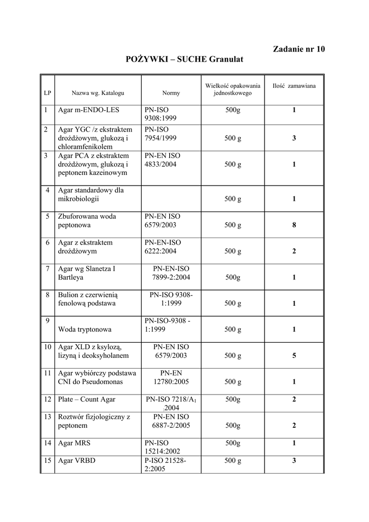 Zadanie nr 10 POŻYWKI – SUCHE Granulat LP Nazwa wg. Katalogu Normy Wielkość opakowania jednostkowego Ilość zamawiana 500g 1 1 Agar m-ENDO-LES PN-ISO 9308:1999 2 Agar YGC /z ekstraktem drożdżowym, glukozą i chloramfenikolem Agar PCA z ekstraktem drożdżowym, glukozą i peptonem kazeinowym PN-ISO 7954/1999 500 g 3 PN-EN ISO 4833/2004 500 g 1 500 g 1 3 4 5 6 7 Agar standardowy dla mikrobiologii Zbuforowana woda peptonowa PN-EN ISO 6579/2003 500 g 8 Agar z ekstraktem drożdżowym PN-EN-ISO 6222:2004 500 g 2 Agar wg Slanetza I Bartleya PN-EN-ISO 7899-2:2004 500g 1 Bulion z czerwienią fenolową podstawa PN-ISO 93081:1999 500 g 1 PN-ISO-9308 1:1999 500 g 1 10 Agar XLD z ksylozą, lizyną i deoksyholanem PN-EN ISO 6579/2003 500 g 5 11 Agar wybiórczy podstawa CNI do Pseudomonas PN-EN 12780:2005 500 g 1 500g 2 500g 2 500g 1 500 g 3 8 9 Woda tryptonowa 12 Plate – Count Agar 13 Roztwór fizjologiczny z peptonem 14 Agar MRS 15 Agar VRBD PN-ISO 7218/A1 :2004 PN-EN ISO 6887-2/2005 PN-ISO 15214:2002 P-ISO 215282:2005 LP Nazwa wg. Katalogu 16 Agar Kinga B Normy Wielkość opakowania jednostkowego Ilość zamawiana PN-EN 12780:2005 PN-Z-110013:2000 500 g 1 500 g 1 18 Bulion wzbogacony RVS wg Rappaport Vassiliadis PN-EN ISO 6579/2003 500 g 1 19 Bulion Brilla PN- ISO 4831/1998 PN-EN ISO 6579/2003 PN-EN ISO 6888-1/2001 PN- ISO 4832/2007 PN- ISO 215282/2005 500 g 1 100 ml 1 500 g 1 500 g 2 500 g 1 500 g 1 100 g 1 100 g 1 100 g 1 1000g 1 500 g 1 17 Agar Chapmana z mannitolem, solą i czerwienią fenolową 20 Odczynnik Kovacsa 21 Hirn – Herz Bouillon 22 VRB Agar 23 Glucose-Caseinpepton Agar 24 Agar Baird Parkera 25 L-Cysteinhydrochlorid Monohydrat 26 L-Lisinmonohydrochlorid 27 D (-)Mannitol 28 Laktose-Monohydrat 29 Agar z siarczanem bizmutu wg WILSONA BLAIRA PN-EN ISO 6888-1/2001 Nie gorszy niż Merck nr kat 1.02839 Nie gorszy niż Merck nr kat 1.05700 Nie gorszy niż Merck PN- ISO 93081/1999 PN-ISO 93081:1999 Pożywki mikrobiologiczne- Wymagania a) Bezwzględnie wymaga się zgodności składów przedmiotu zamówienia z odpowiednimi polskimi normami. b) Termin ważności pożywek na płytkach minimum 6 tygodni od momentu dostawy. c) Termin ważności pożywek suchych min. 3 lata od momentu produkcji ściśle określony(tzn: rok, miesiąc, dzień, warunki przechowywania) dla każdego produktu. d) Suplementy minimum 1 rok ważności od daty dostawy 1.1. Po podpisaniu umowy wykonawca będzie zobowiązany: a) Do dostarczenia pożywek wymienionych w specyfikacji z jednym numerem serii w ilości większej niż jedno opakowanie, o tym samym numerze serii dla poszczególnych dostaw. b) Do dostarczenia zaleceń producenta dot. Sposobu wykonania pożywki, c) Do realizacji zamówień składanych pocztą, faxem, pocztą elektroniczną w ilości zależnej od aktualnych potrzeb zamawiającego. d) Do realizacji zamówienia w czasie do 7 dni od momentu zamówienia. e) Do odpowiedzi na reklamację w ciągu 48 godzin. f) Do dostarczenia dokumentacji pożywki otrzymanej od producenta zawierającej: − Nazwę pożywki − Listę składników i suplementów − Numer katalogowy − Numer partii produkcyjnej − Wartość pH przed użyciem pożywki − Dane dotyczące warunków przechowywania − Datę przydatności do użycia − Kartę Charakterystyki w języku polskim od producenta g) Dla każdej dostarczonej partii pożywek i suplementów wymagany jest oryginał certyfikatu kontroli jakości danej partii produktu od producenta zawierający datę wystawienia certyfikatu, właściwości fizyczne pożywek, wykaz szczepów wzorcowych z kolekcji ATTC stosowanych do testowania. h) Parametry graniczne mają być zgodne z dokumentami TS ISO 11133 oraz niezbędne informacje dla podłoży gotowych na płytkach: • Średnica płytki 9 cm. • Świadectwo kontroli jakości (Certyfikat Kontroli Jakości każdej partii produktów), które zawiera minimum: nazwę producenta, nazwę produktu, numer serii, datę ważności; skład pożywki, • Ogólną charakterystykę pożywki: kolor, pH, opakowanie, sterylność, • Charakterystykę mikrobiologiczną: wykaz szczepów kontrolnych z kolekcji ATCC wraz z opisem morfologii kolonii wyrosłych na pożywce, żyzność wyrażoną liczbowo lub procentowo.