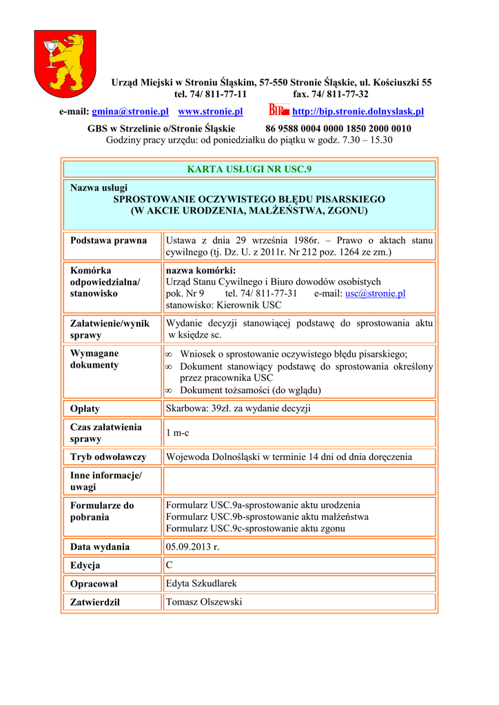 Urząd Miejski w Stroniu Śląskim, 57-550 Stronie Śląskie, ul. Kościuszki 55 tel. 74/ 811-77-11 fax. 74/ 811-77-32 e-mail: [email protected] www.stronie.pl http://bip.stronie.dolnyslask.pl GBS w Strzelinie o/Stronie Śląskie 86 9588 0004 0000 1850 2000 0010 Godziny pracy urzędu: od poniedziałku do piątku w godz. 7.30 – 15.30 KARTA USŁUGI NR USC.9 Nazwa usługi SPROSTOWANIE OCZYWISTEGO BŁĘDU PISARSKIEGO (W AKCIE URODZENIA, MAŁśEŃSTWA, ZGONU) Podstawa prawna Ustawa z dnia 29 września 1986r. – Prawo o aktach stanu cywilnego (tj. Dz. U. z 2011r. Nr 212 poz. 1264 ze zm.) Komórka odpowiedzialna/ stanowisko nazwa komórki: Urząd Stanu Cywilnego i Biuro dowodów osobistych pok. Nr 9 tel. 74/ 811-77-31 e-mail: [email protected] stanowisko: Kierownik USC Załatwienie/wynik sprawy Wydanie decyzji stanowiącej podstawę do sprostowania aktu w księdze sc. Wymagane dokumenty • • • Wniosek o sprostowanie oczywistego błędu pisarskiego; Dokument stanowiący podstawę do sprostowania określony przez pracownika USC Dokument toŜsamości (do wglądu) Opłaty Skarbowa: 39zł. za wydanie decyzji Czas załatwienia sprawy 1 m-c Tryb odwoławczy Wojewoda Dolnośląski w terminie 14 dni od dnia doręczenia Inne informacje/ uwagi Formularze do pobrania Formularz USC.9a-sprostowanie aktu urodzenia Formularz USC.9b-sprostowanie aktu małŜeństwa Formularz USC.9c-sprostowanie aktu zgonu Data wydania 05.09.2013 r. Edycja C Opracował Edyta Szkudlarek Zatwierdził Tomasz Olszewski Stronie Śląskie, dnia............................................ Wnioskodawca: ....................................................... /imię i nazwisko/ ....................................................... /adres zamieszkania/ ....................................................... Kierownik Urzędu Stanu Cywilnego w Stroniu Śląskim WNIOSEK O SPROSTOWANIE BŁĘDU W AKCIE URODZENIA Proszę o sprostowanie błędu w akcie urodzenia Nr ......................... sporządzonego w Urzędzie Stanu Cywilnego w Stroniu Śląskim dotyczącego niŜej wymienionej osoby: imię i nazwisko ............................................................................. w części dotyczącej ...................................................................................................................... ....................................................................................................................................................... Wpisane jest................................................................................................................................. ....................................................................................................................................................... ....................................................................................................................................................... A powinno być ............................................................................................................................ ....................................................................................................................................................... ....................................................................................................................................................... Podstawę sprostowania stanowi odpis zupełny aktu małŜeństwa rodziców dziecka,* odpis zupełny aktu urodzenia matki*, odpis zupełny aktu urodzenia ojca Uwaga: Podstawą sprostowania aktu urodzenia dziecka jest akt małŜeństwa rodziców bądź akt urodzenia matki jeŜeli dziecko nie pochodzi z małŜeństwa, a jeŜeli zostało uznane – na podstawie aktu urodzenia ojca. ................................................................ /podpis wnioskodawcy/ Decyzja o sprostowaniu aktu – opłata skarbowa 39,-zł. Stronie Śląskie, dnia............................................ Wnioskodawca: ....................................................... /imię i nazwisko/ ....................................................... /adres zamieszkania/ ....................................................... Kierownik Urzędu Stanu Cywilnego WNIOSEK O SPROSTOWANIE BŁĘDU W AKCIE MAŁśEŃSTWA Proszę o sprostowanie błędu w akcie małŜeństwa Nr ......................... sporządzonego w Urzędzie Stanu Cywilnego w Stroniu Śląskim zawartego pomiędzy niŜej wymienionymi osobami: imię i nazwisko męŜa.......................................................................... imię i nazwisko Ŝony........................................................................... w części dotyczącej ...................................................................................................................... ....................................................................................................................................................... Wpisane jest................................................................................................................................. ....................................................................................................................................................... ....................................................................................................................................................... A powinno być ............................................................................................................................ ....................................................................................................................................................... ....................................................................................................................................................... Podstawę sprostowania stanowi odpis zupełny aktu .................................................................... Nr................................sporządzon