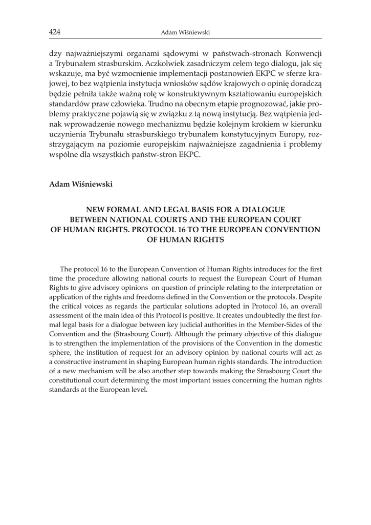 424 Adam Wiśniewski dzy najważniejszymi organami sądowymi w państwach-stronach Konwencji a Trybunałem strasburskim. Aczkolwiek zasadniczym celem tego dialogu, jak się wskazuje, ma być wzmocnienie implementacji postanowień EKPC w sferze krajowej, to bez wątpienia instytucja wniosków sądów krajowych o opinię doradczą będzie pełniła także ważną rolę w konstruktywnym kształtowaniu europejskich standardów praw człowieka. Trudno na obecnym etapie prognozować, jakie problemy praktyczne pojawią się w związku z tą nową instytucją. Bez wątpienia jednak wprowadzenie nowego mechanizmu będzie kolejnym krokiem w kierunku uczynienia Trybunału strasburskiego trybunałem konstytucyjnym Europy, rozstrzygającym na poziomie europejskim najważniejsze zagadnienia i problemy wspólne dla wszystkich państw-stron EKPC. Adam Wiśniewski New Formal and Legal Basis for a Dialogue Between National Courts and the European Court of Human Rights. Protocol 16 to the European Convention of Human Rights The protocol 16 to the European Convention of Human Rights introduces for the first time the procedure allowing national courts to request the European Court of Human Rights to give advisory opinions on question of principle relating to the interpretation or application of the rights and freedoms defined in the Convention or the protocols. Despite the critical voices as regards the particular solutions adopted in Protocol 16, an overall assessment of the main idea of this Protocol is positive. It creates undoubtedly the first formal legal basis for a dialogue between key judicial authorities in the Member-Sides of the Convention and the (Strasbourg Court). Although the primary objective of this dialogue is to strengthen the implementation of the provisions of the Convention in the domestic sphere, the institution of request for an advisory opinion by national courts will act as a constructive instrument in shaping European human rights standards. The introduction of a new mechanism will be also another step towards making the Strasbourg Court the constitutional court determining the most important issues concerning the human rights standards at the European level.