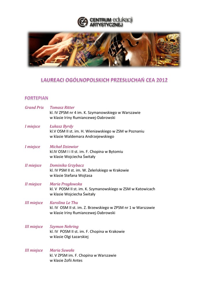 Grand Prix Tomasz Ritter kl. IV ZPSM nr 4 im. K. Szymanowskiego w Warszawie w klasie Iriny Rumiancewej-Dabrowski I miejsce Łukasz Byrdy kl.V OSM II st. im. H. Wieniawskiego w ZSM w Poznaniu w klasie Waldemara Andrzejewskiego I miejsce Michał Dziewior kl.IV OSM I i II st. im. F. Chopina w Bytomiu w klasie Wojciecha Świtały II miejsce Dominika Grzybacz kl. IV PSM II st. im. W. Żeleńskiego w Krakowie w klasie Stefana Wojtasa II miejsce Maria Pragłowska kl. V POSM II st. im. K. Szymanowskiego w ZSM w Katowicach w klasie Wojciecha Świtały III miejsce Karolina Le Thu kl. IV OSM II st. im. Z. Brzewskiego w ZPSM nr 1 w Warszawie w klasie Iriny Rumiancewej-Dabrowski III miejsce Szymon Nehring kl. IV POSM II st. im. F. Chopina w Krakowie w klasie Olgi Łazarskiej III miejsce Maria Suwała kl. V ZPSM im. F. Chopina w Warszawie w klasie Zofii Antes Grand Prix Daniel Strządała kl. IV POSM I i II st. im. S. Moniuszki w Bielsku-Białej w klasie Urszuli Jasieckiej-Bury I miejsce Karolina Danek kl. V PSM II st. im. W. Żeleńskiego w Krakowie w klasie Prof. Elżbiety Stefańskiej II miejsce Karolina Kapela kl. IV POSM II st. im. M. Karłowicza w Poznaniu w klasie Barbary Muchy III miejsce Joanna Jaszczyk kl. IV POSM I i II st. im. S. Moniuszki w Bielsku-Białej w klasie Urszuli Jasieckiej-Bury III miejsce Weronika Kłosiewicz kl. IV OSM II st. im. Z. Brzewskiego w ZPSM nr 1 w Warszawie w klasie Beaty Popis Grand Prix Klara Poznachowska kl. IV POSM I st. im. E. Młynarskiego w ZPSM nr 1 w Warszawie w klasie Aliny Baranowskiej I miejsce Wojciech Trefon kl. V POSM I i II st. im. S./ Moniuszki w Bielsku-Białej w klasie Ewy Jaślar-Walickiej II miejsce Zuzanna Wąsiewicz kl. V OSM I i II st. im. H Wieniawskiego w Łodzi w klasie Doroty Szyszkowskiej-Janiak III miejsce Anna Zemła kl. IV SM I i II st. im. B. Rutkowskiego w Krakowie w klasie Agnieszki Grela III miejsce Aleksandra Augustyn kl. V POSM I i II st. im. S. Moniuszki w Bielsku-Białej w klasie Ewy Jaślar-Walickiej III miejsce Rozalia Dmochowska kl. V POSM nr 1 im. H. Wieniawskiego w Poznaniu w klasie Cecylii Matysik-Ignyś sssssssssssssssssssss III miejsce Julia Łopuszyńska kl. IV II st. ZPSM nr 4 im. K. Szymanowskiego w Warszawie w klasie Anny Sikorzak-Olek III miejsce Amelia Tokarska kl. IV II st. POSM I I II st. im. S. Moniuszki w Bielsku0Białej w klasie Ewy Jaślar-Walickiej Grand Prix Mateusz Makuch kl. V OSM II st. im. H. Wieniawskiego w ZSM w Poznaniu w klasie Bartosza Bryły I miejsce Aleksandra Bucholc kl.V OSM II st. im. Z. Brzewskiego w ZPSM nr 1 w Warszawie w klasie Magdaleny Szczepanowskiej I miejsce Celina Kotz kl. V Poznańskiej OSM II st. um. M. Karłowicza w klasie Kariny Gidaszewskiej I miejsce Roksana Kwaśnikowska kl. V OSM II st. im. Z. Brzewskiego w ZPSM nr 1 w Warszawie w klasie Jana Staniendy II miejsce Ada Dobrowolska kl. IV OSM II st. im. Z. Brzewskiego w ZPSM nr 1 w Warszawie w klasie Andrzeja Gębskiego II miejsce Mateusz Gidaszewski kl. V Poznańskiej OSM II st. im. M. Karłowicza w klasie Kariny Gidaszewskiej II miejsce Krzysztof Katana kl. V POSM I i II st. im. S. Moniuszki w Bielsku Białej w klasie Krzysztofa Stolarza III miejsce Gwidon Ciężarek kl. V ZSM im. F. Nowowiejskiego w Szczecinie w klasie Małgorzaty Gajewskiej-Makulec III miejsce Katarzyna Goliat kl. IV OSM I i II st. im. F. Nowowiejskiego w Gdańsku w klasie Krystyny Jureckiej III miejsce Magdalena Heinz kl. V ZSM im. F. Nowowiejskiego w Szczecinie w klasie Michiłą Cebrija III miejsce Damian Kułakowski kl. V OSM II st. im. Z. Brzewskiego w ZPSM nr 1 w Warszawie w klasie Magdaleny Szczepanowskiej III miejsce Agnieszka Podłucka kl. V OSM II st. im. Z. Brzewskiego w ZPSM nr 1 w Warszawie w klasie Ewy Kowar-Mikołajczyk III miejsce Jan Pietkiewicz kl. V OSM II st. im. Z. Brzewskiego w ZPSM nr 1 w Warszawie w klasie Magdaleny Szczepanowskiej III miejsce Sławomira Wilga kl. V OSM I i II st. im. F. Chopina w Bytomiu w klasie Joanny Cogiel III miejsce Marta Sikora kl. V OSM II st. im. H. Wieniawskiego w ZSM w Poznaniu w klasie Bartosza Bryły I miejsce Katarzyna Denkiewicz kl. V OSM II ST. w ZPSM nr 4 im. K. Szymanowskiego w Warszawie w klasie Ryszarda Duzia I miejsce Katarzyna Średzińska kl. IV PSM II ST. im. R. Bukowskiego we Wrocławiu w klasie Bożeny Nawojskiej II miejsce Ewa Więcek kl. IV ZSM im. I.J. Paderewskiego w Tarnowie w klasie Urszuli Pikusy III miejsce Aleksandra Hładyniuk OSM I i II ST. im. K. Lipińskiego w Lublinie w klasie Teresy Szeli I miejsce Maciej Kułakowski kl. IV OSM I i II st. im. F. Nowowiejskiego w Gdańsku w klasie Jadwigi Ewald I miejsce Adam Mazurek kl. V POSM II st. im. M. Karłowicza w Poznaniu w klasie Stanisława Pokorskiego I miejsce Daria Grzegorz kl. V PSZM im. A. Rubinsteina w Bydgoszczy w klasie Iwony Michalak II miejsce Jakub Dubik kl. IV PSM I i II st. im. F. Chopina w Opolu w klasie Agnieszki Płoszejowskiej II miejsce Mikołaj Wojciechowski kl. IV ZPSM im. K. Wiłkomirskiego w Elblągu w klasie Moniki Juszko III miejsce Agata Bąk kl. V POSM II st. im. K./ Szymanowskiego w Katowicach w klasie Pawła Głombika III miejsce Barbara Warchalewska kl. IV POSM II st. im. M. Karłowicza w Poznaniu w klasie Tomasza Lisieckiego III miejsce Agata Paśnik kl. IV OSM I i II st. im. K. Szymanowskiego we Wrocławiu w klasie Tadeusza Melki III miejsce Krystyna Wiśniewska kl. IV OSM II st. im. Z. Brzewskiego w ZPSM nr 1 w Warszawie w klasie Andrzeja Orkisza III miejsce Tomasz Śmigielski kl. V. ZSM im. F. Chopina w Pile w klasie Antoniny Kasprzak-Górskiej I miejsce Paweł Prucnal kl. IV Niepubliczna SM II st. w Dębicy w klasie Roberta Piękosia I miejsce Rafał Gorczyński kl. IV OSM I i II st. im. F. Nowowiejskiego w Gdańsku w klasie Beaty Leszczyńskiej II miejsce Andrzej Zieliński kl. IV PSM II st. im. J> Elsnera w ZPSM nr 1 w Warszawie w klasie Adama Kotuli II miejsce Michał Kuźnicki kl. IV PSM II st. Im. R. Bukowskiego we Wrocławiu w klasie Tomasza Borskiego III miejsce Piotr Rogacki kl.V ZSM im. 