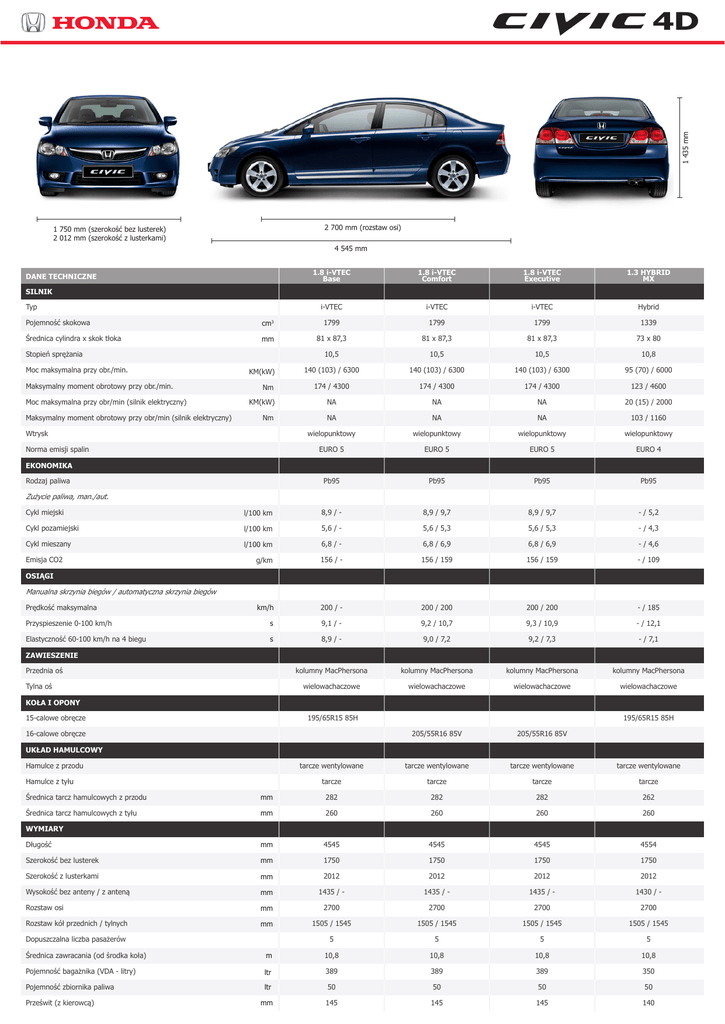 1 435 mm 4D 2 700 mm (rozstaw osi) 1 750 mm (szerokość bez lusterek) 2 012 mm (szerokość z lusterkami) 4 545 mm DANE TECHNICZNE 1.8 i-VTEC Base 1.8 i-VTEC Comfort 1.8 i-VTEC Executive 1.3 HYBRID MX SILNIK i-VTEC i-VTEC i-VTEC Hybrid Pojemność skokowa cm3 1799 1799 1799 1339 Średnica cylindra x skok tłoka mm 81 x 87,3 81 x 87,3 81 x 87,3 73 x 80 10,5 10,5 10,5 10,8 140 (103) / 6300 140 (103) / 6300 140 (103) / 6300 95 (70) / 6000 174 / 4300 174 / 4300 174 / 4300 123 / 4600 KM(kW) NA NA NA 20 (15) / 2000 Nm NA NA NA 103 / 1160 wielopunktowy wielopunktowy wielopunktowy wielopunktowy EURO 5 EURO 5 EURO 5 EURO 4 Pb95 Pb95 Pb95 Pb95 Typ Stopień sprężania Moc maksymalna przy obr./min. Maksymalny moment obrotowy przy obr./min. Moc maksymalna przy obr/min (silnik elektryczny) Maksymalny moment obrotowy przy obr/min (silnik elektryczny) KM(kW) Nm Wtrysk Norma emisji spalin EKONOMIKA Rodzaj paliwa Zużycie paliwa, man./aut. Cykl miejski l/100 km 8,9 / - 8,9 / 9,7 8,9 / 9,7 - / 5,2 Cykl pozamiejski l/100 km 5,6 / - 5,6 / 5,3 5,6 / 5,3 - / 4,3 Cykl mieszany l/100 km 6,8 / - 6,8 / 6,9 6,8 / 6,9 - / 4,6 g/km 156 / - 156 / 159 156 / 159 - / 109 Emisja CO2 OSIĄGI Manualna skrzynia biegów / automatyczna skrzynia biegów km/h 200 / - 200 / 200 200 / 200 - / 185 Przyspieszenie 0-100 km/h s 9,1 / - 9,2 / 10,7 9,3 / 10,9 - / 12,1 Elastyczność 60-100 km/h na 4 biegu s 8,9 / - 9,0 / 7,2 9,2 / 7,3 - / 7,1 kolumny MacPhersona kolumny MacPhersona kolumny MacPhersona kolumny MacPhersona wielowachaczowe wielowachaczowe wielowachaczowe wielowachaczowe 205/55R16 85V 205/55R16 85V tarcze wentylowane tarcze wentylowane tarcze wentylowane tarcze wentylowane Prędkość maksymalna ZAWIESZENIE Przednia oś Tylna oś KOŁA I OPONY 195/65R15 85H 15-calowe obręcze 16-calowe obręcze 195/65R15 85H UKŁAD HAMULCOWY Hamulce z przodu tarcze tarcze tarcze tarcze Średnica tarcz hamulcowych z przodu mm 282 282 282 262 Średnica tarcz hamulcowych z tyłu mm 260 260 260 260 Długość mm 4545 4545 4545 4554 Szerokość bez lusterek mm 1750 1750 1750 1750 Szerokość z lusterkami mm 2012 2012 2012 2012 Wysokość bez anteny / z anteną mm 1435 / - 1435 / - 1435 / - 1430 / - Rozstaw osi mm 2700 2700 2700 2700 Rozstaw kół przednich / tylnych mm 1505 / 1545 1505 / 1545 1505 / 1545 1505 / 1545 Hamulce z tyłu WYMIARY 5 5 5 5 Średnica zawracania (od środka koła) m 10,8 10,8 10,8 10,8 Pojemność bagażnika (VDA - litry) ltr 389 389 389 350 Pojemność zbiornika paliwa ltr 50 50 50 50 mm 145 145 145 140 Dopuszczalna liczba pasażerów Prześwit (z kierowcą) 4D MASY 1.8 I-VTEC Base 1.8 I-VTEC Comfort 1.8 I-VTEC Executive 1.3 HYBRID MX Manualna skrzynia biegów / automatyczna skrzynia biegów Masa własna kg 1194 / - 1194 / 1224 1194 / 1224 - / 1293 Maksymalna masa całkowita kg 1675 / - 1675 / 1705 1675 / 1705 - / 1720 Maksymalna masa przyczepy z hamulcami kg 1200 / - 1200 / 1000 1200 / 1000 NA Maksymalna masa przyczepy bez hamulców kg 500 / - 500 / 500 500 / 500 NA Maksymalny nacisk na hak kg 70 70 70 NA Maksymalny nacisk na dach kg 55 55 55 55 PRZENIESIENIE NAPĘDU oś przednia oś przednia oś przednia oś przednia elektrycznie wspomagany elektrycznie wspomagany elektrycznie wspomagany elektrycznie wspomagany 1 bieg 3,142 / - 3,142 / 2,666 3,142 / 2,666 3,172 - 0,528 2 bieg 1,869 / - 1,869 / 1,534 1,869 / 1,534 - 3 bieg 1,303 / - 1,303 / 1,021 1,303 / 1,021 - 4 bieg 1,054 / - 1,054 / 0,720 1,054 / 0,720 - 5 bieg 0,853 / - 0,853 / 0,524 0,853 / 0,524 - 6 bieg 0,727 / - 0,727 / - 0,727 / - - Bieg wsteczny 3,307 / - 3,307 / 1,956 3,307 / 1,956 4,510 - 1,875 Przełożenie końcowe 4,294 / - 4,294 / 4,437 4,294 / 4,437 3,937 1.8 I-VTEC Base 1.8 I-VTEC Comfort 1.8 I-VTEC Executive 1.3 HYBRID MX ▪ ▪ ▪ ▪ ▪ ◦ ▪ ◦ Napęd Układ kierowniczy Przełożenie (Manualna skrzynia biegów / automatyczna skrzynia biegów) WYPOSAŻENIE TECHNICZNE Silnik 1.8 ltr benzyna 140 KM (Euro 5) 1.3 ltr benzyna 95 KM (Euro 4) Skrzynia biegów Manualna 6-biegowa skrzynia biegów Automatyczna 5-biegowa skrzynia biegów Bezstopniowa skrzynia CVT NADWOZIE Elektrycznie otwierane i uchylane okno dachowe Elektrycznie regulowane i podgrzewane lusterka zewnętrzne Elektrycznie składane lusterka zewnętrzne ▪ ▪ ▪ ▪ ▪ Przednie reflektory ksenonowe typu HID z układem samopoziomującym Spryskiwacze reflektorów Przednie reflektory halogenowe Przednie światła przeciwmgielne Klamki zewnętrzne w kolorze chromu Klamki zewnętrzne w kolorze nadwozia Klamki zewnętrzne w kolorze czarnym Lusterka zewnętrzne w kolorze nadwozia Zewnętrzna antena na dachu Antena dachowa zintegrowana z tylną szybą Spoiler na pokrywie bagażnika Zderzaki w kolorze nadwozia Kierunkowskazy boczne zintegrowane z lusterkami zewnętrznymi FELGI 15” stalowe 16” stalowe ▪ ▪ ▪ ▪ ▪ 15” aluminiowe ▪ ▪ ▪ ▪ ▪ Dojazdowe koło zapasowe Pełnowymiarowe koło zapasowe WNĘTRZE Tapicerka materiałowa Skórzana kierownica Panel konsoli środkowej i kierownicy oraz dźwignia hamulca ręcznego w kolorze srebrnym Panel konsoli środkowej i kierownicy oraz dźwignia hamulca ręcznego w kolorze srebrnym Podświetlenie stacyjki kluczyka ▪ ▪ ▪ ▪ ▪ ▪ ▪ ▪ ▪ ▪ ▪ ▪ ▪ ▪ ▪ ▪ ▪ ▪ ▪ ▪ ▪ ▪ ▪ ▪ ▪ ▪ ▪ ▪ ▪ ▪ 16” aluminiowe ▪ ▪ ▪ ▪ ▪ ▪ ▪ ▪ ◦ ▪ ▪ ▪ ▪ ▪ 4D KOMFORT I UDOGODNIENIA 1.8 I-VTEC Base 1.8 I-VTEC Comfort ▪ ▪ ▪ ▪ ▪ ▪* ▪ ▪ ▪ ▪ ▪ ▪ ▪ ▪ ▪ ▪ ▪* ▪ ▪ ▪ ▪ ▪ ▪ ▪ ▪ ▪ ▪ ▪ ▪ ▪ ▪ ▪ Tempomat sterowany z kierownicy Klimatyzacja automatyczna Klimatyzacja manualna Filtr przeciwpyłkowy Lusterko w osłonie przeciwsłonecznej kierowcy i pasażera Podświetlenie lusterek w osłonach przeciwsłonecznych Podgrzewane fotele przednie Manualnie regulowana wysokość fotela kierowcy Kolumna kierownicy regulowana w dwóch płaszczyznach Elektrycznie regulowane szyby przednie z funkcją automatycznego opuszczania i podnoszenia Elektryc