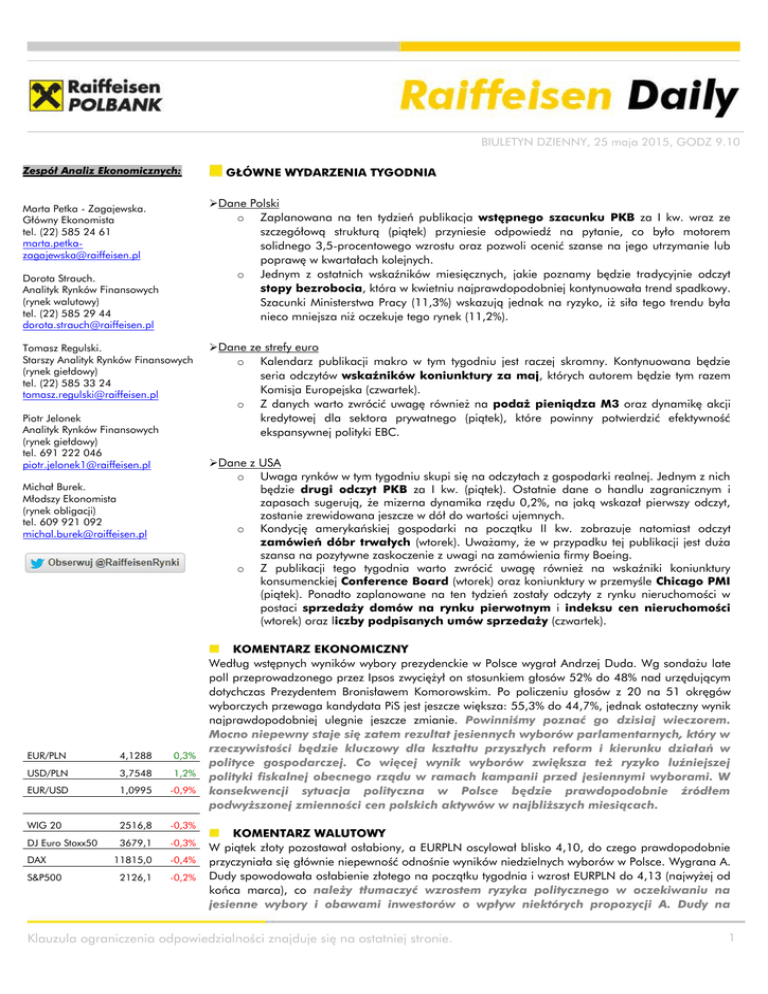 BIULETYN DZIENNY, 25 maja 2015, GODZ 9.10 Zespół Analiz Ekonomicznych: Dane Polski o Zaplanowana na ten tydzień publikacja wstępnego szacunku PKB za I kw. wraz ze szczegółową strukturą (piątek) przyniesie odpowiedź na pytanie, co było motorem solidnego 3,5-procentowego wzrostu oraz pozwoli ocenić szanse na jego utrzymanie lub poprawę w kwartałach kolejnych. o Jednym z ostatnich wskaźników miesięcznych, jakie poznamy będzie tradycyjnie odczyt stopy bezrobocia, która w kwietniu najprawdopodobniej kontynuowała trend spadkowy. Szacunki Ministerstwa Pracy (11,3%) wskazują jednak na ryzyko, iż siła tego trendu była nieco mniejsza niż oczekuje tego rynek (11,2%). Marta Petka - Zagajewska. Główny Ekonomista tel. (22) 585 24 61 [email protected] Dorota Strauch. Analityk Rynków Finansowych (rynek walutowy) tel. (22) 585 29 44 [email protected] Tomasz Regulski. Starszy Analityk Rynków Finansowych (rynek giełdowy) tel. (22) 585 33 24 [email protected] Piotr Jelonek Analityk Rynków Finansowych (rynek giełdowy) tel. 691 222 046 [email protected] EUR/PLN 4,1288 0,3% USD/PLN 3,7548 1,2% EUR/USD 1,0995 -0,9% WIG 20 2516,8 -0,3% DJ Euro Stoxx50 3679,1 -0,3% 11815,0 -0,4% 2126,1 -0,2% S&P500 Dane ze strefy euro o Kalendarz publikacji makro w tym tygodniu jest raczej skromny. Kontynuowana będzie seria odczytów wskaźników koniunktury za maj, których autorem będzie tym razem Komisja Europejska (czwartek). o Z danych warto zwrócić uwagę również na podaż pieniądza M3 oraz dynamikę akcji kredytowej dla sektora prywatnego (piątek), które powinny potwierdzić efektywność ekspansywnej polityki EBC. Dane z USA o Uwaga rynków w tym tygodniu skupi się na odczytach z gospodarki realnej. Jednym z nich będzie drugi odczyt PKB za I kw. (piątek). Ostatnie dane o handlu zagranicznym i zapasach sugerują, że mizerna dynamika rzędu 0,2%, na jaką wskazał pierwszy odczyt, zostanie zrewidowana jeszcze w dół do wartości ujemnych. o Kondycję amerykańskiej gospodarki na początku II kw. zobrazuje natomiast odczyt zamówień dóbr trwałych (wtorek). Uważamy, że w przypadku tej publikacji jest duża szansa na pozytywne zaskoczenie z uwagi na zamówienia firmy Boeing. o Z publikacji tego tygodnia warto zwrócić uwagę również na wskaźniki koniunktury konsumenckiej Conference Board (wtorek) oraz koniunktury w przemyśle Chicago PMI (piątek). Ponadto zaplanowane na ten tydzień zostały odczyty z rynku nieruchomości w postaci sprzedaży domów na rynku pierwotnym i indeksu cen nieruchomości (wtorek) oraz liczby podpisanych umów sprzedaży (czwartek). Michał Burek. Młodszy Ekonomista (rynek obligacji) tel. 609 921 092 [email protected] DAX GŁÓWNE WYDARZENIA TYGODNIA KOMENTARZ EKONOMICZNY Według wstępnych wyników wybory prezydenckie w Polsce wygrał Andrzej Duda. Wg sondażu late poll przeprowadzonego przez Ipsos zwyciężył on stosunkiem głosów 52% do 48% nad urzędującym dotychczas Prezydentem Bronisławem Komorowskim. Po policzeniu głosów z 20 na 51 okręgów wyborczych przewaga kandydata PiS jest jeszcze większa: 55,3% do 44,7%, jednak ostateczny wynik najprawdopodobniej ulegnie jeszcze zmianie. Powinniśmy poznać go dzisiaj wieczorem. Mocno niepewny staje się zatem rezultat jesiennych wyborów parlamentarnych, który w rzeczywistości będzie kluczowy dla kształtu przyszłych reform i kierunku działań w polityce gospodarczej. Co więcej wynik wyborów zwiększa też ryzyko luźniejszej polityki fiskalnej obecnego rządu w ramach kampanii przed jesiennymi wyborami. W konsekwencji sytuacja polityczna w Polsce będzie prawdopodobnie źródłem podwyższonej zmienności cen polskich aktywów w najbliższych miesiącach. KOMENTARZ WALUTOWY W piątek złoty pozostawał osłabiony, a EURPLN oscylował blisko 4,10, do czego prawdopodobnie przyczyniała się głównie niepewność odnośnie wyników niedzielnych wyborów w Polsce. Wygrana A. Dudy spowodowała osłabienie złotego na początku tygodnia i wzrost EURPLN do 4,13 (najwyżej od końca marca), co należy tłumaczyć wzrostem ryzyka politycznego w oczekiwaniu na jesienne wybory i obawami inwestorów o wpływ niektórych propozycji A. Dudy na Klauzula ograniczenia odpowiedzialności znajduje się na ostatniej stronie. 1 BIULETYN DZIENNY, 25 maja 2015, GODZ 9.10 finanse publiczne oraz kondycję gospodarki. Bezpośrednią reakcję na dzisiejszej sesji może nasilać fakt, że największe światowe rynki nie będą pracować (ze względu na święto m.in. w USA, Wielkiej Brytanii i Niemczech). W efekcie wahania EURPLN mogą być zawyżone z uwagi na obniżoną płynność. Z perspektywy analizy technicznej ważnym oporem ponad szczytem z maja przy 4,11 jest właśnie obecny poziom 4,13, gdzie przebiega 38,2% zniesienie spadków z końca grudnia oraz 100-sesyjna średnia ruchoma. Bariera ta może zahamować dalsze wzrosty pary o ile nie nastąpi jednoczesne pogorszenie nastrojów na rynkach zagranicznych. W średnim terminie należy natomiast oczekiwać utrzymania podwyższonego ryzyka politycznego. Wygrana A. Dudy zapowiada bowiem gorącą kampanię przed wyborami parlamentarnymi na jesieni. W przełożeniu na EURPLN nie powinno to jednak oznaczać trwałego ruchu w górę, a raczej stanowić potencjalne, kolejne źródło zmienności, zwłaszcza na III i IV kwartał roku (np. obok polityki EBC i Fed). Jest to jednocześnie znacznie mniejszy czynnik ryzyka dla notowań polskiej waluty niż perspektywa wzrostu stóp procentowych w USA w II połowie roku i potencjalnego odpływu kapitału z Polski z tego powodu. Piątkowe notowania przyniosły też ważne zmiany w notowaniach par dolarowych. Choć dane o inflacji z USA zazwyczaj powodują niewielką reakcję rynku, piątkowy odczyt o godz. 14.30 zbiegł się z wyraźnym umocnieniem USD, przy braku innych istotnych informacji, które mogły wywołać taki ruch. Dynamika inflacji CPI w kwietniu pozostała ujemna i wyniosła -0,2%r/r (niżej niż ocze