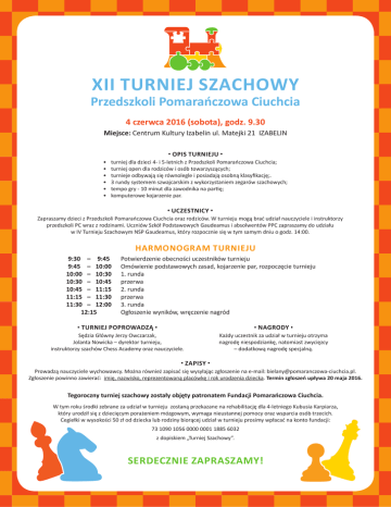 XII TURNIEJ SZACHOWY Przedszkoli Pomarańczowa Ciuchcia 4 czerwca 2016 (sobota), godz. 9.30 Miejsce: Centrum Kultury Izabelin ul. Matejki 21 IZABELIN • • • • • • • OPIS TURNIEJU • t urniej dla dzieci 4- i 5-letnich z Przedszkoli Pomarańczowa Ciuchcia; turniej open dla rodziców i osób towarzyszących; turnieje odbywają się równolegle i posiadają osobną klasyfikację;. 3 rundy systemem szwajcarskim z wykorzystaniem zegarów szachowych; tempo gry - 10 minut dla zawodnika na partię; komputerowe kojarzenie par. • UCZESTNICY • Zapraszamy dzieci z Przedszkoli Pomarańczowa Ciuchcia oraz rodziców. W turnieju mogą brać udział nauczyciele i instruktorzy przedszkoli PC wraz z rodzinami. Uczniów Szkół Podstawowych Gaudeamus i absolwentów PPC zapraszamy do udziału w IV Turnieju Szachowym NSP Gaudeamus, który rozpocznie się w tym samym dniu o godz. 14:00. HARMONOGRAM TURNIEJU 9:30 – 9:45 9:45 – 10:00 10:00 – 10:30 10:30 – 10:45 10:45 – 11:15 11:15 – 11:30 11:30 – 12:00 12:15 • Potwierdzenie obecności uczestników turnieju Omówienie podstawowych zasad, kojarzenie par, rozpoczęcie turnieju 1. runda przerwa 2. runda przerwa 3. runda Ogłoszenie wyników, wręczenie nagród TURNIEJ POPROWADZĄ • • Sędzia Główny Jerzy Owczarzak, Jolanta Nowicka – dyrektor turnieju, instruktorzy szachów Chess Academy oraz nauczyciele. • NAGRODY • Każdy uczestnik za udział w turnieju otrzyma nagrodę niespodziankę, natomiast zwycięzcy – dodatkową nagrodę specjalną. ZAPISY • Prowadzą nauczyciele wychowawcy. Można również zapisać się wysyłając zgłoszenie na e-mail: [email protected]. Zgłoszenie powinno zawierać: imię, nazwisko, reprezentowaną placówkę i rok urodzenia dziecka. Termin zgłoszeń upływa 20 maja 2016. Tegoroczny turniej szachowy zostały objęty patronatem Fundacji Pomarańczowa Ciuchcia. W tym roku środki zebrane za udział w turnieju zostaną przekazane na rehabilitację dla 4-letniego Kubusia Karpiarza, który urodził się z dziecięcym porażeniem mózgowym, wymaga nieustannej pomocy oraz wsparcia osób trzecich. Cegiełki w wysokości 50 zł od dziecka lub rodziny biorącej udział w turnieju prosimy wpłacać na konto fundacji: 73 1090 1056 0000 0001 1885 6032 z dopiskiem „Turniej Szachowy”. SERDECZNIE ZAPRASZAMY!