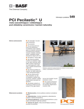 Informacje o produkcie PCI Pecilastic® U 549 mata uszczelniająca i oddzielająca pod okładziny ceramiczne i kamień naturalny Zakres zastosowania Do wewnątrz i na zewnątrz budynków. Na posadzki. Do pomieszczeń mokrych nie narażonych na działanie wody napierającej, np. łazienki, prysznice w budownictwie mieszkaniowym, hotelach, domach opieki i szpitalach (klasa obciążenia wilgocią A0 i A). Na balkony i tarasy (B0). Na chłonne podłoża wrażliwe na działanie wilgoci, np. płyty wiórowe, płyty OSB, wylewki magnezytowe, płyty gipsowe z włóknami, wylewki anhydrytowe i gipsowe. Na chłonne podłoża mineralne, np. beton, jastrychy i masy samopoziomujące. Na nie chłonne podłoża mineralne: np. stare okładziny z płytek ceramicznych, wylewki z asfaltu lanego (tylko wewnątrz budynków) Na świeże wylewki cementowe (o klasie przynajmniej CT-F4), gdy można Właściwości produktu Okładziny ceramiczne można skutecznie wyklejać na macie uszczelniającej i oddzielającej PCI Pecilastic U. już po nich chodzić i są odpowiednio nośne. Na wylewki anhydrytowe o wilgotności poniżej 2% (pomiar wilgotnościomierzem CM). Wodoszczelna, chroni podłoża wrażliwe na działanie wilgoci. Odkształcalna, niweluje naprężenia, odkształcenia podłoża i wahania temperatury. Przenosi pęknięcia, wysokie bezpieczeństwo w przypadku późniejszych pęknięć podłoża. Gotowa do użycia, matę uszczelniającą wystarczy przykleić do podłoża. Właściwości produktu Szybka gotowość do prowadzenia dalszych prac, po przyklejeniu maty uszczelniającej można na niej układać płytki ceramiczne i kamienne. Wytłumia odgłosy chodzenia, znaczne wyciszenie pomieszczenia i wytłumia odgłosy chodzenia po okładzinach ceramicznych i z kamienia naturalnego. Dane odnośnie użycia / dane techniczne: Dane materiałowo-technologiczne Baza materiałowa specjalna folia polietylenowa dwustronnie kaszerowana włókniną Poprawa tłumienia odgłosów (Norma EN ISO 140-8) ok. 8 dB Ciężar powierzchniowy ok. 4 kg/m2 Barwa włókniny pomarańczowa Składowanie na stojąco, w miejscu suchym Trwałość składowania min. 24 miesiące; Nie składować długotrwale powyżej +30 °C. Forma dostawy rolka 5 m; szerokość 1,00 m, grubość ok. 0,5 cm nr art./znak kontrolny EAN 3159/09 Dane o technice stosowania Temperatura użycia +5 °C do +30 °C Odporność temperaturowa -20 °C do +80 °C * Przy +23 °C i 50 % względnej wilgotności powietrza. Wyższe temperatury skracają, niższe wydłużają podane czasy. Przygotowanie podłoża Podłoże musi być twarde, czyste i nośne. Dokładnie usunąć plamy z oleju, powłoki pogarszające przyczepność i zanieczyszczenia. Podłoże musi być równe. Podłoża muszą spełniać wymogi normy 18 560 i nadawać się do wyklejania okładzin ceramicznych i z kamienia naturalnego. Mocno chłonne podłoża cementowe zagruntować środkiem PCI Gisogrund, rozcieńczonym z wodą w proporcji 1 : 1. Przeszlifowane wylewki anhydrytowe/ gipsowe, gipsowe płyty jastrychowe i wylewki z asfaltu lanego zagruntować nierozcieńczonym środkiem PCI Gisogrund. W przypadku napiętego harmonogramu prac, podłoża cementowe i gipsowe zagruntować środkiem PCI Gisogrund Rapid. Poczekać do wyschnięcia gruntu. Wilgotność wylewek anhydryto- wych/gipsowych nie może przekraczać 2% (pomiar wilgotnościomierzem CM). Aby uniknąć powstawania mostków akustycznych przed wyklejeniem maty PCI Pecilastic U na styku ściany i posadzki oraz przy słupach itp. należy przykleić samoprzylepną taśmę izolacyjną PCI Pecitape Silent. Stare wykładziny podłogowe W przypadku wymiany starych wykładzin podłogowych (np. wykładzin dywanowych, PVC i linoleum) na okładzinę ceramiczną lub z kamienia naturalnego należy usunąć starą wykładzinę i pozostałości kleju. Następnie całą oczyszczoną powierzchnię (bez pozostałości kleju) zagruntować środkiem PCI Gisogrund. Po wyschnięciu gruntu ubytki, dziury i pęknię- cia wypełnić odpowiednim materiałem naprawczym do uzyskania równej powierzchni. W razie konieczności pozostałe nierówności można wyrównać za pomocą wylewki cementowej. Przed wyklejaniem mat PCI Pecilastic U posadzka musi być równa. Przygotowanie podłoża Stare okładziny z płytek ceramicznych, kamienia syntetycznego i naturalnego Warunkiem wyklejenia maty PCI Pecilastic U na starej okładzinie ceramicznej lub z kamienia naturalnego jest jej dobra przyczepność. Odspojone płytki należy usunąć, a puste miejsca wypełnić odpowiednim materiałem wypełniającym. Duże powierzchnie zagruntować za pomocą PCI Gisogrund 404 i wyrównać cementową masa wyrównawczą. Sposób użycia 1 Rozłożyć PCI Pecilastic U i za pomocą nożyka lub nożyczek dociąć na odpowiedni wymiar. 2a Na przygotowane podłoże nanieść elastyczną zaprawę klejową, zgodnie ze sztuką budowlaną za pomocą pacy zębatej 4 mm lub 6 mm. 2b W przypadku wylewek anhydrytowych o wilgotności od 0,5% do 2% do przyklejenia mat PCI Pecilastic U na przeszlifowanym i zagruntowanym podłożu należy użyć PCI Lastogum. PCI Lastogum należy nanieść w grubszej warstwie wałkiem lub pędzlem, bądź pacą zębatą 3 mm. 3 W ciągu czasu otwartego naniesionego kleju (do ok. 30 minut) , lub PCI Lastogum (do ok. 20 minut) ułożyć i docisnąć maty PCI Pecilastic U (pomarańczową włókniną do góry). 4a W pomieszczeniach suchych połączenia skleić taśmą (np. Tesakrepp o szer. 20 mm). Stare podłogi drewniane Drewniana konstrukcja musi być wystarczająco nośna, stabilna i nieuszkodzona przez szkodniki. W razie konieczności przykręcić luźne deski. Nierówną podłogę z desek wyrównać w następujący sposób: Szczeliny w deskach wypełnić szczeliwem PCI Adaptol i odczekać do stwardnienia powierzchni szczeliwa (ok. 1 godzina). Podłogę zagruntować dwukrotnie środkiem PCI Gisogrund 404 (rozcieńczonym w proporcji 1 : 1 z wodą), poczekać do wy- 4b W pomieszczeni
