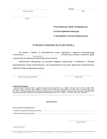 Konin, …………………………………. ………………………………………………………………. (imię i nazwisko) (data) ……………………………………………….…………… (klasa) Przewodniczący Rady Pedagogicznej Liceum Ogólnokształcącego w Konińskim Centrum Edukacyjnym WNIOSEK O PROMOCJĘ WARUNKOWĄ W związku z faktem, iż otrzymałem/am ocenę negatywną z egzaminu poprawkowego z przedmiotu...................................................................................................................... zwracam się z prośbą o wyrażenie zgody (nawa przedmiotu) na promocję warunkową do klasy programowo wyższej. Jednocześnie zobowiązuję się powstałe zaległości programowe z przedmiotu, z którego otrzymałem/am ocenę niedostateczną i nie poprawiłem/am tej oceny egzaminem poprawkowym, nadrobić w klasie programowo wyższej. ................................................................................ ................................................................................ (podpis rodzica/opiekuna prawnego) (podpis ucznia) PODSTAWA PRAWNA 1. Ustawa z dnia 7 września 1991r. o systemie oświaty. / tekst jednolity: Dz. U. z 1996r. nr 67, poz. 329, nr 106, poz. 496 z 997r. nr 28, poz. 153 i nr 141, poz. 943 z 1998r. nr 117,poz. 759 i nr 162, poz. 1126 z 2000r. nr 12 poz. 136, nr 19, poz. 239 i nr 48, poz. 550. 2. Rozporządzenie Ministra Edukacji Narodowej z dnia 30 kwietnia 2007r. w sprawie zasad oceniania, klasyfikowaniai promowania uczniów i słuchaczy oraz przeprowadzania egzaminów, Dz. U. z 2007r. nr 83 ,poz. 562 z póź. zmianami. Wypełnia dyrektor Decyzja Rady Pedagogicznej*: • wyrażono zgodę na promocję do klasy .................................................. .............................................................................................. • odmowna decyzja z powodu: .................................................................................................................................................................... .......................................................................... (podpis dyrektora) niepotrzebne skreślić LO w KCE tel. (63) 242-97-29 www.xlo.lm.pl e-mail: [email protected]