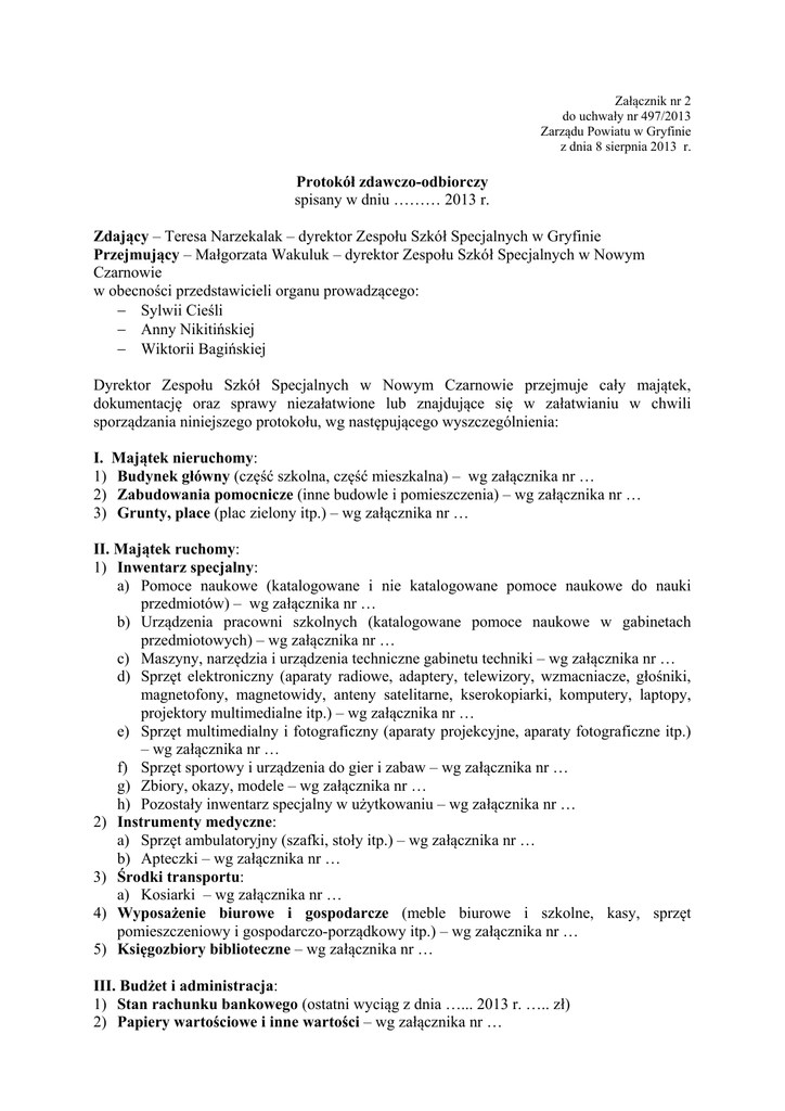 Załącznik nr 2 do uchwały nr 497/2013 Zarządu Powiatu w Gryfinie z dnia 8 sierpnia 2013 r. Protokół zdawczo-odbiorczy spisany w dniu ……… 2013 r. Zdający – Teresa Narzekalak – dyrektor Zespołu Szkół Specjalnych w Gryfinie Przejmujący – Małgorzata Wakuluk – dyrektor Zespołu Szkół Specjalnych w Nowym Czarnowie w obecności przedstawicieli organu prowadzącego: Sylwii Cieśli Anny Nikitińskiej Wiktorii Bagińskiej Dyrektor Zespołu Szkół Specjalnych w Nowym Czarnowie przejmuje cały majątek, dokumentację oraz sprawy niezałatwione lub znajdujące się w załatwianiu w chwili sporządzania niniejszego protokołu, wg następującego wyszczególnienia: I. 1) 2) 3) Majątek nieruchomy: Budynek główny (część szkolna, część mieszkalna) – wg załącznika nr … Zabudowania pomocnicze (inne budowle i pomieszczenia) – wg załącznika nr … Grunty, place (plac zielony itp.) – wg załącznika nr … II. Majątek ruchomy: 1) Inwentarz specjalny: a) Pomoce naukowe (katalogowane i nie katalogowane pomoce naukowe do nauki przedmiotów) – wg załącznika nr … b) Urządzenia pracowni szkolnych (katalogowane pomoce naukowe w gabinetach przedmiotowych) – wg załącznika nr … c) Maszyny, narzędzia i urządzenia techniczne gabinetu techniki – wg załącznika nr … d) Sprzęt elektroniczny (aparaty radiowe, adaptery, telewizory, wzmacniacze, głośniki, magnetofony, magnetowidy, anteny satelitarne, kserokopiarki, komputery, laptopy, projektory multimedialne itp.) – wg załącznika nr … e) Sprzęt multimedialny i fotograficzny (aparaty projekcyjne, aparaty fotograficzne itp.) – wg załącznika nr … f) Sprzęt sportowy i urządzenia do gier i zabaw – wg załącznika nr … g) Zbiory, okazy, modele – wg załącznika nr … h) Pozostały inwentarz specjalny w użytkowaniu – wg załącznika nr … 2) Instrumenty medyczne: a) Sprzęt ambulatoryjny (szafki, stoły itp.) – wg załącznika nr … b) Apteczki – wg załącznika nr … 3) Środki transportu: a) Kosiarki – wg załącznika nr … 4) Wyposażenie biurowe i gospodarcze (meble biurowe i szkolne, kasy, sprzęt pomieszczeniowy i gospodarczo-porządkowy itp.) – wg załącznika nr … 5) Księgozbiory biblioteczne – wg załącznika nr … III. Budżet i administracja: 1) Stan rachunku bankowego (ostatni wyciąg z dnia …... 2013 r. ….. zł) 2) Papiery wartościowe i inne wartości – wg załącznika nr … 3) 4) 5) 6) Druki ścisłego zarachowania – wg załącznika nr … Należności według stanu na dzień ….. Zobowiązania według stanu na dzień ….. Stan księgowości (podać datę i numery porządkowe pozycji ostatnich zapisów w księdze rachunkowej i urządzeniach analitycznych) … 7) Pieczęcie podlegające ścisłej ewidencji: załącznik – zeszyt pieczęci aktualnych, zgodnych z protokołem przekazania z dnia … 8) Dokumenty podlegające ścisłej ewidencji – według załączników za poszczególne lata: a) katalogi roczne za poszczególne lata b) odpisy świadectw c) protokoły egzaminów d) protokoły rady pedagogicznej itd. 9) Teczki bieżących akt pracowniczych – wg załącznika nr … 10) Archiwum – wg załącznika nr … IV. Zakładowy Fundusz Świadczeń Socjalnych 1) Stan rachunku bankowego (ostatni wyciąg z banku z dnia ….. 2013 r. … zł) 2) Gotówka w kasie ZFŚS – wg załącznika nr … 3) Papiery wartościowe i inne wartości – wg załącznika nr… 4) Należności według stanu na dzień … 5) Zobowiązania według stanu na dzień … V. Pozostałe 1) Wykaz spraw niezałatwionych 2) Różnice inwentaryzacyjne (podać oddzielnie nadwyżki i braki w środkach podstawowych i materiałach) Uwagi: Protokół sporządzono w trzech jednobrzmiących egzemplarzach. Zdający Przejmujący Główny księgowy Podpisy przedstawicieli organu prowadzącego: – Sylwia Cieśla …………………………………… – Anna Nikitińska …………………………………… – Wiktoria Bagińska ……………………………………