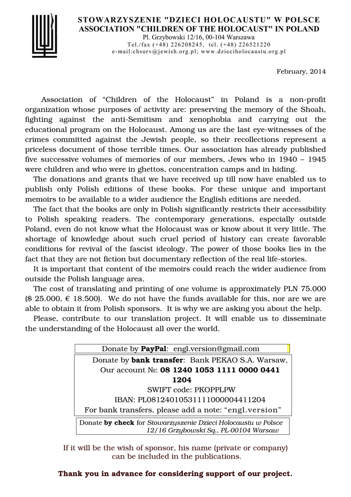 STOWARZYSZENIE "DZIECI HOLOCAUSTU" W POLSCE ASSOCIATION "CHILDREN OF THE HOLOCAUST" IN POLAND Pl. Grzybowski 12/16, 00-104 Warszawa T el./ fa x ( +4 8 ) 2 2 6 2 0 8 2 4 5 , te l. ( +4 8 ) 2 2 6 5 2 1 2 2 0 e- mai l: c hs u r v @j e wi s h.o r g.p l; www. d z ie ci ho lo ca u st u.o r g.p l February, 2014 Association of “Children of the Holocaust” in Poland is a non-profit organization whose purposes of activity are: preserving the memory of the Shoah, fighting against the anti-Semitism and xenophobia and carrying out the educational program on the Holocaust. Among us are the last eye-witnesses of the crimes committed against the Jewish people, so their recollections represent a priceless document of those terrible times. Our association has already published five successive volumes of memories of our members, Jews who in 1940 – 1945 were children and who were in ghettos, concentration camps and in hiding. The donations and grants that we have received up till now have enabled us to publish only Polish editions of these books. For these unique and important memoirs to be available to a wider audience the English editions are needed. The fact that the books are only in Polish significantly restricts their accessibility to Polish speaking readers. The contemporary generations, especially outside Poland, even do not know what the Holocaust was or know about it very little. The shortage of knowledge about such cruel period of history can create favorable conditions for revival of the fascist ideology. The power of those books lies in the fact that they are not fiction but documentary reflection of the real life-stories. It is important that content of the memoirs could reach the wider audience from outside the Polish language area. The cost of translating and printing of one volume is approximately PLN 75.000 ($ 25.000, € 18.500). We do not have the funds available for this, nor are we are able to obtain it from Polish sponsors. It is why we are asking you about the help. Please, contribute to our translation project. It will enable us to disseminate the understanding of the Holocaust all over the world. OooooDonate by PayPal: [email protected] i Donate by bank transfer: Bank PEKAO S.A. Warsaw, Our account №: 08 1240 1053 1111 0000 0441 1204 SWIFT code: PKOPPLPW IBAN: PL08124010531111000004411204 For bank transfers, please add a note: “engl.version” Donate by check for Stowarzyszenie Dzieci Holocaustu w Polsce 12/16 Grzybowski Sq., PL-00104 Warsaw If it will be the wish of sponsor, his name (private or company) can be included in the publications. Thank you in advance for considering support of our project.