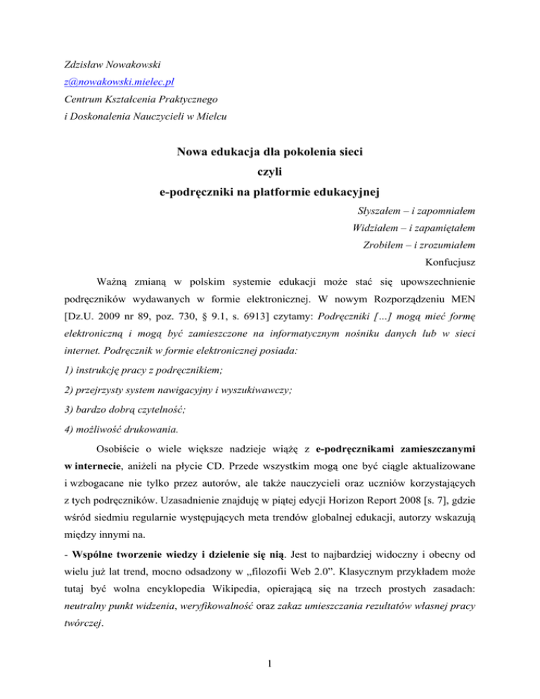 Zdzisław Nowakowski [email protected] Centrum Kształcenia Praktycznego i Doskonalenia Nauczycieli w Mielcu Nowa edukacja dla pokolenia sieci czyli e-podręczniki na platformie edukacyjnej Słyszałem – i zapomniałem Widziałem – i zapamiętałem Zrobiłem – i zrozumiałem Konfucjusz Ważną zmianą w polskim systemie edukacji może stać się upowszechnienie podręczników wydawanych w formie elektronicznej. W nowym Rozporządzeniu MEN [Dz.U. 2009 nr 89, poz. 730, § 9.1, s. 6913] czytamy: Podręczniki […] mogą mieć formę elektroniczną i mogą być zamieszczone na informatycznym nośniku danych lub w sieci internet. Podręcznik w formie elektronicznej posiada: 1) instrukcję pracy z podręcznikiem; 2) przejrzysty system nawigacyjny i wyszukiwawczy; 3) bardzo dobrą czytelność; 4) możliwość drukowania. Osobiście o wiele większe nadzieje wiążę z e-podręcznikami zamieszczanymi w internecie, aniżeli na płycie CD. Przede wszystkim mogą one być ciągle aktualizowane i wzbogacane nie tylko przez autorów, ale także nauczycieli oraz uczniów korzystających z tych podręczników. Uzasadnienie znajduję w piątej edycji Horizon Report 2008 [s. 7], gdzie wśród siedmiu regularnie występujących meta trendów globalnej edukacji, autorzy wskazują między innymi na. - Wspólne tworzenie wiedzy i dzielenie się nią. Jest to najbardziej widoczny i obecny od wielu już lat trend, mocno odsadzony w „filozofii Web 2.0”. Klasycznym przykładem może tutaj być wolna encyklopedia Wikipedia, opierającą się na trzech prostych zasadach: neutralny punkt widzenia, weryfikowalność oraz zakaz umieszczania rezultatów własnej pracy twórczej. 1 - Łączenie się ludzi poprzez sieć. Tworzenie społeczności internetowych w globalnej gospodarce niesie oczywiście wiele korzyści, ale także wiele zagrożeń – szczególnie wśród tej młodszej części naszego społeczeństwa. Jednym z nich jest na przykład osłabienie więzi międzyludzkich. - Upowszechnianie elektronicznych platform edukacyjnych. Szybki rozwój technologii teleinformatycznych oraz systematycznie tworzone materiały szkoleniowe umożliwią dostęp do zasobów edukacyjnych w każdym miejscu i czasie. Pokolenie sieci Z właściwym zrozumieniem powinniśmy także odczytać wybrane fragmenty „nowej” podstawy programowej [Dz.U. 2009 nr 4, poz. 17, s. 270], w której wśród ośmiu najważniejszych umiejętności zdobywanych przez ucznia w trakcie kształcenia ogólnego na III i IV poziomie edukacyjnym (gimnazjum i szkoła ponadgimnazjalna) wymieniono: 5) umiejętność sprawnego posługiwania się nowoczesnymi technologiami informacyjnokomunikacyjnymi; 6) umiejętność wyszukiwania, selekcjonowania i krytycznej analizy informacji; 7) umiejętność rozpoznawania własnych potrzeb edukacyjnych oraz uczenia się; 8) umiejętność pracy zespołowej. Brzmi to nad wyraz poprawnie, ale czy mamy pomysł jak poprawić nasz system edukacji, abyśmy rzeczywiście potrafili ukształtować w uczniach te umiejętności? Czy jest to tylko obowiązek szkoły? Zapewne nie, tym bardziej, że następuje coraz większy rozdźwięk pomiędzy postrzeganiem rzeczywistości przez dorosłych (nauczycieli) oraz dzieci i młodzież (uczniów). Okazuje się bowiem, jak wynika z badań przeprowadzonych przez Ośrodek Badań Młodzieży Uniwersytetu Warszawskiego, że młodzież najczęściej informacji na interesujące ją tematy poszukuje w internecie (77%), nieco rzadziej w prasie i książkach (63%) i telewizji (60%). Te kanały dystrybucji praktycznie wyczerpują listę źródeł informacji wykorzystywanych przez młodych ludzi, tym bardziej, że tylko 19% uczniów uznaje nauczycieli za ważne źródło informacji [Fatyga, 2005, s.133, wykres 67]. Faktem zatem stały się nieformalne narodziny „Pokolenia Sieci” (ang. Net Generation), dla którego naturalnym środowiskiem życia stał się komputer i internet [Tapscott, 1998]. „Tapscott przekonuje, że innowacyjność to naturalny stan mentalny dzieci sieci […]. Ceni ona sobie szybkość, lubi rozwiązywać problemy metodą współpracy, pragnie, by praca byłą częścią zabawy. Wartością nadrzędną jest wolność, którą daje przestrzeń 2 internetu. To ona także zapewnia kontrolę nad światem – dzieci sieci nie są biernymi konsumentami, lecz prosumentami – aktywnie współtworzą produkty i usługi, tak by optymalnie pasowały do osobistych gustów, i nie rozumieją, jak rodzice mogą pochłaniać zuniformizowaną, przeżutą papkę dostarczaną przez medialne korporacje”. […] Sieciaki lepiej niż dorośli rozumieją, że rzeczywistość, do jakiej przygotowuje ich szkoła, dawno już nie istnieje, że większość zawodów, o jakich marzą dla swoich pociech rodzice, nie będzie istnieć za dziesięć lat, a w ich miejsce pojawią się profesje, których nazw dziś jeszcze nie znamy” [Bendyk, 2009]. Pozytywnie w tym kontekście prezentuje się ta grupa nauczycieli, która rozumie, że sukces polskiej szkoły polega przede wszystkim na współdziałaniu z pokoleniem cyfrowym w realizacji ich życiowych aspiracji. „Nauczyciele nowej ery wymieniają się doświadczeniami, materiałami i szukają kolejnych propozycji. Nie udają, że wszystko wiedzą. Rozumieją, że uczniowie poszukują informacji w sieci, a nie w szkole” [Kołodziejczyk, 2009]. Koniecznością zatem staje się budowanie społecznościowych portali edukacyjnych integrujących uczniów, nauczycieli i rodziców poprzez swobodną wymianę informacji oraz oferujących szeroki zakres materiałów dydaktycznych i pedagogicznych – między innymi w formie e-podręczników. Przykład e-podręcznika umieszczonego na platformie Moodle Stosowane obecnie rozwiązania dotyczące e-podręczników opierają się na umieszczaniu ich na platformach edukacyjnych. Jedną z nich, jest powszechnie stosowana w wielu polskich szkołach platforma Moodle (ang. Modular Object-Oriented Dynamic Learning 
