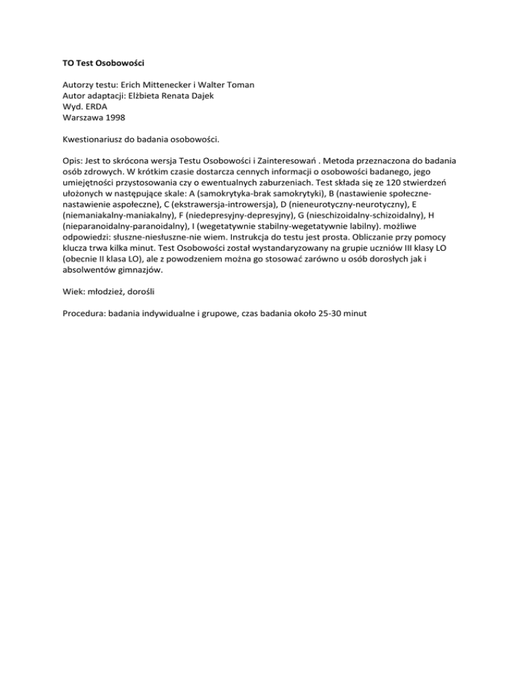 TO Test Osobowości Autorzy testu: Erich Mittenecker i Walter Toman Autor adaptacji: Elżbieta Renata Dajek Wyd. ERDA Warszawa 1998 Kwestionariusz do badania osobowości. Opis: Jest to skrócona wersja Testu Osobowości i Zainteresowań . Metoda przeznaczona do badania osób zdrowych. W krótkim czasie dostarcza cennych informacji o osobowości badanego, jego umiejętności przystosowania czy o ewentualnych zaburzeniach. Test składa się ze 120 stwierdzeń ułożonych w następujące skale: A (samokrytyka-brak samokrytyki), B (nastawienie społecznenastawienie aspołeczne), C (ekstrawersja-introwersja), D (nieneurotyczny-neurotyczny), E (niemaniakalny-maniakalny), F (niedepresyjny-depresyjny), G (nieschizoidalny-schizoidalny), H (nieparanoidalny-paranoidalny), I (wegetatywnie stabilny-wegetatywnie labilny). możliwe odpowiedzi: słuszne-niesłuszne-nie wiem. Instrukcja do testu jest prosta. Obliczanie przy pomocy klucza trwa kilka minut. Test Osobowości został wystandaryzowany na grupie uczniów III klasy LO (obecnie II klasa LO), ale z powodzeniem można go stosować zarówno u osób dorosłych jak i absolwentów gimnazjów. Wiek: młodzież, dorośli Procedura: badania indywidualne i grupowe, czas badania około 25-30 minut