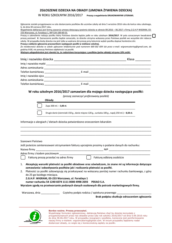 ZGŁOSZENIE DZIECKA NA OBIADY (UMOWA ŻYWIENIA DZIECKA) W ROKU SZKOLNYM 2016/2017 Proszę o wypełnienie DRUKOWANYMI LITERAMI. Zgłoszenie zostało przygotowane w celu dostarczania posiłków dla uczniów szkoły od dnia 5 września 2016 roku do końca roku szkolnego, tj. do dnia 30 czerwca 2017 roku. Wypełnienie deklaracji jest formą zawarcia umowy dotyczącą żywienia dziecka w okresie 09.2016 – 06.2017 z firmą Z.G.H.P WIGRAM, 03233 Warszawa, ul. Faradaya 1, NIP 524-100-60-53. Proszę o zakreślenie rodzaju posiłku który Państwa dziecko będzie jadło w roku szkolnym 2016/2017. W polu oznaczonym kwadratem proszę postawić X. Zaznaczenie posiłku będzie oznaczało, że dziecko otrzyma wskazany przez Państwa posiłek we wszystkie dni robocze szkoły. W przypadku kiedy dziecko ma jeść tylko w wybrane dni proszę przy kolumnie wybór posiłku dopisać konkretne dni. Proszę o oddanie zgłoszenia pracownikom wydającym posiłki w stołówce szkolnej. Za nieobecności dziecka w szkole zgłoszone telefonicznie pod numerem 669 302 604 lub przez e-mail: [email protected], do godziny 9:00, nie ponoszą Państwo odpłatności za posiłki. Ważnym udogodnieniem jest również to, że rodzeństwo korzystające z posiłków (pełne obiady) otrzyma 10% zniżki. Imię i nazwisko dziecka __________________________________________ Klasa _________ Imię i nazwisko matki _________________________________________________________________________ Adres zamieszkania __________________________________________________________________________ Telefon komórkowy _________________________ E-mail ___________________________________________ Imię i nazwisko ojca __________________________________________________________________________ Adres zamieszkania __________________________________________________________________________ Telefon komórkowy _________________________ E-mail ___________________________________________ W roku szkolnym 2016/2017 zamawiam dla mojego dziecka następujące posiłki: (proszę zaznaczyć preferowany posiłek) Obiady Zupa 300 ml. – 3,00 zł. Drugie danie (ziemniaki 150 g., danie mięsne 120 g., surówka 100 g., napój 250 ml.) – 8,50 zł. Informacje o alergiach / dietach dziecka potwierdzone orzeczeniem lekarskim ___________________________________________________________________________________________ ___________________________________________________________________________________________ ___________________________________________________________________________________________ Szanowni Państwo Jeśli jesteście zainteresowani otrzymaniem faktury uprzejmie prosimy o podanie danych do rachunku: Nazwa firmy _______________________________________________ NIP _____________________________ Adres firmy z kodem pocztowym _______________________________________________________________ Fakturę proszę przesłać na adres firmy Fakturę odbiorę osobiście 1. Akceptuję warunki płatności za posiłki obiadowe oraz oświadczam, że znane mi są informacje dotyczące zamawiania i odwoływania posiłków jak i rozliczenia płatności za posiłki. 2. Płatności za posiłki zobowiązuję się przekazywać na wskazany poniżej numer rachunku bankowego, z góry do 25-go każdego miesiąca. Z.G.H.P. WIGRAM, 03-233 Warszawa, ul. Faradaya 1 numer rachunku 54 1240 6074 1111 0000 4998 2693 PEKAO S.A. Wyrażam zgodę na przetwarzanie podanych danych osobowych dla potrzeb marketingowych firmy. Warszawa, dnia _____________ Czytelny podpis rodzica / opiekuna prawnego ________________________ Brak podpisu skutkuje odrzuceniem zgłoszenia Bardzo ważne. Proszę przeczytać. Wypełniając formularz zgłoszeniowy, deklarują Państwo chęć by dziecko korzystało z przygotowywanych przez nas obiadów przez cały rok szkolny 2016/2017 od dnia 5.09.2016 roku do dnia 30.06.2017 roku. W przypadku rezygnacji z posiłków, konieczne jest poinformowanie naszej firmy e-mailem: [email protected]. W innym przypadku będziemy nadal dostarczać obiady, co wiąże się z koniecznością zapłaty za posiłki.