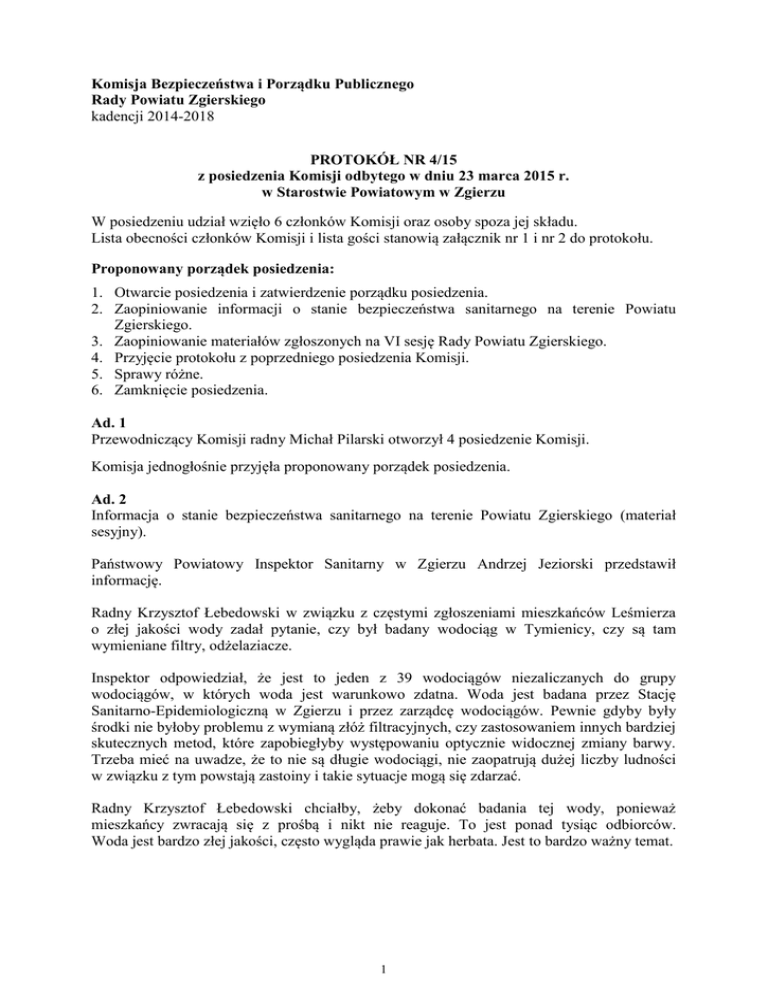 Komisja Bezpieczeństwa i Porządku Publicznego Rady Powiatu Zgierskiego kadencji 2014-2018 PROTOKÓŁ NR 4/15 z posiedzenia Komisji odbytego w dniu 23 marca 2015 r. w Starostwie Powiatowym w Zgierzu W posiedzeniu udział wzięło 6 członków Komisji oraz osoby spoza jej składu. Lista obecności członków Komisji i lista gości stanowią załącznik nr 1 i nr 2 do protokołu. Proponowany porządek posiedzenia: 1. Otwarcie posiedzenia i zatwierdzenie porządku posiedzenia. 2. Zaopiniowanie informacji o stanie bezpieczeństwa sanitarnego na terenie Powiatu Zgierskiego. 3. Zaopiniowanie materiałów zgłoszonych na VI sesję Rady Powiatu Zgierskiego. 4. Przyjęcie protokołu z poprzedniego posiedzenia Komisji. 5. Sprawy różne. 6. Zamknięcie posiedzenia. Ad. 1 Przewodniczący Komisji radny Michał Pilarski otworzył 4 posiedzenie Komisji. Komisja jednogłośnie przyjęła proponowany porządek posiedzenia. Ad. 2 Informacja o stanie bezpieczeństwa sanitarnego na terenie Powiatu Zgierskiego (materiał sesyjny). Państwowy Powiatowy Inspektor Sanitarny w Zgierzu Andrzej Jeziorski przedstawił informację. Radny Krzysztof Łebedowski w związku z częstymi zgłoszeniami mieszkańców Leśmierza o złej jakości wody zadał pytanie, czy był badany wodociąg w Tymienicy, czy są tam wymieniane filtry, odżelaziacze. Inspektor odpowiedział, że jest to jeden z 39 wodociągów niezaliczanych do grupy wodociągów, w których woda jest warunkowo zdatna. Woda jest badana przez Stację Sanitarno-Epidemiologiczną w Zgierzu i przez zarządcę wodociągów. Pewnie gdyby były środki nie byłoby problemu z wymianą złóż filtracyjnych, czy zastosowaniem innych bardziej skutecznych metod, które zapobiegłyby występowaniu optycznie widocznej zmiany barwy. Trzeba mieć na uwadze, że to nie są długie wodociągi, nie zaopatrują dużej liczby ludności w związku z tym powstają zastoiny i takie sytuacje mogą się zdarzać. Radny Krzysztof Łebedowski chciałby, żeby dokonać badania tej wody, ponieważ mieszkańcy zwracają się z prośbą i nikt nie reaguje. To jest ponad tysiąc odbiorców. Woda jest bardzo złej jakości, często wygląda prawie jak herbata. Jest to bardzo ważny temat. 1 Inspektor oświadczył, że ta woda jest zdatna do picia. Odczucie barwy wody wynika z tego, że są złoża zażelazione, jest kwestia doboru filtrów. W Powiecie Zgierskim, jeśli chodzi o jakość wody jest dobra sytuacja. Jest 39 wodociągów. Wodę w nich bada Stacja i bada zarządca. W momencie, kiedy Stacja stwierdza przekroczenia, wykonuje badania zarządca. Jeżeli zarządca wykonuje badanie i ma przekroczenia niezgodne z normą musi okazać się dobrym wynikiem badania wody. W taki sposób jest sprawowany nadzór. Zupełnie inną sprawą jest częstość nadzoru. Dokonują tej kontroli zamiennie Stacja wspólnie z zarządcą. Radna Krzysztofa Kubiak chciała wiedzieć, czy jest taka możliwość, żeby mieszkańcy dostarczyli próbkę wody do badania. Inspektor odpowiedział, że nie ma takiej możliwości, ponieważ Stacja po pierwsze nie posiada laboratorium, a po drugie ma określone pieniądze na ilość wykonanych prób. Na każdy wodociąg jest ileś tam odznaczeń i sami muszą pobrać próbkę. Przewodniczący Komisji podpowiedział, że odbiorcy wody mogą składać pisma do producenta wody o przeprowadzanie badań tej wody. Mają do tego pełne prawo zgodnie z zawartą umową cywilno-prawną na dostawę wody. Jego zdaniem skutek może odnieść skarga skierowana do rady gminy na wójta, że źle sprawuje nadzór, albo nagłaśnianie sprawy w mediach. Inspektor w uzupełnieniu dodał, że za jakość wody odpowiada wytwórca wody, natomiast Stacja nadzoruje i jeżeli są uchybienia to oczywiście reaguje. Przewodniczący Komisji podkreślił, że Komisja może tylko poprosić Inspektora o skontrolowanie tej wody. Radny Michał Pieruń był zainteresowany, jak wygląda sytuacja szczepień na odrę w Powiecie Zgierskim. Media podają, że niewielki odsetek ludzi zaszczepia się przeciwko tej chorobie. Inspektor poinformował, że w Powiecie Zgierskim nie stanowi to problemu, gdyż stosunek procentowy szczepień poliwalentną szczepionką odra-świnka-różyczka wynosi 99,34%. Radny Michał Pieruń podniósł sprawę składowiska odpadów Eko Boruta w Zgierzu. Zapytał, czy Stacja miała jakieś zlecenia na badanie tam wód gruntowych. Inspektor powiedział, że nie. Parę lat wstecz jeden z radnych Rady Miasta Zgierza postulował o zbadanie co jest w mogilnikach. Stacja nie ma możliwości do przeprowadzenia takich badań. Nie posiadają laboratorium, ani środków na ich zlecenie. Do bezpiecznego zbadania zawartości mogilników potrzebne jest odpowiedniej klasy laboratorium. Jedyne takie laboratorium w Polsce jest w Puławach. Koszty takiego badania są ogromne. Nieznaną substancję bada się od najgroźniejszej do najbardziej bezpiecznej – tak naprawdę to jest szukanie na chybił trafił czegoś w tablicy Mendelejewa. Zdaniem Przewodniczącego Komisji po tym, co się dzieje na tym składowisku, po legendach, które zostały wytworzone co tam może być i poprzez postępowanie tej firmy i skrytość dookoła, trzeba przyjąć, że tam może dziać się coś niedobrego. Do kogo można zwrócić się z tym problemem. 2 Inspektor przekazał, że Wojewódzki Inspektor Ochrony Środowiska i Gospodarki Wodnej w Łodzi jest właściwym do podejmowania takich działań. Sygnały były, że nocą przywozi się różne rzeczy, które mogą dewastować środowisko. Stacja nie ma kompetencji, żeby zatrzymać samochód i dokonać kontroli. Tego typu działania może wykonać policja na zlecenie prokuratury, w momencie kiedy jest zgłoszenie podejrzenie przestępstwa. Radny Michał Pieruń dopytywał, czy według wiedzy Inspektora to składowisko jest zamknięte. Inspektor wie, że na terenie „Boruty” są składowiska, które jeszcze przyjmują odpady. Jak jest w przypadku składowiska Eko