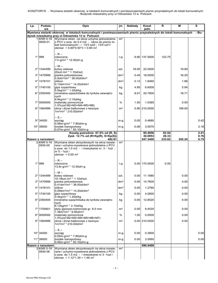 KOSZTORYS - Wymiana stolarki okiennej w lokalach komunalnych i pomieszczaeniach piwnic przynaleŜnych do lokali komunalnych - Budynek mieszkalny przy ul Odrzańska 13 w Policach Lp. PodstaOpis jm Nakłady Koszt R M wa jedn. Wymiana stolarki okiennej w lokalach komunalnych i pomieszczaeniach piwnic przynaleŜnych do lokali komunalnych dynek mieszkalny przy ul Odrzańska 13 w Policach 1 KNR 0-19 Wymiana okien na okna uchylne jednodzielne m2 0929-01 z PCV o pow. do 0.4 m2 - /okno do piwnic lokali komunalnych/ - / 13/3 szt2 ; 13/5 szt1/ obmiar = 0.60*0.50*3 = 0.90 m2 1* 999 2* 1344499 3* 1470999 4* 1478101 5* 1740100 6* 2350400 7* 0000000 8* 1564999 -- R -robocizna 11r-g/m2 * 12.50zł/r-g -- M -kotwy stalowe 20szt./m2 * 1.10zł/szt. pianka poliuretanowa 0.5dm3/m2 * 36.00zł/dm3 silikon 0.13dm3/m2 * 14.20zł/dm3 gips szpachlowy 5.5kg/m2 * 1.20zł/kg mineralna szpachlówka do tynków zewnętrznych 9.9kg/m2 * 2.10zł/kg materiały pomocnicze 1.5%(od M2+M3+M4+M5+M6) okna i drzwi balkonowe z tworzyw 1m2/m2 * 210.00zł/m2 r-g 18.00 22.0000 19.80 dm3 0.45 18.0000 16.20 dm3 0.12 1.8460 1.66 kg 4.95 6.6000 5.94 kg 8.91 20.7900 18.71 % 1.50 1.0385 0.93 m2 0.90 210.0000 189.00 -- S -wyciąg m-g 0.06m-g/m2 * 7.80zł/m-g 10* 39000 środek transportowy m-g 0.07m-g/m2 * 50.10zł/m-g Koszty pośrednie 67.5% od (R, S) Zysk 12.7% od (R+Kp(R), S+Kp(S)) Razem z narzutami: 492.61 2 KNR 0-19 Wymiana okien skrzynkowych na okna rozwie- m2 0930-05 rane i uchylno-rozwierane jednodzielne z PCV o pow. do 1.0 m2 - / mieszkanie nr. 3 - 1szt ; nr 5 - 1szt / obmiar = 0.00 m2 2* 1344499 3* 1470999 4* 1478101 5* 1740100 6* 2350400 7* 1750801 8* 0000000 9* 1564999 -- M -kotwy stalowe 10.18szt./m2 * 1.10zł/szt. pianka poliuretanowa 0.41dm3/m2 * 36.00zł/dm3 silikon 0.09dm3/m2 * 14.20zł/dm3 gips szpachlowy 3.4kg/m2 * 1.20zł/kg mineralna szpachlówka do tynków zewnętrznych 6.12kg/m2 * 2.10zł/kg płyty gipsowo-kartonowe gr. 9.5 mm 1.36m2/m2 * 6.95zł/m2 materiały pomocnicze 1.5%(od M2+M3+M4+M5+M6+M7) okna i drzwi balkonowe z tworzyw 1m2/m2 * 210.00zł/m2 0.4680 0.42 0.06 3.5070 3.16 83.54 26.33 233.62 r-g 0.00 170.0000 0.00 szt. 0.00 11.1980 0.00 dm3 0.00 14.7600 0.00 dm3 0.00 1.2780 0.00 kg 0.00 4.0800 0.00 kg 0.00 12.8520 0.00 m2 0.00 9.4520 0.00 % 1.50 0.0000 0.00 m2 0.00 210.0000 0.00 -- S -wyciąg m-g 0.05m-g/m2 * 7.80zł/m-g 11* 39000 środek transportowy m-g 0.06m-g/m2 * 50.10zł/m-g Razem z narzutami: 3 KNR 0-19 Wymiana okien skrzynkowych na okna rozwie- m2 0930-06 rane i uchylno-rozwierane jednodzielne z PCV o pow. do 1.5 m2 - / mieszkanie nr 3 -1szt / obmiar = 1.12*1.30 = 1.46 m2 10* 34000 -1- Norma PRO Wersja 4.20 0.05 95.4956 30.0953 547.3400 -- R -robocizna 13.6r-g/m2 * 12.50zł/r-g - Bu- 123.75 szt. 9* 34000 1* 999 9.90 137.5000 S 252.24 2.41 0.76 6.75 0.00 0.3900 0.00 0.00 3.0060 0.00 590.9400 KOSZTORYS - Wymiana stolarki okiennej w lokalach komunalnych i pomieszczaeniach piwnic przynaleŜnych do lokali komunalnych - Budynek mieszkalny przy ul Odrzańska 13 w Policach Lp. Podstawa 1* 999 2* 1344499 3* 1470999 4* 1478101 5* 1740100 6* 2350400 7* 1750801 8* 0000000 9* 1564999 Opis jm -- R -robocizna 10.46r-g/m2 * 12.50zł/r-g -- M -kotwy stalowe 6.26szt./m2 * 1.10zł/szt. pianka poliuretanowa 0.34dm3/m2 * 36.00zł/dm3 silikon 0.07dm3/m2 * 14.20zł/dm3 gips szpachlowy 2.7kg/m2 * 1.20zł/kg mineralna szpachlówka do tynków zewnętrznych 4.86kg/m2 * 2.10zł/kg płyty gipsowo-kartonowe gr. 9.5 mm 1.08m2/m2 * 6.95zł/m2 materiały pomocnicze 1.5%(od M2+M3+M4+M5+M6+M7) okna i drzwi balkonowe z tworzyw 1m2/m2 * 210.00zł/m2 r-g 3* 1470999 4* 1478101 5* 1740100 6* 2350400 7* 1750801 8* 0000000 9* 1564999 S 190.90 10.05 dm3 0.50 12.2400 17.87 dm3 0.10 0.9940 1.45 kg 3.94 3.2400 4.73 kg 7.10 10.2060 14.90 m2 1.58 7.5060 10.96 % 1.50 0.6160 0.90 m2 1.46 210.0000 306.60 r-g 0.07 0.3900 0.57 0.09 3.0060 4.39 90.5486 28.5362 504.9200 128.85 40.61 360.36 172.98 116.7500 2162.21 367.46 szt. 88.90 5.2800 97.79 dm3 6.11 11.8800 220.02 dm3 1.11 0.8520 15.78 kg 43.34 2.8080 52.00 kg 77.78 8.8200 163.35 m2 17.22 6.4635 119.70 % 1.50 0.5416 10.03 18.52 210.0000 3889.20 m2 -- S -wyciąg m-g 0.05m-g/m2 * 7.80zł/m-g 11* 39000 środek transportowy m-g 0.06m-g/m2 * 50.10zł/m-g Koszty pośrednie 67.5% od (R, S) Zysk 12.7% od (R+Kp(R), S+Kp(S)) Razem z narzutami: 8768.29 5 KNR 0-19 Wymiana drzwi balkonowych skrzynkowych na m2 0930-12 drzwi balkonowe z PCV - / mieszkanie nr 3 1szt ; 5 - 1szt / obmiar = 0.80*2.00*2 = 3.20 m2 10* 34000 -- R --2- Norma PRO Wersja 4.20 M 6.8860 -- R -robocizna 9.34r-g/m2 * 12.50zł/r-g -- M -kotwy stalowe 4.8szt./m2 * 1.10zł/szt. pianka poliuretanowa 0.33dm3/m2 * 36.00zł/dm3 silikon 0.06dm3/m2 * 14.20zł/dm3 gips szpachlowy 2.34kg/m2 * 1.20zł/kg mineralna szpachlówka do tynków zewnętrznych 4.2kg/m2 * 2.10zł/kg płyty gipsowo-kartonowe gr. 9.5 mm 0.93m2/m2 * 6.95zł/m2 materiały pomocnicze 1.5%(od M2+M3+M4+M5+M6+M7) okna i drzwi balkonowe z tworzyw 1m2/m2 * 210.00zł/m2 15.27 130.7500 R 9.14 -- S -wyciąg m-g 0.05m-g/m2 * 7.80zł/m-g 11* 39000 środek transportowy m-g 0.06m-g/m2 * 50.10zł/m-g Koszty pośrednie 67.5% od (R, S) Zysk 12.7% od (R+Kp(R), S+Kp(S)) Razem z narzutami: 737.18 4 KNR 0-19 Wymiana okien skrzynkowych na okna rozwie- m2 0930-07 rane i uchylno-rozwierane jednodzielne z PCV o pow. ponad 1.5 m2 - / mieszkanie nr 13/3 6szt ; 13/5 - 2szt/ obmiar = (1.30*1.40*1+1.30*1.50*4+1.30* 1.40*1)+(2.06*1.40+1.40*1.50*2) = 18.52 m2 2* 1344499 Koszt jedn. szt. 10* 34000 1* 999 Nakłady 3.35 1.05 9.36 0.93 0.3900 7.22 1.11 3.0060 55.67 81.0986 25.5581 473.4500 1459.52 459.97 4081.70 4567.87 42.45 13.38 118.72 KOSZTORYS - Wymiana stolarki okiennej w lokalach komunalnych i pomieszczaeniach piwnic przynaleŜnych do lokali komunalnych - Budynek mieszkalny przy ul Odrzańska 13 w Policach Lp. Podstawa 1* 999 2* 1344499 3* 1470999 4* 1478101 5* 1740100 6* 2350400 7* 1750801 8* 0000000 9* 1564999 Opis jm r-g Koszt jedn. 30.98 121.0000 szt. 16.90 5.8080 18.59 dm3 1.06 11.8800 38.02 dm3 0.19 0.8520 2.73 kg 