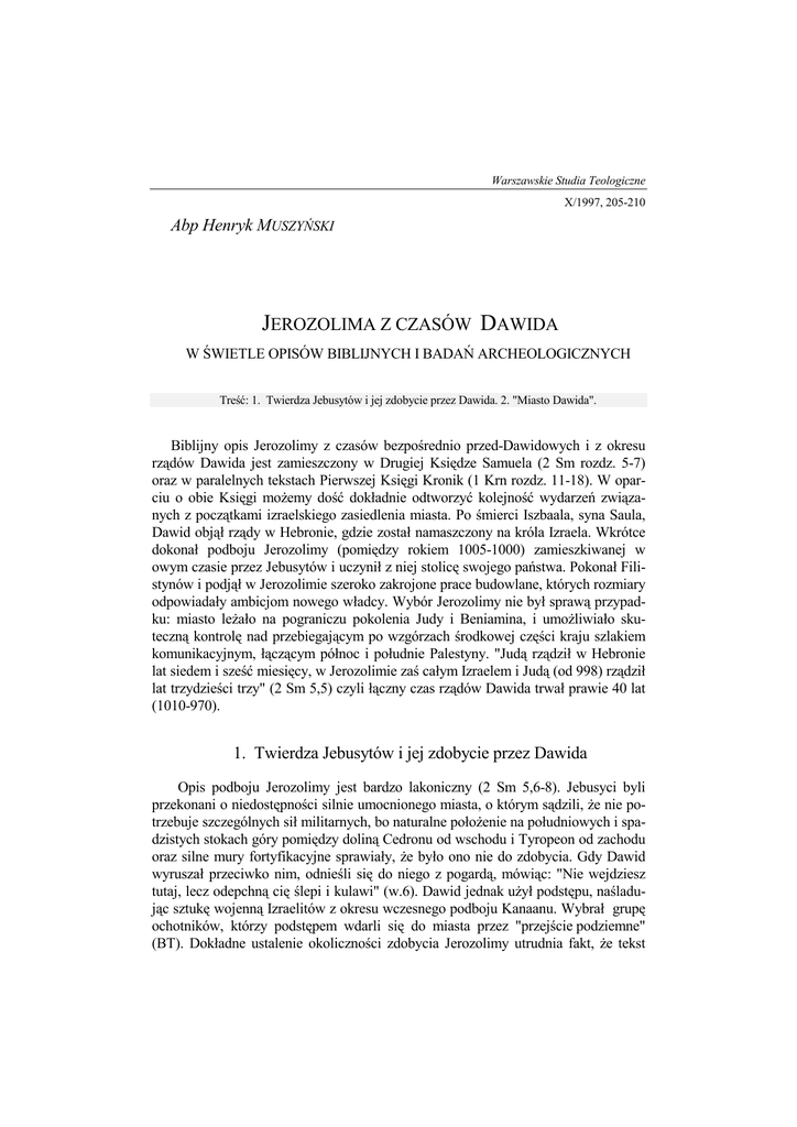Warszawskie Studia Teologiczne X/1997, 205-210 Abp Henryk MUSZYŃSKI JEROZOLIMA Z CZASÓW DAWIDA W ŚWIETLE OPISÓW BIBLIJNYCH I BADAŃ ARCHEOLOGICZNYCH Treść: 1. Twierdza Jebusytów i jej zdobycie przez Dawida. 2. "Miasto Dawida". Biblijny opis Jerozolimy z czasów bezpośrednio przed-Dawidowych i z okresu rządów Dawida jest zamieszczony w Drugiej Księdze Samuela (2 Sm rozdz. 5-7) oraz w paralelnych tekstach Pierwszej Księgi Kronik (1 Krn rozdz. 11-18). W oparciu o obie Księgi moŜemy dość dokładnie odtworzyć kolejność wydarzeń związanych z początkami izraelskiego zasiedlenia miasta. Po śmierci Iszbaala, syna Saula, Dawid objął rządy w Hebronie, gdzie został namaszczony na króla Izraela. Wkrótce dokonał podboju Jerozolimy (pomiędzy rokiem 1005-1000) zamieszkiwanej w owym czasie przez Jebusytów i uczynił z niej stolicę swojego państwa. Pokonał Filistynów i podjął w Jerozolimie szeroko zakrojone prace budowlane, których rozmiary odpowiadały ambicjom nowego władcy. Wybór Jerozolimy nie był sprawą przypadku: miasto leŜało na pograniczu pokolenia Judy i Beniamina, i umoŜliwiało skuteczną kontrolę nad przebiegającym po wzgórzach środkowej części kraju szlakiem komunikacyjnym, łączącym północ i południe Palestyny. "Judą rządził w Hebronie lat siedem i sześć miesięcy, w Jerozolimie zaś całym Izraelem i Judą (od 998) rządził lat trzydzieści trzy" (2 Sm 5,5) czyli łączny czas rządów Dawida trwał prawie 40 lat (1010-970). 1. Twierdza Jebusytów i jej zdobycie przez Dawida Opis podboju Jerozolimy jest bardzo lakoniczny (2 Sm 5,6-8). Jebusyci byli przekonani o niedostępności silnie umocnionego miasta, o którym sądzili, Ŝe nie potrzebuje szczególnych sił militarnych, bo naturalne połoŜenie na południowych i spadzistych stokach góry pomiędzy doliną Cedronu od wschodu i Tyropeon od zachodu oraz silne mury fortyfikacyjne sprawiały, Ŝe było ono nie do zdobycia. Gdy Dawid wyruszał przeciwko nim, odnieśli się do niego z pogardą, mówiąc: "Nie wejdziesz tutaj, lecz odepchną cię ślepi i kulawi" (w.6). Dawid jednak uŜył podstępu, naśladując sztukę wojenną Izraelitów z okresu wczesnego podboju Kanaanu. Wybrał grupę ochotników, którzy podstępem wdarli się do miasta przez "przejście podziemne" (BT). Dokładne ustalenie okoliczności zdobycia Jerozolimy utrudnia fakt, Ŝe tekst 206 Abp Henryk Muszyński relacjonujący to wydarzenie jest skaŜony, ponadto istnieje powaŜna trudność pogodzenia opisu biblijnego z danymi archeologicznymi. Stąd, nie ma wśród uczonych pełnej zgody, co się właściwie wydarzyło. Tekst hebrajski 2 Sm 5,8 w dosłownym tłumaczeniu brzmi: "Dawid powiedział: Ci, którzy zaatakują Jebusytów i osiągną (bądź: uderzą, lub: zdobędą) pionowy szyb" - hebr. sinnor - [BT - "Ktokolwiek pokona Jebusytów, zdobywając przejście podziemne"]. Wiadomo, Ŝe chodzi o wydrąŜony pionowy 14 m. głęboki szyb, prowadzący do tunelu, teŜ wydrąŜonego pod ziemią, którym doprowadzano wodę ze źródła Gichon w Dolinie Cedronu do miasta. Szyb ten został odkryty przez Warrena juŜ w r. 1867 (nazywany teŜ szybem Warrena) i ponownie zbadany przez H.L. Vincenta w r. 1911. a takŜe przez Yigal Shiloh w latach 1979-1981. Istnieją dwa sposoby objaśniania tego tekstu. Tradycyjnie przyjmowano, Ŝe grupa sprawnych Ŝołnierzy, dowodzonych przez Joaba, dokonała wyczynu polegającego na brawurowej wspinaczce po pionowej ścianie szybu i weszła do środka miasta i zdobyła miasto podstępem przez zaskoczenie obrońców. W początkach lat 60. Beniamin Mazar przedłoŜył jednak inne rozwiązanie. Jego zdaniem przebieg wypadków świadczy, Ŝe hebr. wyraŜenie wayyiga‘ bassinnor, dosł. "uderzyli (i zniszczyli) pionowy szyb", naleŜy pojmować jako aluzję do uszkodzenia szybu. Charakterystyczne, Ŝe w paralelnym opisie, podanym w 1 Krn 11,4-9, nie ma Ŝadnej wzmianki o szybie. Wygląda na to, Ŝe Joab i jego podwładni odcięli dopływ wody oraz podjęli szturm na mury miasta po ich wschodniej stronie. Strategia Joaba stanowiła zatem zręczne połączenie dwóch czynników - pozbawienia mieszkańców miasta zaopatrzenia w wodę oraz nagłego ataku na mury. Mazar sądzi, Ŝe aczkolwiek tradycyjne rozwiązanie nie jest niemoŜliwe, zaproponowane przez niego jest bardziej prawdopodobne. Archeologowie odnaleźli pozostałości murów miejskich zbudowanych przez Jebusytów po północnej stronie miasta w okresie średniego brązu (ok. 1800 r. przed Chr.). Przez długi okres czasu, pomimo licznych kampanii wykopaliskowych prowadzonych na tzw. Ofelu (1913-1914 i 1923-1924 - R. Weil, 1923-1925 - R.S.A. Macalister i Duncan, 1927 - J.W. Cowfoot) dokładny bieg i zasięg murów Jebusejskich stanowił prawdziwą zagadkę. Dopiero w czasie kampanii K. Kenyon (1961-1967) z Brytyjskiej Szkoły Archeologicznej udało się ustalić bieg murów miasta Jebusytów. Stwierdziła ona Ŝe mur północny biegł ok. 230 m. od linii dzisiejszych południowych murów świątynnych, a więc mniej więcej w połowie wzgórza (a nie na szczycie Ofelu, jak błędnie sądzono). Wschodni zaś mur biegł ok. 50 m. poniŜej wschodnich murów z okresu Nehemiasza z czasów Machabeuszy. Późniejsze wykopaliska M. Broshi'ego i B. Mazara dokonane juŜ po reunifikacji Jerozolimy potwierdziły wcześniejsze wyniki wykopalisk. Zgodnie z wynikami tych badań wejście do tunelu doprowadzającego wodę ze źródła Gichon, znajdowało się juŜ wewnątrz miasta. Według najnowszych danych archeologii, mury z okresu Jebusyckiego broniły dostępu do źródła Gichon oraz szybu połączonego z tunelem bądź tunelami, którymi doprowadzano wodę do miasta. Znajdowały się one w jednym z najbardziej newralgicznych punktów, zawsze silnie ufortyfikowanym z powodu swojego strategicznego znaczenia. Usytuowane na wzgórzu znanym jako Ofel, na południe od tzw. terenu świątynnego, są nazywane przez archeologów stokami Jebusyckimi. 