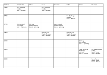 Godzina Poniedziałek 06:45 Pro Challenge Irek Żak Sala 2 - Fitness Wtorek Środa Czwartek 09:00 Sobota Pro Challenge Irek Żak Sala 2 - Fitness Wytrzymałość Asia Wosek Sala 1 - Spinning Siła Nóg Ewelina Bokwa Sala 1 - Spinning Wytrzymałość Ewelina Bokwa Sala 1 - Spinning Płaski Brzuch Magda Zawalska Sala 2 - Fitness Płaski Brzuch Magda Zawalska Sala 2 - Fitness 10:00 Siła Nóg Asia Wosek Sala 1 - Spinning 10:30 Płaski Brzuch & Stretching Irek Żak Sala 2 - Fitness 12:00 Niedziela Pro Challenge Irek Żak Sala 2 - Fitness 07:15 07:30 Piątek Zdrowy Kręgosłup (1.5H) Patryk Trener Sala 2 - Fitness Power Pump Patryk Trener Sala 2 - Fitness 16:30 Bikini Fitness Anna Klocyk Sala 2 - Fitness Jędrne Ciało Małgorzata Piekarek Sala 2 - Fitness 17:00 Płaski Brzuch i Jędrne Pośladki Martyna Sikora Sala 2 - Fitness Trening Obwodowy Adrian Domański Sala 2 - Fitness Siła Nóg Filip Dworczak Sala 1 - Spinning Wydolność Irek Żak Sala 1 - Spinning 17:30 Power Pump Adrian Pierzgalski Sala 2 - Fitness CelluStop Małgorzata Piekarek Sala 2 - Fitness Fat Killer Martyna Sikora Sala 2 - Fitness Płaski Brzuch i Jędrne Pośladki Magdalena Poborca Sala 2 - Fitness 18:00 Siła Nóg Filip Dworczak Sala 1 - Spinning Wytrzymałość Luiza Orzechowska Sala 1 - Spinning Wytrzymałość Filip Dworczak Sala 1 - Spinning Siła Nóg Irek Żak Sala 1 - Spinning Body Explode Filip Dworczak Sala 2 - Fitness Podstawy Wytrzymałości Filip Dworczak Sala 1 - Spinning Cross Stacja Artur Czerwiński Sala 2 - Fitness 18:30 Abt Adrian Pierzgalski Sala 2 - Fitness 19:00 Wytrzymałość Filip Dworczak Sala 1 - Spinning Płaski Brzuch i Fit Ball Jędrne Pośladki Martyna Sikora Monika Porażyńska- Sala 2 - Fitness Bohn Sala 2 - Fitness Power Pump Magdalena Poborca Sala 2 - Fitness Bikini Fitness Anna Klocyk Sala 2 - Fitness Powered by TCPDF (www.tcpdf.org) 19:30 Stretching Adrian Pierzgalski Sala 2 - Fitness 20:30 Cross Stacja Irek Żak Sala 2 - Fitness Trening Obwodowy Zumba Monika Porażyńska- Michalina Groth Bohn Sala 2 - Fitness Sala 2 - Fitness Cross Stacja Artur Czerwiński Sala 2 - Fitness Stretching Magdalena Poborca Sala 2 - Fitness