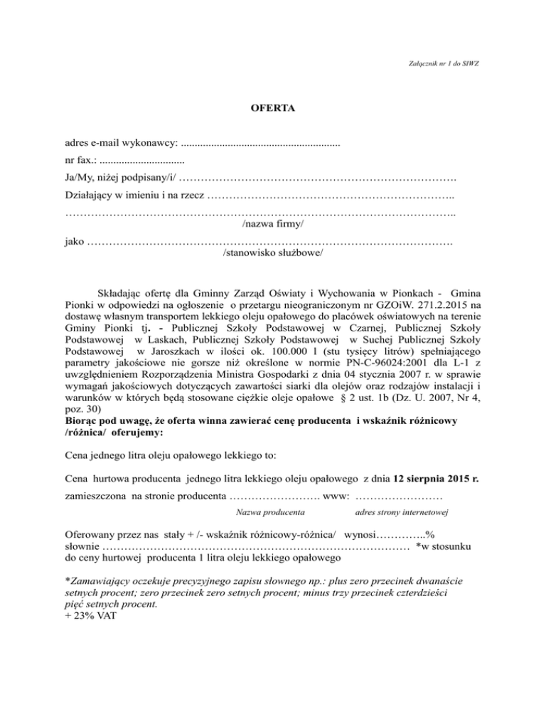 Załącznik nr 1 do SIWZ OFERTA adres e-mail wykonawcy: .......................................................... nr fax.: ............................... Ja/My, niżej podpisany/i/ …………………………………………………………………. Działający w imieniu i na rzecz ………………………………………………………….. …………………………………………………………………………………………….. /nazwa firmy/ jako ………………………………………………………………………………………. /stanowisko służbowe/ Składając ofertę dla Gminny Zarząd Oświaty i Wychowania w Pionkach - Gmina Pionki w odpowiedzi na ogłoszenie o przetargu nieograniczonym nr GZOiW. 271.2.2015 na dostawę własnym transportem lekkiego oleju opałowego do placówek oświatowych na terenie Gminy Pionki tj. - Publicznej Szkoły Podstawowej w Czarnej, Publicznej Szkoły Podstawowej w Laskach, Publicznej Szkoły Podstawowej w Suchej Publicznej Szkoły Podstawowej w Jaroszkach w ilości ok. 100.000 l (stu tysięcy litrów) spełniającego parametry jakościowe nie gorsze niż określone w normie PN-C-96024:2001 dla L-1 z uwzględnieniem Rozporządzenia Ministra Gospodarki z dnia 04 stycznia 2007 r. w sprawie wymagań jakościowych dotyczących zawartości siarki dla olejów oraz rodzajów instalacji i warunków w których będą stosowane ciężkie oleje opałowe § 2 ust. 1b (Dz. U. 2007, Nr 4, poz. 30) Biorąc pod uwagę, że oferta winna zawierać cenę producenta i wskaźnik różnicowy /różnica/ oferujemy: Cena jednego litra oleju opałowego lekkiego to: Cena hurtowa producenta jednego litra lekkiego oleju opałowego z dnia 12 sierpnia 2015 r. zamieszczona na stronie producenta ……………………. www: …………………… Nazwa producenta adres strony internetowej Oferowany przez nas stały + /- wskaźnik różnicowy-różnica/ wynosi…………..% słownie ………………………………………………………………………… *w stosunku do ceny hurtowej producenta 1 litra oleju lekkiego opałowego *Zamawiający oczekuje precyzyjnego zapisu słownego np.: plus zero przecinek dwanaście setnych procent; zero przecinek zero setnych procent; minus trzy przecinek czterdzieści pięć setnych procent. + 23% VAT Cenę dostawy jednego litra oleju wynosi: brutto: .................. złotych słownie .................................................................................... w tym podatek VAT w wysokości ........% tj. ...................złotych. : cena netto jednego litra oleju opałowego słownie: ......................................................................zł, .................................................................................................................................................... - VAT ..................................... zł Oświadczam, iż zadeklarowana wyżej cena i wskaźnik różnicowy zawiera koszty transportu do Zamawiającego oraz wszystkie inne koszty składające się na realizację niniejszego zamówienia i zostały w nich uwzględnione z należytą starannością. Wyżej wskazany wskaźnik nie ulegnie zmianie przez okres trwania umowy Oświadczam co następuje : 1. W razie wyboru naszej oferty zobowiązuję się do podpisania umowy według wzoru załącznik Nr 7 do SIWZ 2. Informuję, że zapoznałem się z dokumentacją przetargową i nie wnoszę zastrzeżeń do dokumentacji przetargowej 3. Zobowiązuję się do dostarczenia atestu do każdej dostawy oleju 4.Wniosłem wadium w wysokości .......................... zł w dniu ......................w formie ........................................................................................................................................ 5.Jestem/nie jestem podatnikiem podatku VAT 6. Do składania wyjaśnień przed Komisją Przetargową upoważniam Pana/Panią ................................................................................................................................. Załączniki : 1………………………………………. 2………………………………………. 3………………………………………. 4. ……………………………………… 5. ……………………………………… …………………………….., dnia …………………. ................................................. pieczątka i podpis osób upoważnionych