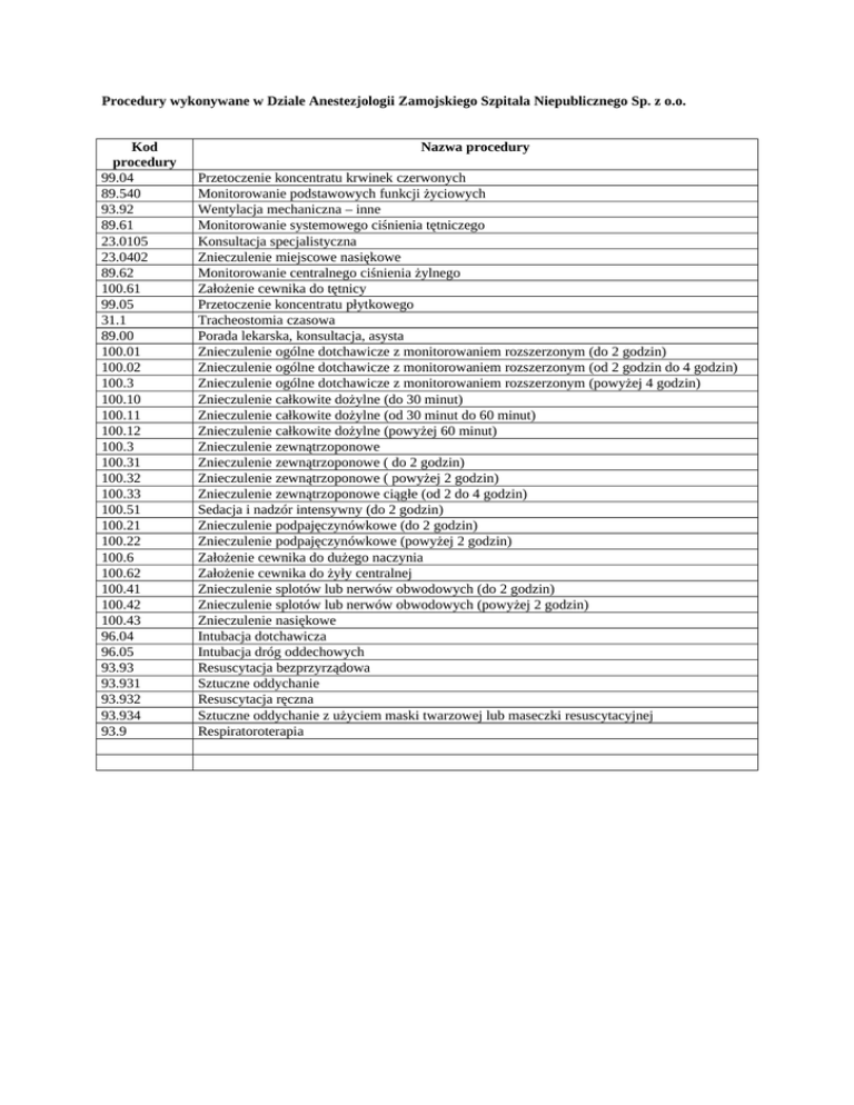 Procedury wykonywane w Dziale Anestezjologii Zamojskiego Szpitala Niepublicznego Sp. z o.o. Kod procedury 99.04 89.540 93.92 89.61 23.0105 23.0402 89.62 100.61 99.05 31.1 89.00 100.01 100.02 100.3 100.10 100.11 100.12 100.3 100.31 100.32 100.33 100.51 100.21 100.22 100.6 100.62 100.41 100.42 100.43 96.04 96.05 93.93 93.931 93.932 93.934 93.9 Nazwa procedury Przetoczenie koncentratu krwinek czerwonych Monitorowanie podstawowych funkcji życiowych Wentylacja mechaniczna – inne Monitorowanie systemowego ciśnienia tętniczego Konsultacja specjalistyczna Znieczulenie miejscowe nasiękowe Monitorowanie centralnego ciśnienia żylnego Założenie cewnika do tętnicy Przetoczenie koncentratu płytkowego Tracheostomia czasowa Porada lekarska, konsultacja, asysta Znieczulenie ogólne dotchawicze z monitorowaniem rozszerzonym (do 2 godzin) Znieczulenie ogólne dotchawicze z monitorowaniem rozszerzonym (od 2 godzin do 4 godzin) Znieczulenie ogólne dotchawicze z monitorowaniem rozszerzonym (powyżej 4 godzin) Znieczulenie całkowite dożylne (do 30 minut) Znieczulenie całkowite dożylne (od 30 minut do 60 minut) Znieczulenie całkowite dożylne (powyżej 60 minut) Znieczulenie zewnątrzoponowe Znieczulenie zewnątrzoponowe ( do 2 godzin) Znieczulenie zewnątrzoponowe ( powyżej 2 godzin) Znieczulenie zewnątrzoponowe ciągłe (od 2 do 4 godzin) Sedacja i nadzór intensywny (do 2 godzin) Znieczulenie podpajęczynówkowe (do 2 godzin) Znieczulenie podpajęczynówkowe (powyżej 2 godzin) Założenie cewnika do dużego naczynia Założenie cewnika do żyły centralnej Znieczulenie splotów lub nerwów obwodowych (do 2 godzin) Znieczulenie splotów lub nerwów obwodowych (powyżej 2 godzin) Znieczulenie nasiękowe Intubacja dotchawicza Intubacja dróg oddechowych Resuscytacja bezprzyrządowa Sztuczne oddychanie Resuscytacja ręczna Sztuczne oddychanie z użyciem maski twarzowej lub maseczki resuscytacyjnej Respiratoroterapia