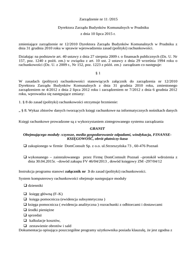 Zarządzenie nr 11 /2015 Dyrektora Zarządu Budynków Komunalnych w Prudniku z dnia 10 lipca 2015 r. zmieniające zarządzenie nr 12/2010 Dyrektora Zarządu Budynków Komunalnych w Prudniku z dnia 31 grudnia 2010 roku w sprawie wprowadzenia zasad (polityki) rachunkowości. Działając na podstawie art. 40 ustawy z dnia 27 sierpnia 2009 r. o finansach publicznych (Dz. U. Nr 157, poz. 1240 z poźń. zm.) w związku z art. 10 ust. 2 ustawy z dnia 29 września 1994 roku o rachunkowości (Dz. U. z 2009 r., Nr 152, poz. 1223 z późń. zm.) zarządzam co następuje: §1 W zasadach (polityce) rachunkowości stanowiących załącznik do zarządzenia nr 12/2010 Dyrektora Zarządu Budynków Komunalnych z dnia 31 grudnia 2010 roku, zmienionego zarządzeniem nr 4/2012 z dnia 2 lipca 2012 roku i zarządzeniem nr 7/2012 z dnia 6 grudnia 2012 roku, wprowadza się następujące zmiany: 1. § 8 do zasad (polityki) rachunkowości otrzymuje brzmienie: „ § 8. Wykaz zbiorów danych tworzących księgi rachunkowe na informatycznych nośnikach danych Księgi rachunkowe prowadzone są z wykorzystaniem zintegrowanego systemu zarządzania GRANIT Obejmującego moduły :czynsze, media gospodarowanie odpadami, windykacja, FINANSEKSIĘGOWOŚĆ, obrót płatniczy-kasa zakupionego w firmie DomConsult Sp. z o.o. ul.Strzeszyńska 73 , 60-476 Poznań wykonanego – zainstalowanego przez Firmę DomComsult Poznań –protokół wdrożenia z dnia 30.04.2015r. –dowód zakupu FV 46/04/2013 , dowód księgowy ZM -297/04/12 Instrukcja programu stanowi załącznik nr 3 do zasad (polityki) rachunkowości. System komputerowy rachunkowości obejmuje następujące moduły dzienniki księgę główną (F–K) księga pomocnicza (ewidencja subsyntetyczna ) księga pomocnicza ( ewidencja analityczna ) rozrachunki z odbiorcami i dostawcami środki pieniężne sprzedaż kalkulacje kosztów, zestawienie obrotów i sald Dokumentacja opisująca poszczególne programy użytkownika posiada klauzulę, że jest zgodna z wymogami ustawy o rachunkowości i zawiera: 1. 2. 3. 4. oznaczenie wersji oprogramowania i datę rozpoczęcia jego eksploatacji, wykaz programów, procedury/funkcje wraz z opisem algorytmów i parametrów, opis programowych zasad ochrony danych, metody zabezpieczenia dostępu do danych i systemu ich przetwarzania, 5. wykaz zbiorów kont ksiąg rachunkowych z określeniem ich struktury, wzajemnych powiązań oraz ich funkcji w komputerowym systemie rachunkowości. Księgi rachunkowe obejmują zbiory zapisów księgowych, obrotów i sald prowadzone są w następujący sposób: 1) zdarzenia, jakie nastąpiły w danym okresie sprawozdawczym, ujmowane są w nim chronologicznie; 2) zapisy są kolejno numerowane w okresie roku, co pozwala na ich jednoznaczne powiązanie ze sprawdzonymi i zatwierdzonymi dowodami księgowymi; 3) sumy zapisów (obroty) liczone są w sposób ciągły; 4) sumy obrotów są zgodne z obrotami zestawienia obrotów i sald kont księgi głównej. Na koniec każdego okresu sprawozdawczego sporządzane są zestawienia obrotów dzienników częściowych. Księga główna (konta syntetyczne) prowadzona jest w sposób spełniający następujące zasady: 1) podwójnego zapisu; 2) systematycznego i chronologicznego rejestrowania zdarzeń gospodarczych zgodnie z zasadą memoriałową; 3) powiązania dokonanych w niej zapisów z zapisami w dzienniku. Księgi pomocnicze (konta analityczne) stanowią zapisy uszczegółowiające dla wybranych kont księgi głównej. Zapisy na kontach analitycznych dokonywane są zgodnie z zasadą zapisu powtarzanego. Forma kont analitycznych dostosowywana jest za każdym razem do przedmiotu ewidencji konta głównego. Zestawienia obrotów i sald kont księgi głównej sporządza się na koniec każdego miesiąca. Zawierają one: 1) symbole kont; 2) salda kont na dzień otwarcia ksiąg rachunkowych, obroty za okres sprawozdawczy i narastająco od początku roku oraz salda na koniec okresu sprawozdawczego; 3) sumę sald na dzień otwarcia ksiąg rachunkowych, obrotów za okres sprawozdawczy i narastająco od początku roku oraz sald na koniec okresu sprawozdawczego. Obroty zestawienia są zgodne z obrotami dzienników częściowych. Zestawienia sald kont ksiąg pomocniczych sporządza się na dzień zamknięcia roku obrotowego. Wykaz składników aktywów i pasywów (inwentarz) stanowi zestawienie obrotów i sald kont księgi głównej oraz zestawienie sald kont ksiąg pomocniczych, potwierdzane coroczną inwentaryzacją. Zestawienie sporządzane jest na koniec roku obrotowego. Kompletne księgi rachunkowe przenoszone są na koniec roku obrotowego na komputerowy nośnik danych, zapewniający trwałość zapisu informacji, i przechowywane w siedzibie Zarządu Budynków Komunalnych. Księgi rachunkowe, z uwzględnieniem techniki ich prowadzenia, powinny być trwale oznaczone nazwą jednostki oraz wyraźnie oznaczone co do roku obrotowego, okresu sprawozdawczego i daty sporządzenia. Księgi rachunkowe powinny być prowadzone rzetelnie, bezbłędnie, sprawdzalnie i na bieżąco, przy czym księgi rachunkowe uznaje się za: 1) rzetelne - jeżeli dokonane w nich zapisy odzwierciedlają stan rzeczywisty; 2) bezbłędne - jeżeli wprowadzono do nich kompletnie i poprawnie wszystkie zakwalifikowane do zaksięgowania dowody oraz zapewniono ciągłość zapisów; 3) sprawdzalne - jeżeli umożliwiają stwierdzenie poprawności dokonanych zapisów oraz sporządzenie na ich podstawie sprawozdań finansowych oraz deklaracji obowiązujących podatkowych; 4) prowadzone na bieżąco - jeżeli pochodzące z nich informacje umożliwiają terminowe przygotowanie sprawozdań oraz dokonanie rozliczeń finansowych. Zapis księgowy zawiera co najmniej: 1) datę dokumentu, która jest równoznaczna z datą wpływu dokumentu do Zarządu Budynków Komunalnych ; dla dokumentów księgowych z okresu poprzedniego, wpływających najpóźniej 10 dni po tym okresie, przyjmuje się datę dokumentu jako ostatni dzień mi