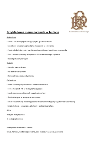 Przykładowe menu na lunch w bufecie Bufet ciepły - Krem z soczewicy i pieczonej papryki , grzanki ziołowe - Medaliony wieprzowe z kurkami duszonymi w śmietanie - Piersi młodych kurcząt z bazyliowymi pomidorami zapiekane mozzarellą - Filet z łososia pieczony w koprze na liściach duszonego szpinaku - Bukiet polskich pierogów Dodatki - Kopytka pietruszkowe - Ryż dziki a warzywami - Ziemniaki po polsku w tymianku Płyta zimna - Plater domowych pasztetów z sosem cumberland - Filet z morskich ryb w meksykaoskiej salsie - Indyk pieczony w pistacjach na galaretce cherry - Śledź atlantycki w marynacie warzywnej - Schab faszerowany musem jajeczno-chrzanowym skąpany w galaretce czosnkowej - Sałata lodowa z vinegrete , oliwkami i płatkami sera feta -Pikle -Grzybki marynowane -3 rodzaje pieczywo Patery ciast domowych i owoce. Kawa, herbata, woda niegazowana ,soki owocowe ,napoje gazowane.