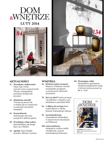 LUTY 2014 134 84 AKTUALNOŚCI WNĘTRZA 12 Wyszukane, zmiksowane! Nasze typy wśród nowości: nowa wersja krzesła Thonet, awangardowa porcelana, designerski prysznic 54 Kontener pełen szczęścia Wnętrze w klimacie estetyki steampunku urządzone w towarowych, żeliwnych skrzyniach 16 Szlachetny emerald Trzyma się mocno tak w modzie jak we wnętrzach: na tapetach, dywanach, kanapach... 18 Pewna historia Dekoracyjne złocenia, przepych w dobrym guście 20 Przedmioty z kina rodem Sprawdziliśmy, jak design łączy się z filmem 34 Agenda. Nowe książki, premiery filmowe, wystawy 118 Wystrugany relaks Weekendowy apartament włoskich projektantów mody, w którym można poczuć się jak w... lesie 70 Być czy mieć? Umiar, prostota i przedmioty z odzysku, czyli antyluksus w paryskim lofcie 84 U Hilary nic nowego Dom na Brooklynie w duchu bohemy francuskiego château 96 Luz kontrolowany Nonszalancki minimalizm w stumetrowym mieszkaniu na Wilanowie 108 Lata trzydzieste... Sztukaterie, stylowe meble i dodatki jak z czasów przedwojennej Warszawy Na okładce: Dom w Pretorii Zdjęcie: Elsa Young/House and Leisure /East News D&W luty 2014 4SPIS TREŚCI 142 26 AKADEMIA DESIGNU PRZEWODNIK 42 Czasy Zahy Zaha Hadid, designerka z charakterem 134 Wielki come back dywanów! Przetarte, z ludowymi wzorami, perskie... Jeden to za mało! 48 Sekrety Magdy T. Magda Tekieli – projektantka mebli i grafiki użytkowej POLSKA MARKA 50 Dyrygent wśród sof Piotr Kler o kulisach sukcesu ARTYŚCI U SIEBIE 26 Mistrz odejmowania Mariusz Łukasik, jeden z najciekawszych polskich malarzy 38 Kaflarka Krystyna Kaszuba-Wacławek, artysta ceramik, projektantka kafli i pieców D&W luty 2014 142 Kraków Atrakcje bez limitu 150 W Normie Warszawska restauracja z autorską kuchnią i designem nowoczesnego bistra 154 Niech kolor będzie z tobą Nowości 158 Oko nie myli Tapety iluzjonistyczne 162 10 Naj. Usiądziesz z wrażenia Wygodne kanapy 164 Mniej niż zero Lodówki 166 Rozmaitości 168 Adresy architektów 169 Adresy Sklepy i producenci FELIETONY 37 Złote myśli psa Czeskiego Recenzje Kazimiery Szczuki 148 Utopia ma się dobrze Architekt Jakub Szczęsny o wizycie w Oaxaca 156 Pamięć ma smak mleka Bogusław Deptuła, krytyk sztuki o czytanej w kuchni książce „Tost. Historia chłopięcego głodu” IKONA DESIGNU 170 Wzrok w bok Szafa Good Vibrations