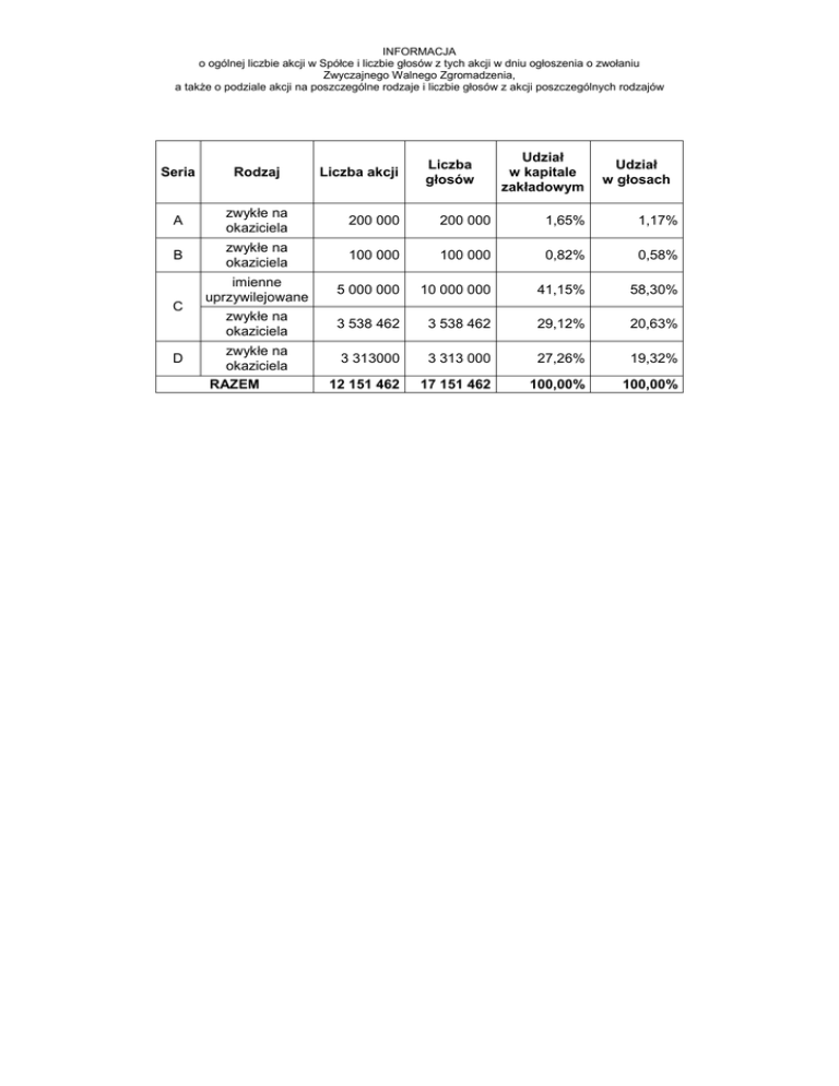 INFORMACJA o ogólnej liczbie akcji w Spółce i liczbie głosów z tych akcji w dniu ogłoszenia o zwołaniu Zwyczajnego Walnego Zgromadzenia, a także o podziale akcji na poszczególne rodzaje i liczbie głosów z akcji poszczególnych rodzajów Udział w kapitale zakładowym Udział w głosach Rodzaj A zwykłe na okaziciela 200 000 200 000 1,65% 1,17% B zwykłe na okaziciela 100 000 100 000 0,82% 0,58% imienne uprzywilejowane 5 000 000 10 000 000 41,15% 58,30% zwykłe na okaziciela 3 538 462 3 538 462 29,12% 20,63% 3 313000 3 313 000 27,26% 19,32% 12 151 462 17 151 462 100,00% 100,00% C D zwykłe na okaziciela RAZEM Liczba akcji Liczba głosów Seria