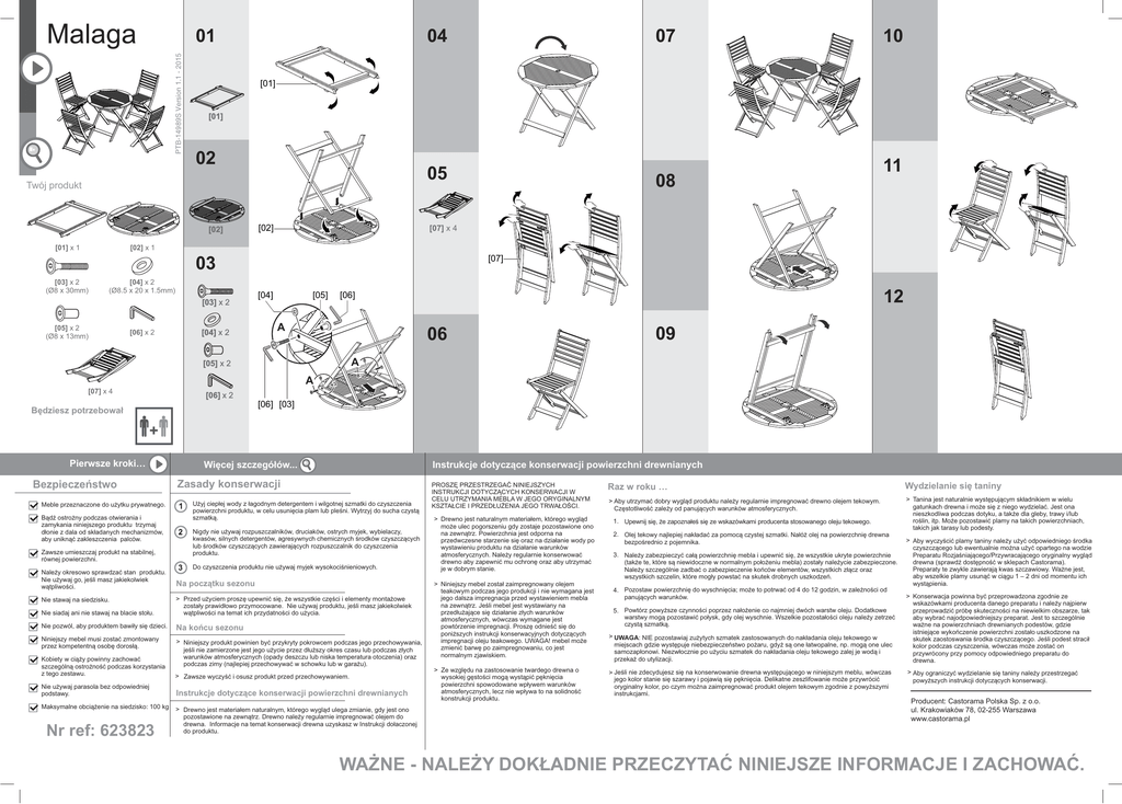 Malaga PTB-14989S Version 1.1 - 2015 01 04 10 [01] [01] 02 05 Twój produkt [02] [01] x 1 07 [02] 08 11 [07] x 4 [02] x 1 [07] 03 [03] x 2 (Ø8 x 30mm) [04] x 2 (Ø8.5 x 20 x 1.5mm) [03] x 2 [05] x 2 (Ø8 x 13mm) [06] x 2 [04] x 2 [04] [05] 12 [06] A 06 09 A [05] x 2 A [07] x 4 [06] x 2 [06] [03] Będziesz potrzebował Pierwsze kroki… Bezpieczeństwo Meble przeznaczone do użytku prywatnego. Bądź ostrożny podczas otwierania i zamykania niniejszego produktu trzymaj dłonie z dala od składanych mechanizmów, aby uniknąć zakleszczenia palców. Zawsze umieszczaj produkt na stabilnej, równej powierzchni. Należy okresowo sprawdzać stan produktu. Nie używaj go, jeśli masz jakiekolwiek wątpliwości. EtWięcej dans le détail… szczegółów... Instrukcje dotyczące konserwacji powierzchni drewnianych Zasady konserwacji Użyj ciepłej wody z łagodnym detergentem i wilgotnej szmatki do czyszczenia powierzchni produktu, w celu usunięcia plam lub pleśni. Wytrzyj do sucha czystą szmatką. Nigdy nie używaj rozpuszczalników, druciaków, ostrych myjek, wybielaczy, kwasów, silnych detergentów, agresywnych chemicznych środków czyszczących lub środków czyszczących zawierających rozpuszczalnik do czyszczenia produktu. Do czyszczenia produktu nie używaj myjek wysokociśnieniowych. Na początku sezonu Nie siadaj ani nie stawaj na blacie stołu. > Przed użyciem proszę upewnić się, że wszystkie części i elementy montażowe zostały prawidłowo przymocowane. Nie używaj produktu, jeśli masz jakiekolwiek wątpliwości na temat ich przydatności do użycia. Nie pozwól, aby produktem bawiły się dzieci. Na końcu sezonu Niniejszy mebel musi zostać zmontowany przez kompetentną osobę dorosłą. > Niniejszy produkt powinien być przykryty pokrowcem podczas jego przechowywania, jeśli nie zamierzone jest jego użycie przez dłuższy okres czasu lub podczas złych warunków atmosferycznych (opady deszczu lub niska temperatura otoczenia) oraz podczas zimy (najlepiej przechowywać w schowku lub w garażu). Nie stawaj na siedzisku. Kobiety w ciąży powinny zachować szczególną ostrożność podczas korzystania z tego zestawu. > Zawsze wyczyść i osusz produkt przed przechowywaniem. Nie używaj parasola bez odpowiedniej podstawy. Instrukcje dotyczące konserwacji powierzchni drewnianych Maksymalne obciążenie na siedzisko: 100 kg Nr ref: 623823 > Drewno jest materiałem naturalnym, którego wygląd ulega zmianie, gdy jest ono pozostawione na zewnątrz. Drewno należy regularnie impregnować olejem do drewna. Informacje na temat konserwacji drewna uzyskasz w Instrukcji dołaczonej do produktu. PROSZĘ PRZESTRZEGAĆ NINIEJSZYCH INSTRUKCJI DOTYCZĄCYCH KONSERWACJI W CELU UTRZYMANIA MEBLA W JEGO ORYGINALNYM KSZTAŁCIE I PRZEDŁUŻENIA JEGO TRWAŁOŚCI. > Drewno jest naturalnym materiałem, którego wygląd może ulec pogorszeniu gdy zostaje pozostawione ono na zewnątrz. Powierzchnia jest odporna na przedwczesne starzenie się oraz na działanie wody po wystawieniu produktu na działanie warunków atmosferycznych. Należy regularnie konserwować drewno aby zapewnić mu ochronę oraz aby utrzymać je w dobrym stanie. > Niniejszy mebel został zaimpregnowany olejem teakowym podczas jego produkcji i nie wymagana jest jego dalsza impregnacja przed wystawieniem mebla na zewnątrz. Jeśli mebel jest wystawiany na przedłużające się działanie złych warunków atmosferycznych, wówczas wymagane jest powtórzenie impregnacji. Proszę odnieść się do poniższych instrukcji konserwacyjnych dotyczących impregnacji oleju teakowego. UWAGA! mebel może zmienić barwę po zaimpregnowaniu, co jest normalnym zjawiskiem. > Ze względu na zastosowanie twardego drewna o wysokiej gęstości mogą wystąpić pęknięcia powierzchni spowodowane wpływem warunków atmosferycznych, lecz nie wpływa to na solidność konstrukcji produktu. Raz w roku … Wydzielanie się taniny > Aby utrzymać dobry wygląd produktu należy regularnie impregnować drewno olejem tekowym. Częstotliwość zależy od panujących warunków atmosferycznych. > Tanina jest naturalnie występującym składnikiem w wielu gatunkach drewna i może się z niego wydzielać. Jest ona nieszkodliwa podczas dotyku, a także dla gleby, trawy i/lub roślin, itp. Może pozostawić plamy na takich powierzchniach, takich jak tarasy lub podesty. 1. Upewnij się, że zapoznałeś się ze wskazówkami producenta stosowanego oleju tekowego. 2. Olej tekowy najlepiej nakładać za pomocą czystej szmatki. Nałóż olej na powierzchnię drewna bezpośrednio z pojemnika. 3. Należy zabezpieczyć całą powierzchnię mebla i upewnić się, że wszystkie ukryte powierzchnie (także te, które są niewidoczne w normalnym położeniu mebla) zostały należycie zabezpieczone. Należy szczególnie zadbać o zabezpieczenie końców elementów, wszystkich złącz oraz wszystkich szczelin, które mogły powstać na skutek drobnych uszkodzeń. 4. Pozostaw powierzchnię do wyschnięcia; może to potrwać od 4 do 12 godzin, w zależności od panujących warunków. 5. Powtórz powyższe czynności poprzez nałożenie co najmniej dwóch warstw oleju. Dodatkowe warstwy mogą pozostawić połysk, gdy olej wyschnie. Wszelkie pozostałości oleju należy zetrzeć czystą szmatką. > UWAGA: NIE pozostawiaj zużytych szmatek zastosowanych do nakładania oleju tekowego w miejscach gdzie występuje niebezpieczeństwo pożaru, gdyż są one łatwopalne, np. mogą one ulec samozapłonowi. Niezwłocznie po użyciu szmatek do nakładania oleju tekowego zalej je wodą i przekaż do utylizacji. > Jeśli nie zdecydujesz się na konserwowanie drewna występującego w niniejszym meblu, wówczas jego kolor stanie się szarawy i pojawią się pęknięcia. Delikatne zeszlifowanie może przywrócić oryginalny kolor, po czym można zaimpregnować produkt olejem tekowym zgodnie z powyższymi instrukcjami. > Aby wyczyścić plamy taniny należy użyć odpowiedniego środka czyszczą