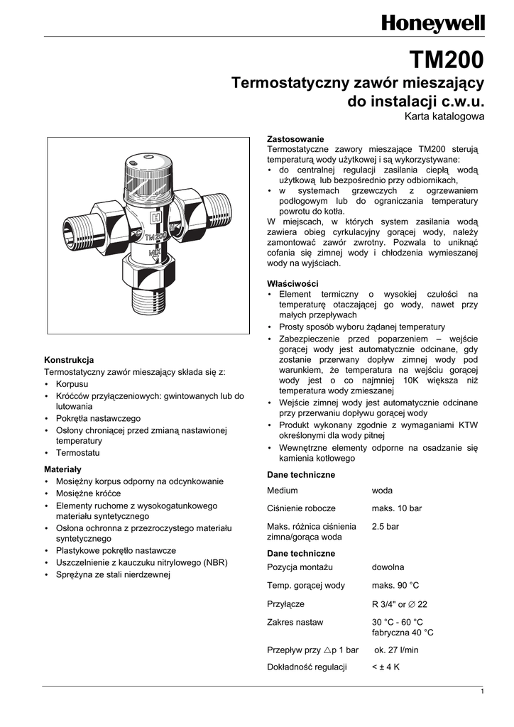 TM200 Termostatyczny zawór mieszający do instalacji c.w.u. Karta katalogowa Zastosowanie Termostatyczne zawory mieszające TM200 sterują temperaturą wody użytkowej i są wykorzystywane: • do centralnej regulacji zasilania ciepłą wodą użytkową lub bezpośrednio przy odbiornikach, • w systemach grzewczych z ogrzewaniem podłogowym lub do ograniczania temperatury powrotu do kotła. W miejscach, w których system zasilania wodą zawiera obieg cyrkulacyjny gorącej wody, należy zamontować zawór zwrotny. Pozwala to uniknąć cofania się zimnej wody i chłodzenia wymieszanej wody na wyjściach. Właściwości • Element • • Konstrukcja Termostatyczny zawór mieszający składa się z: • Korpusu • Króćców przyłączeniowych: gwintowanych lub do lutowania • Pokrętła nastawczego • Osłony chroniącej przed zmianą nastawionej temperatury • Termostatu Materiały • Mosiężny korpus odporny na odcynkowanie • Mosiężne króćce • Elementy ruchome z wysokogatunkowego materiału syntetycznego • Osłona ochronna z przezroczystego materiału syntetycznego • Plastykowe pokrętło nastawcze • Uszczelnienie z kauczuku nitrylowego (NBR) • Sprężyna ze stali nierdzewnej • • • termiczny o wysokiej czułości na temperaturę otaczającej go wody, nawet przy małych przepływach Prosty sposób wyboru żądanej temperatury Zabezpieczenie przed poparzeniem – wejście gorącej wody jest automatycznie odcinane, gdy zostanie przerwany dopływ zimnej wody pod warunkiem, że temperatura na wejściu gorącej wody jest o co najmniej 10K większa niż temperatura wody zmieszanej Wejście zimnej wody jest automatycznie odcinane przy przerwaniu dopływu gorącej wody Produkt wykonany zgodnie z wymaganiami KTW określonymi dla wody pitnej Wewnętrzne elementy odporne na osadzanie się kamienia kotłowego Dane techniczne Medium woda Ciśnienie robocze maks. 10 bar Maks. różnica ciśnienia zimna/gorąca woda 2.5 bar Dane techniczne Pozycja montażu dowolna Temp. gorącej wody maks. 90 °C Przyłącze R 3/4" or 22 Zakres nastaw 30 °C - 60 °C fabryczna 40 °C Przepływ przy p 1 bar ok. 27 l/min Dokładność regulacji <±4K 1 TM200 Termostatyczny zawór mieszający Przyłącze R Wymiary (mm) L l H 3 /4 " 22 mm 134 67 128 122 61 122 Zasada działania a) Jako zawór mieszający dla ciepłej wody użytkowej instalacji grzewczych: Bardzo czuły element termiczny umieszczony na wejściu zaworu steruje trzpieniem regulującym proporcje przepływu gorącej i zimnej wody, tak aby wymieszana woda miała temperaturę wybraną na pokrętle nastawczym. Na wejściach zimnej i gorącej wody zastosowano miękkie uszczelnienie umożliwiające: • odcięcie dopływu gorącej wody, gdy przerwany zostanie dopływ zimnej wody pod warunkiem, że temperatura gorącej wody na wejściu jest co najmniej 10K większa niż ustawiona temperatura wody zmieszanej;. • odcięcie dopływu zimnej wody, gdy przewany został dopływ gorącej wody. b) Jako zawór rozdzielający w systemach centralnego ogrzewania: W tych zastosowaniach przepływ przez zawór jest w odwrotnym kierunku niż w zaworze z funkcją mieszającą. Woda wejściowa przepływa wokół czujnika i reguluje ustawienie tłoczka w taki sposób, że przy temperaturach większych od temperatury nastawy woda powraca do obwodu grzewczego, a przy temperaturach niższych od temperatury nastawy woda powraca do kotła. Wraz z zaworem dostarczana jest osłona ochronna pozwalająca zablokować nastawę temperatury mieszanej wody. Oznaczenia katalogowe: TM200-3/4A = z króćcami gwintowanymi R 3/4" TM200-3/4B = z króćcami 22 mm do lutowania Akcesoria KB191-3/4 Zawór zwrotny Zabezpiecza systemy z obwodami cyrkulacyjnymi gorącej wody przed cofaniem się zimnej wody i schłodzaniem zmieszanej wody na wyjściach. Ciśnienie robocze: Temp. pracy : Pozycja pracy KB191 2 maks. 10 bar maks. 90 0C kierunek przepływu wskazany strzałką TM200 Termostatyczny zawór mieszający Przykłady instalacji a) Zawór mieszający w instalacji ciepłej wody użytkowej ½” maks. 17 m ¾” maks. 10 m 10 5 0 bar 15 16 10 5 0 Centralna regulacja temperatury Lokalna regulacja temperatury b) Zawór mieszający w systemach c.o. Obwód grzewczy z temperaturą kotła Serwis W warunkach normalnych pracy urządzenie nie wymaga szczególnego serwisu. Jednakże należy pamiętać, że wszystkie części ruchome wymagają okresowej wymianie. 15 16 Centralna regulacja temperatury w układzie z ogrzewaniem Solarnym c) Zawór rozdzielający w systemach c.o. Ogrzewanie podłogowe Zasady instalacji • Zawór należy instalować w taki sposób, aby nie wystąpiły naprężenia na zaworze. • Jeśli instalacja ciepłej wody użytkowej zawiera obwód cyrkulacyjny, należy zastosować zawór zwrotny. • Podczas montażu zaworu zwrotnego KB191 należy zwrócić uwagę na strzałkę kierunku przepływu. • Według zaleceń DVGW-W551 aby zapobiec rozmanażaniu się bakterii legionelli, pomiędzy zaworem mieszającym a punktem poboru wody nie powinno być więcej niż 3 litry. Taką ilość zapewnia rura ¾” (20 mm) o długości 10 m lub ½” (15 mm) o długości 17 m. bar Ograniczenie temperatury powrotu kotła Typowe zastosowania Termostatyczne zawory mieszające tego typu stosuje się do regulacji temperatury ciepłej wody użytkowej w poniższych instalacjach: a) Systemy ciepłej wody użytkowej: o wolnostojące lub wielorodzinne domki o domy opieki społecznej o żłobki i przedszkola o szkoły o hotele o kuchnie gastronomiczne o zastosowania przemysłowe: do sterowania jako zawór centralny lub bezpośrednio przy punkcie czerpalnym b) Systemy centralnego ogrzewania: o jako zawór mieszający dla systemów ogrzewania podłogowego o jako zawór dzielący do kontroli temperatury powrotu. 3 TM200 Termostatyczny zawór mieszający Części zamienne Termostatyczny zawór mieszający TM200, od 1996 Opis 1 Honeywell Sp. z o. o. ul. Domaniewska 39B, 02-672 WARSZAWA (48)(22) 606