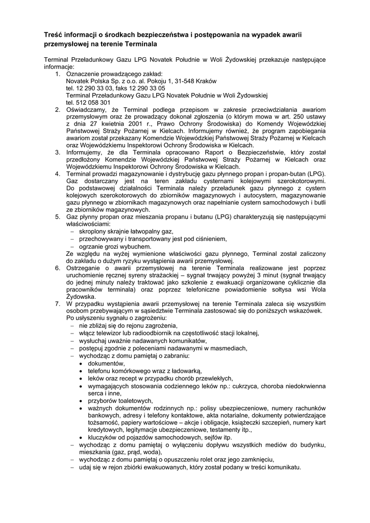 Treść informacji o środkach bezpieczeństwa i postępowania na wypadek awarii przemysłowej na terenie Terminala Terminal Przeładunkowy Gazu LPG Novatek Południe w Woli Żydowskiej przekazuje następujące informacje: 1. Oznaczenie prowadzącego zakład: Novatek Polska Sp. z o.o. al. Pokoju 1, 31-548 Kraków tel. 12 290 33 03, faks 12 290 33 05 Terminal Przeładunkowy Gazu LPG Novatek Południe w Woli Żydowskiej tel. 512 058 301 2. Oświadczamy, że Terminal podlega przepisom w zakresie przeciwdziałania awariom przemysłowym oraz że prowadzący dokonał zgłoszenia (o którym mowa w art. 250 ustawy z dnia 27 kwietnia 2001 r., Prawo Ochrony Środowiska) do Komendy Wojewódzkiej Państwowej Straży Pożarnej w Kielcach. Informujemy również, że program zapobiegania awariom został przekazany Komendzie Wojewódzkiej Państwowej Straży Pożarnej w Kielcach oraz Wojewódzkiemu Inspektorowi Ochrony Środowiska w Kielcach. 3. Informujemy, że dla Terminala opracowano Raport o Bezpieczeństwie, który został przedłożony Komendzie Wojewódzkiej Państwowej Straży Pożarnej w Kielcach oraz Wojewódzkiemu Inspektorowi Ochrony Środowiska w Kielcach. 4. Terminal prowadzi magazynowanie i dystrybucję gazu płynnego propan i propan-butan (LPG). Gaz dostarczany jest na teren zakładu cysternami kolejowymi szerokotorowymi. Do podstawowej działalności Terminala należy przeładunek gazu płynnego z cystern kolejowych szerokotorowych do zbiorników magazynowych i autocystern, magazynowanie gazu płynnego w zbiornikach magazynowych oraz napełnianie cystern samochodowych i butli ze zbiorników magazynowych. 5. Gaz płynny propan oraz mieszania propanu i butanu (LPG) charakteryzują się następującymi właściwościami: − skroplony skrajnie łatwopalny gaz, − przechowywany i transportowany jest pod ciśnieniem, − ogrzanie grozi wybuchem. Ze względu na wyżej wymienione właściwości gazu płynnego, Terminal został zaliczony do zakładu o dużym ryzyku wystąpienia awarii przemysłowej. 6. Ostrzeganie o awarii przemysłowej na terenie Terminala realizowane jest poprzez uruchomienie ręcznej syreny strażackiej – sygnał trwający powyżej 3 minut (sygnał trwający do jednej minuty należy traktować jako szkolenie z ewakuacji organizowane cyklicznie dla pracowników terminala) oraz poprzez telefoniczne powiadomienie sołtysa wsi Wola Żydowska. 7. W przypadku wystąpienia awarii przemysłowej na terenie Terminala zaleca się wszystkim osobom przebywającym w sąsiedztwie Terminala zastosować się do poniższych wskazówek. Po usłyszeniu sygnału o zagrożeniu: − nie zbliżaj się do rejonu zagrożenia, − włącz telewizor lub radioodbiornik na częstotliwość stacji lokalnej, − wysłuchaj uważnie nadawanych komunikatów, − postępuj zgodnie z poleceniami nadawanymi w masmediach, − wychodząc z domu pamiętaj o zabraniu: • dokumentów, • telefonu komórkowego wraz z ładowarką, • leków oraz recept w przypadku chorób przewlekłych, • wymagających stosowania codziennego leków np.: cukrzyca, choroba niedokrwienna serca i inne, • przyborów toaletowych, • ważnych dokumentów rodzinnych np.: polisy ubezpieczeniowe, numery rachunków bankowych, adresy i telefony kontaktowe, akta notarialne, dokumenty potwierdzające tożsamość, papiery wartościowe – akcje i obligacje, książeczki szczepień, numery kart kredytowych, legitymacje ubezpieczeniowe, testamenty itp., • kluczyków od pojazdów samochodowych, sejfów itp. − wychodząc z domu pamiętaj o wyłączeniu dopływu wszystkich mediów do budynku, mieszkania (gaz, prąd, woda), − wychodząc z domu pamiętaj o opuszczeniu rolet oraz jego zamknięciu, − udaj się w rejon zbiórki ewakuowanych, który został podany w treści komunikatu. 8. Biorąc pod uwagę główne scenariusze awarii przemysłowej, które zostały opisane w Raporcie o Bezpieczeństwie, scenariuszem, który w największym stopniu mógłby zagrozić osobom i obiektom poza terenem Terminala jest wybuch BLEVE (eksplozja rozprężającej się pary wrzącej cieczy) cysterny kolejowej przewożącej płynny gaz, którego następstwem może być pożar kulisty FIREBALL. Dla powyższego zdarzenia strefa zagrożenia będzie obejmować wieś Wolę Żydowską wraz z drogami dojazdowymi, pojedynczą zabudowę wiejską na południe od Terminala, bazę przeładunkową – pomieszczenia biurowo-socjalne, pomieszczenia administracyjne stacji kolejowej PKP-LHS wraz z odcinkiem linii kolejowej LHS oraz następujące linie kolejowe i drogi w okolicy zakładu: linię kolejową nr 70, drogę krajową nr 78 oraz drogę powiatową nr 0009T. W strefie zagrożenia mogą wystąpić: promieniowanie cieplne o natężeniu większym niż 4kW/m2 (jest to wartość powodująca ból przy narażeniu powyżej 20 sekund) spowodowane gwałtownym zapłonem ulatniającego się gazu, oraz odłamki powstałe podczas wybuchu typu BLEVE. Pozostałe scenariusze: wybuch BLEVE autocysterny przewożącej gaz płynny, wyciek gazu płynnego z rurociągu (w wyniku którego powstaje wybuch par w otwartej przestrzeni) oraz wyciek gazu płynnego z pompy (w wyniku którego powstaje wybuch par w otwartej przestrzeni) stwarzają mniejsze zagrożenie od wyżej opisanego. 9. W przypadku wystąpienia awarii przemysłowej na terenie Terminala podjęte zostaną następujące środki bezpieczeństwa: realizowane będą działania ratownicze polegające na uruchomieniu instalacji zraszaczowych na zagrożonych obiektach (zakład posiada zapas wody na 2-godzinne prowadzenie akcji ratowniczej),wyłączone zostaną wszystkie pompy i sprężarki gazu, zamknięte zostaną zawory na rurociągach i zbiornikach gazu, na terenie zakładu zostanie wyłączona energia elektryczna, powiadomiona zostanie Państwowa Straż Pożarna w Pińczowie oraz uruchomiona zostanie ręczna syrena strażacka na co najmniej 3 minuty (zasięg słyszalności 2 km). Nadmieniamy również, że Terminal jest zabezpieczo