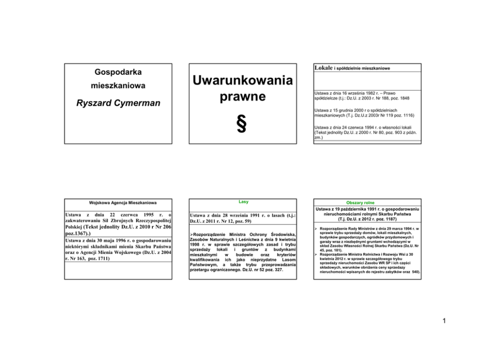Gospodarka mieszkaniowa Ryszard Cymerman Lokale i spółdzielnie mieszkaniowe Uwarunkowania prawne § Wojskowa Agencja Mieszkaniowa Lasy Ustawa z dnia 22 czerwca 1995 r. o zakwaterowaniu Sił Zbrojnych Rzeczypospolitej Polskiej (Tekst jednolity Dz.U. z 2010 r Nr 206 Ustawa z dnia 28 września 1991 r. o lasach (t.j.: Dz.U. z 2011 r. Nr 12, poz. 59) poz.1367).) Rozporządzenie Ministra Ochrony Środowiska, Zasobów Naturalnych i Leśnictwa z dnia 9 kwietnia 1998 r. w sprawie szczegółowych zasad i trybu sprzedaży lokali i gruntów z budynkami mieszkalnymi w budowie oraz kryteriów kwalifikowania ich jako nieprzydatne Lasom Państwowym, a także trybu przeprowadzania przetargu ograniczonego. Dz.U. nr 52 poz. 327. Ustawa z dnia 30 maja 1996 r. o gospodarowaniu niektórymi składnikami mienia Skarbu Państwa oraz o Agencji Mienia Wojskowego (Dz.U. z 2004 r. Nr 163, poz. 1711) Ustawa z dnia 16 września 1982 r. – Prawo spółdzielcze (t.j.: Dz.U. z 2003 r. Nr 188, poz. 1848 Ustawa z 15 grudnia 2000 r o spółdzielniach mieszkaniowych (T.j. Dz.U.z 2003r Nr 119 poz. 1116) Ustawa z dnia 24 czerwca 1994 r. o własności lokali (Tekst jednolity Dz.U. z 2000 r. Nr 80, poz. 903 z późn. zm.) Obszary rolne Ustawa z 19 października 1991 r. o gospodarowaniu nieruchomościami rolnymi Skarbu Państwa (T.j. Dz.U. z 2012 r. poz. 1187) Rozporządzenie Rady Ministrów z dnia 29 marca 1994 r. w sprawie trybu sprzedaży domów, lokali mieszkalnych, budynków gospodarczych, ogródków przydomowych i garaży wraz z niezbędnymi gruntami wchodzącymi w skład Zasobu Własności Rolnej Skarbu Państwa (Dz.U. Nr 45, poz. 181). Rozporządzenie Ministra Rolnictwa i Rozwoju Wsi z 30 kwietnia 2012 r. w sprawie szczegółowego trybu sprzedaży nieruchomości Zasobu WR SP i ich części składowych, warunków obniżenia ceny sprzedazy nieruchomości wpisanych do rejestru zabytków oraz 540). 1 Definicja nieruchomości lokalowej (art. 2 i art. 3 ust. 1 ustawy o własności lokali). Ustawa z dnia 15 grudnia 2000 r. o zasadach zbywania mieszkań będących własnością przedsiębiorstw państwowych, niektórych spółek handlowych z udziałem Skarbu Państwa, państwowych osób prawnych oraz niektórych mieszkań będących własnością Skarbu Państwa (Dz.U. z 2001 r. Nr 4, poz. 24.) Nieruchomość lokalowa Uregulowania wynikające z Ustawy z dnia 24 czerwca 1994 r. o własności lokali (T.j.Dz.U. z 2000 r. Nr 80, poz. 903.) Definicja nieruchomości lokalowej W odróżnieniu od nieruchomości budynkowej prawem głównym (nadrzędnym) w odniesieniu do nieruchomości lokalowej jest własność samodzielnego lokalu i pomieszczeń do niego przynależnych mieszkalnego użytkowego + Udział w nieruchomości wspólnej Nieruchomość wspólna Wspólne części budynku Grunt prawo odrębnej własności samodzielnego lokalu i pomieszczeń do niego przynależnych, zaś prawem związanym – udział właściciela lokalu w nieruchomości wspólnej. Przez nieruchomość lokalową należy rozumieć: prawo odrębnej własności samodzielnego lokalu i pomieszczeń do niego przynależnych wraz z udziałem nieruchomości wspólnej. Definicja nieruchomości lokalowej Prawo własności lokalu jako prawo główne warunkuje istnienie współwłasności w nieruchomości wspólnej (współwłasność części wspólnych budynku i współwłasność – współużytkowanie wieczyste – gruntu). Odwrotnie niż w odniesieniu do nieruchomości budynkowej, utrata własności lokalu powoduje utratę prawa do części wspólnych budynku i prawa do gruntu, zarówno jako przedmiotu współwłasności, jak też współużytkowania wieczystego. 2 Definicja samodzielnego lokalu według ustawy o własności lokali (art. 2 ust. 2 ). Definicja części składowej lokalu (art. 2 ust. 4 ustawy o własności lokali). Samodzielnym lokalem mieszkalnym jest wydzielona trwałymi ścianami w obrębie budynku izba lub zespół izb przeznaczonych na stały pobyt ludzi, które wraz z pomieszczeniami pomocniczymi służą zaspokajaniu ich potrzeb mieszkaniowych. Przepis ten stosuje się odpowiednio również do samodzielnych lokali wykorzystywanych zgodnie z przeznaczeniem na cele inne niż mieszkalne. Pomieszczenia przeznaczone na stały pobyt ludzi • To takie pomieszczenia, w których przebywanie tych samych osób w ciągu doby może trwać dłużej niż 4 godziny Rozporządzenie Ministra Infrastruktury z 12.04.2002 r. w sprawie warunków technicznych jakim powinny odpowiadać budynki i ich usytuowanie (Dz. U. 2002/75, poz. 690 z późn. zm.) Do lokalu mogą przynależeć, jako jego części składowe, pomieszczenia zwane pomieszczeniami przynależnymi, choćby nawet do niego bezpośrednio nie przylegały lub były położone w granicach nieruchomości gruntowej poza budynkiem, w którym wyodrębniono dany lokal, a w szczególności: piwnica, strych, komórka, garaż. Samodzielny lokal mieszkalny Spełnienie wymagań przez pomieszczenia stawiane samodzielnym lokalom stwierdza starosta w formie zaświadczenia. Lokal stanowi odrębną nieruchomość gdy spełnione są trzy warunki: 1.Samodzielność lokalu 2.Wyodrębnienie pod względem własności 3.Uregulowanie w księdze wieczystej Szkic lokalizacji Lokale wraz z pomieszczeniami do nich przynależnymi zaznacza się na rzucie odpowiednich kondygnacji budynku, a w razie położenia pomieszczeń przynależnych poza budynkiem mieszkalnym - także na wyrysie z operatu ewidencyjnego; dokumenty te stanowią załącznik do aktu ustanawiającego odrębną własność lokalu. 3 Szkic lokalizacji rzut kondygnacji budynku Zadość zaznaczenia na rzucie kondygnacji spełnia zaznaczenie lokalu i pomieszczeń doń przynależnych na fragmencie rzutu kondygnacji budynku (Stanowisko Urzędu Mieszkalnictwa i Rozwoju Miast w piśmie z 30 maja 2000 r , znak: PO024-26/00 Szkic lokalizacji W razie braku dokumentacji technicznej budynku, dokonuje się inwentaryzacji budowlanej zgodnie z wymogami przepisów prawa budowlanego, na koszt 