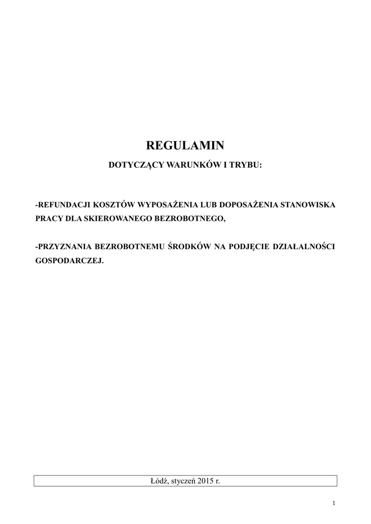 REGULAMIN DOTYCZĄCY WARUNKÓW I TRYBU: -REFUNDACJI KOSZTÓW WYPOSAŻENIA LUB DOPOSAŻENIA STANOWISKA PRACY DLA SKIEROWANEGO BEZROBOTNEGO, -PRZYZNANIA BEZROBOTNEMU ŚRODKÓW NA PODJĘCIE DZIAŁALNOŚCI GOSPODARCZEJ. Łódź, styczeń 2015 r. 1 SPIS TREŚCI I. Postanowienia ogólne .................................................................................................................... 3 II. Formy zabezpieczenia zobowiązań wobec Urzędu ................................................................... 6 III. Refundacja kosztów wyposażenia lub doposażenia stanowiska pracy dla skierowanego bezrobotnego ................................................................................................................................ 8 IV. Przyznawanie bezrobotnemu środków na podjęcie działalności gospodarczej ............................................................................................................................... 13 V. Postanowienia końcowe ............................................................................................................. 19 2 I. Postanowienia ogólne §1 Refundacje ze środków Funduszu Pracy kosztów wyposażenia lub doposażenia stanowiska pracy dla skierowanego bezrobotnego oraz przyznawanie bezrobotnemu środków na podjęcie działalności gospodarczej, oraz wymiar dopuszczalnej pomocy regulują: 1. Ustawa z dnia 20 kwietnia 2004 roku o promocji zatrudnienia i instytucjach rynku pracy (t.j. Dz. U. 2013.674 z późn. zm.). 2. Rozporządzenie Ministra Pracy i Polityki Społecznej z dnia 23 kwietnia 2012 roku w sprawie dokonania refundacji z Funduszu Pracy kosztów wyposażenia lub doposażenia stanowiska pracy dla skierowanego bezrobotnego oraz przyznawania środków na podjęcie działalności gospodarczej. (Dz.U. 2012.457 z późn. zm.), 3. Ustawa z dnia 2 lipca 2004 r. o swobodzie działalności gospodarczej (t.j. Dz.U. z 2010 r. nr 220, poz. 1447, z późn zm.) §2 Ilekroć w niniejszym Regulaminie mowa jest o: 1. „Urzędzie” – należy przez to rozumieć – Powiatowy Urząd Pracy Łódź-Wschód; 2. „ustawie” – należy przez to rozumieć ustawę z dnia 20 kwietnia 2004 roku o promocji zatrudnienia i instytucjach rynku pracy (t.j. Dz. U. 2013.674 z późn. zm.); 3. „rozporządzeniu” – należy przez to rozumieć Rozporządzenie Ministra Pracy i Polityki Społecznej z dnia 23 kwietnia 2012 roku w sprawie dokonania refundacji z Funduszu Pracy kosztów wyposażenia lub doposażenia stanowiska pracy dla skierowanego bezrobotnego oraz przyznawania środków na podjęcie działalności gospodarczej. (Dz.U. 2012.457 z późn. zm.) 4. „bezrobotnym” – oznacza to osobę spełniająca przesłanki art. 2 ustawy; 5. „przeciętnym wynagrodzeniu” – należy przez to rozumieć przeciętne wynagrodzenie w poprzednim kwartale od pierwszego dnia następnego miesiąca po ogłoszeniu przez Prezesa Głównego Urzędu Statystycznego w Dzienniku Urzędowym Rzeczpospolitej Polskiej „Monitor Polski”, na podstawie art. 20 pkt 2 ustawy z dnia 17 grudnia 1998 r. o emeryturach i rentach z Funduszu Ubezpieczeń Społecznych (Dz. U. z 2004 r. nr 39, poz. 353, z późn. zm.), 6. „podmiocie” – należy przez to rozumieć podmiot prowadzący działalność gospodarczą, 7. „producencie rolnym” – należy przez to rozumieć osobę fizyczną, osobę prawną lub jednostkę organizacyjną nieposiadającą osobowości prawnej, zamieszkującą lub mająca siedzibę na terytorium Rzeczpospolitej Polskiej, będącą posiadaczem gospodarstwa rolnego w rozumieniu ustawy z dnia 15.11.1984 r. o podatku rolnym (Dz.U. z 2006 r. Nr 136, poz. 969, z późn. zm.) lub prowadzącą dział specjalny produkcji rolnej, o którym mowa w ustawie z dnia 26.07.1991 r. o podatku dochodowym od osób fizycznych (Dz.U. z 2012 r., poz. 361 z późn. zm.) lub w ustawie z dnia 15.02.1992 r. o podatku dochodowym od osób prawnych (Dz.U. z 200 r. Nr 54, poz 654, z późn. zm.), zatrudniającym w okresie ostatnich 6 miesięcy, w każdym miesiącu, co najmniej jednego pracownika w pełnym wymiarze czasu pracy. 8. „absolwencie CIS” – należy przez to rozumieć absolwenta centrum integracji społecznej, o którym mowa w art. 2 pkt 1a ustawy z dnia 13 czerwca 2003 r. o zatrudnieniu socjalnym (Dz. U. z 2011 r. Nr 43, poz. 225 i Nr 205, poz. 1211), 9. „absolwencie KIS” – należy przez to rozumieć absolwenta klubu integracji społecznej, o którym mowa w art. 2 pkt 1b ustawy z dnia 13 czerwca 2003 r. o zatrudnieniu socjalnym 10. „dofinansowaniu” – należy przez to rozumieć jednorazowe środki na podjęcie działalności gospodarczej przyznawane bezrobotnemu z Funduszu Pracy. 3 §3 1. Starosta ze środków Funduszu Pracy może: 1) zrefundować podmiotowi prowadzącemu działalność gospodarczą koszty wyposażenia lub doposażenia stanowiska pracy dla skierowanego bezrobotnego w wysokości określonej w umowie, nie wyższej jednak niż 6-krotnej wysokości przeciętnego wynagrodzenia; 2) zrefundować producentowi rolnemu koszty wyposażenia lub doposażenia stanowiska pracy dla skierowanego bezrobotnego w wysokości określonej w umowie, nie wyższej jednak niż 6krotnej wysokości przeciętnego wynagrodzenia; 3) zrefundować niepublicznemu przedszkolu i niepublicznej szkole, o których mowa w ustawie z dnia 07.09.1991 r. o systemie oświaty (Dz.U z 2004 r. Nr 256, poz. 2572, z późn. zm.) koszty wyposażenia lub doposażenia stanowiska pracy dla skierowanego bezrobotnego w wysokości określonej w umowie, nie wyższej jednak niż 6-krotnej wysokości przeciętnego wynagrodzenia; 4) przyznawać bezrobotnemu, uprawnionemu w świetle ustawy i rozporządzenia, jednorazowo środki na podjęcie działalności gospodarczej, w tym na pokrycie kosztów pomocy prawnej, konsultacji i doradztwa związane z podjęciem tej działalności, w wysokości określonej w umowie, nie wyższej jednak niż 6-krotnej wysokości przeciętnego wynagrodze