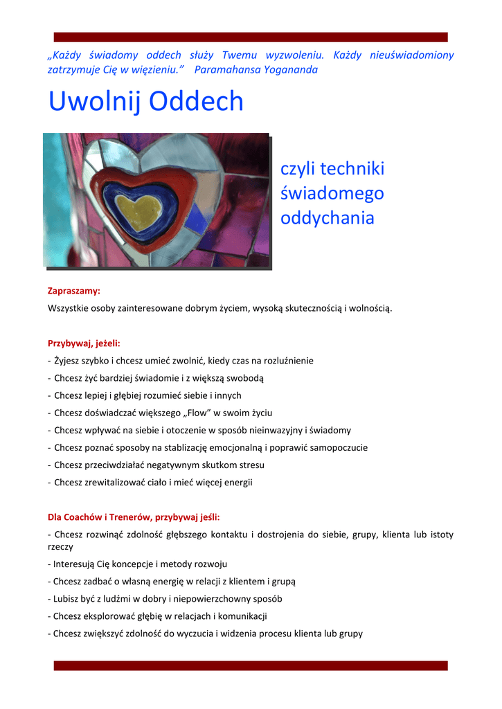 „Każdy świadomy oddech służy Twemu wyzwoleniu. Każdy nieuświadomiony zatrzymuje Cię w więzieniu.” Paramahansa Yogananda Uwolnij Oddech czyli techniki świadomego oddychania Zapraszamy: Wszystkie osoby zainteresowane dobrym życiem, wysoką skutecznością i wolnością. Przybywaj, jeżeli: - Żyjesz szybko i chcesz umieć zwolnić, kiedy czas na rozluźnienie - Chcesz żyć bardziej świadomie i z większą swobodą - Chcesz lepiej i głębiej rozumieć siebie i innych - Chcesz doświadczać większego „Flow” w swoim życiu - Chcesz wpływać na siebie i otoczenie w sposób nieinwazyjny i świadomy - Chcesz poznać sposoby na stablizację emocjonalną i poprawić samopoczucie - Chcesz przeciwdziałać negatywnym skutkom stresu - Chcesz zrewitalizować ciało i mieć więcej energii Dla Coachów i Trenerów, przybywaj jeśli: - Chcesz rozwinąć zdolność głębszego kontaktu i dostrojenia do siebie, grupy, klienta lub istoty rzeczy - Interesują Cię koncepcje i metody rozwoju - Chcesz zadbać o własną energię w relacji z klientem i grupą - Lubisz być z ludźmi w dobry i niepowierzchowny sposób - Chcesz eksplorować głębię w relacjach i komunikacji - Chcesz zwiększyć zdolność do wyczucia i widzenia procesu klienta lub grupy Korzyści z sesji oddechowych mogą być natychmiastowe: - redukcja stresu poprzez głęboką relaksację, doskonałe samopoczucie - więcej młodzieńczej witalności i energii, poczucie trwałego szczęścia, - stabilizacja emocjonalna, spokój wewnętrzny, - zdolność do współodczuwania i empatii, - wyższe poczucie własnej wartości, - efektywniejsze rozwiązywanie problemów, - poprawniejsze i łatwiejsze stosunki międzyludzkie, - jasność umysłu, - zwiększona zdolność postrzegania i dokonywania pozytywnych zmian, - poszerzenie świadomości, głębokie poczucie celu i sensu życia. Intencja „Uwolnij Oddech” Program „Uwolnij Oddech” przygotowałem z myślą o podzieleniu się jedną z najbardziej skutecznych metod, którą znam. Świadomość oddechu i umiejętność wpływania na niego wielokrotnie pozwoliły mi na poradzenie sobie w momentach wymagających, czy to podczas zawodowych spotkań i rozmów, czy to w sytuacji pracy z grupą, zawsze kiedy potrzebowałem pozostać silny i wrażliwy jednocześnie. Czasem jeden oddech wystarczył, aby zwolnić moją reakcję emocjonalną, dzięki czemu mogłem odpowiedzieć na sytuację i spontanicznie, i adekwatnie - zgodnie z własnym wyborem i najlepszą intencją. Czasem kilka oddechów pozowliło mi na zmianę własnego stanu, a dzięki temu energii spotkania, coachingu, grupy. Zdarzyły się momenty, w których mogłem zwiększyć dostęp do swoich zasobów, żeby wpłynąć na skonfliktowaną grupę szkoleniową, czy stworzyć dobrą atmosferę w relacji coachingowej. Te same sposoby działały w moich relacjach z najbliższymi. Świadomie używam oddechu, kiedy chcę powiedzieć na czym mi zależy i być w dobrym kontakcie z bliską mi osobą, kiedy chcę wysłuchać i być prawdziwie obecnym z historią drugiego człowieka. Kiedy chcę uszanować człowieka, komunikuję się w bardzo pierwotny i zawsze rozpoznawalny sposób - poprzez oddech mówię: Jestem w pełni z Tobą i mam Cię na uwadze. Czasem intuicyjnie robimy to wszyscy. Oddech to specyficzny rodzaj komunikacji, który jest bezłbędnie odczytywany przez innych. Świadomość własnego oddechu przynosi informacje o tym, jak czują się inni, czasem rownież o tym, jakie są ich zamiary. Zarządzanie oddechem pomaga w najbardziej nieinwazyjny sposób oddziaływać na otoczenie. Dzięki świadomości oddechu możemy stworzyć również intymność lub flow - jeden z tych magicznych momentów, kiedy czas przestaje istnieć, a pojawia się poczucie zjednoczenia z sytuacją, ze sobą i z człowiekiem, z którym jesteśmy lub z czynnością, którą wykonujemy - zostaliśmy pochwyceni przez przepływ chwili obecnej, w której dotykamy czegoś wyjątkowego. Oddech pozwala kreować takie chwile w naszym życiu. Pozwala nam na twórcze relacje, zamiast zmagań. Używać go możesz też jeszcze inaczej. Oddech pozwoli Ci na zintegrowanie emocji - oddech łagodnie uświadamia i oczyszcza emocje. Pozwala na odzyskanie związanej nimi energii i twórcze jej wykorzystanie. Często pozwala na otwarcie zamiast zamknięcia i izolowania się, albo pozorowania otwartości. Pozwala być dobrym. Pozwala zatrzymać kręcące się szalone koło - może być to koło pracy, bezradności, lenistwa, kłótni, urazy lub inne - i puścić jego bieg w przeciwną stronę. Czy tak jest zawsze? Nie jest. W życiu mierzymy się ze wszystkim, co ono przynosi. Czasem udaje się nam to sposób godny, a czasem nie radzimy sobie tak dobrze, jakbyśmy tego chcieli - życie nas przerasta. Czasem kogoś ranimy, albo nie starcza nam cierpliwości czy zaangażowania. Mamy oparcie wówczas oparcie w swoich relacjach, jedną z nich jest relacja z oddechem. Oddech uwalnia mnie, jeśli ja uwalniam jego - mamy taki układ. Ten układ jest uczciwy i nigdy mnie nie zawiódł, jeśli ja go nie zawiodłem, zawsze ze mną działał, kiedy ja działałem z nim. Nigdy też się na mnie nie obraził i zawsze był dla mnie dostępny, kiedy zdecydowałem na jego odtworzenie. Krótkie chwile romansu z oddechem, przynoszą chwilowe uniesienia, które wzbogacają moje życie, czynią je przyjemniejszym, bardziej wartym przeżycia. Długoterminowa relacja tworzy się w tym układzie dzięki regularnej inwestycji w praktykę świadomego oddychania. Można ją tworzyć wszędzie: możesz poświęcać specjalny czas na ćwiczenia, możesz praktykować w każdym miejscu i czasie - oddychasz przecież zawsze. Inwestycja ta zwraca się powielokroć w ogólnym poczuciu harmonii i swobody w życiu - wolności od reagowania w nawykowy, nieświadomy sposób. Korzyści z regularności świadomego oddychania stają po mojej stronie szybciej wracam do stanu równowagi, czasem o