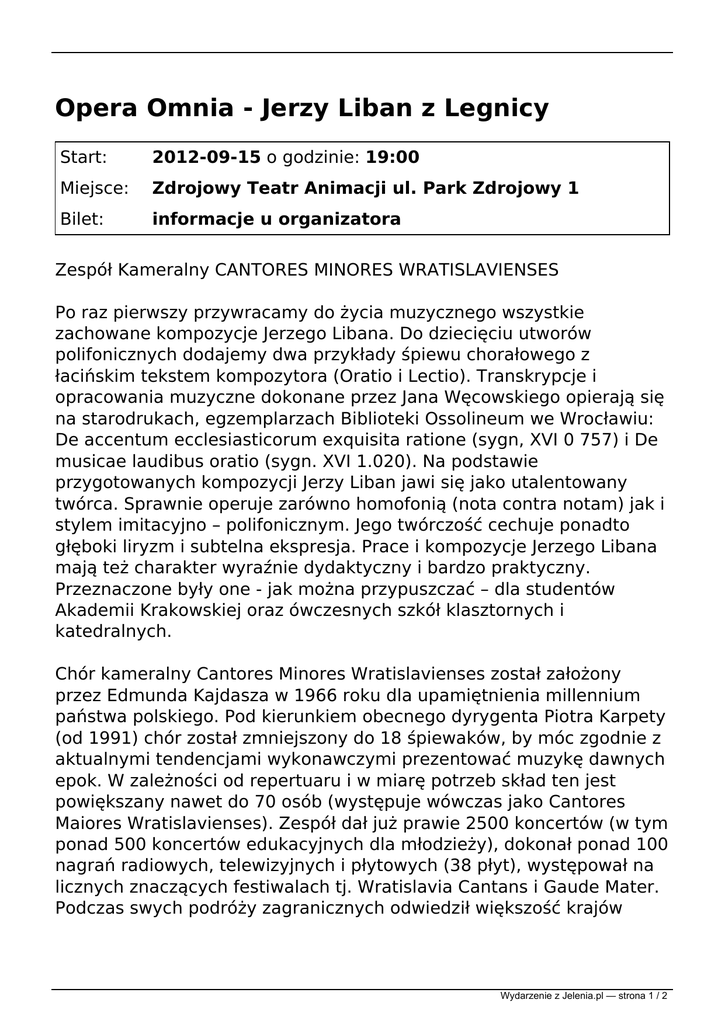 Opera Omnia - Jerzy Liban z Legnicy Start: 2012-09-15 o godzinie: 19:00 Miejsce: Zdrojowy Teatr Animacji ul. Park Zdrojowy 1 Bilet: informacje u organizatora Zespół Kameralny CANTORES MINORES WRATISLAVIENSES Po raz pierwszy przywracamy do życia muzycznego wszystkie zachowane kompozycje Jerzego Libana. Do dziecięciu utworów polifonicznych dodajemy dwa przykłady śpiewu chorałowego z łacińskim tekstem kompozytora (Oratio i Lectio). Transkrypcje i opracowania muzyczne dokonane przez Jana Węcowskiego opierają się na starodrukach, egzemplarzach Biblioteki Ossolineum we Wrocławiu: De accentum ecclesiasticorum exquisita ratione (sygn, XVI 0 757) i De musicae laudibus oratio (sygn. XVI 1.020). Na podstawie przygotowanych kompozycji Jerzy Liban jawi się jako utalentowany twórca. Sprawnie operuje zarówno homofonią (nota contra notam) jak i stylem imitacyjno – polifonicznym. Jego twórczość cechuje ponadto głęboki liryzm i subtelna ekspresja. Prace i kompozycje Jerzego Libana mają też charakter wyraźnie dydaktyczny i bardzo praktyczny. Przeznaczone były one - jak można przypuszczać – dla studentów Akademii Krakowskiej oraz ówczesnych szkół klasztornych i katedralnych. Chór kameralny Cantores Minores Wratislavienses został założony przez Edmunda Kajdasza w 1966 roku dla upamiętnienia millennium państwa polskiego. Pod kierunkiem obecnego dyrygenta Piotra Karpety (od 1991) chór został zmniejszony do 18 śpiewaków, by móc zgodnie z aktualnymi tendencjami wykonawczymi prezentować muzykę dawnych epok. W zależności od repertuaru i w miarę potrzeb skład ten jest powiększany nawet do 70 osób (występuje wówczas jako Cantores Maiores Wratislavienses). Zespół dał już prawie 2500 koncertów (w tym ponad 500 koncertów edukacyjnych dla młodzieży), dokonał ponad 100 nagrań radiowych, telewizyjnych i płytowych (38 płyt), występował na licznych znaczących festiwalach tj. Wratislavia Cantans i Gaude Mater. Podczas swych podróży zagranicznych odwiedził większość krajów Wydarzenie z Jelenia.pl — strona 1 / 2 europejskich, a także Izrael, Turcję, Gruzję, Armenię, Azerbejdżan i Meksyk. Nagrana w 2007 roku płyta "Jasnogórska Muzyka Dawna vol. 21" z utworami Józefa Elsnera oraz Pasja P. Mykietyna otrzymały nominacje do nagrody Fryderyk. PROGRAM KONCERTU : 1. J. Liban - Ortus de Polonia 2. J. Liban - Magnificat ton VII 3. J. Liban - Epistola 4. G. G. Gorczycki - Gaude Maria Virgo 5. J. Rudolf - Das Lied von der Auferstehung 6. Th. Morley - Now is the month 7. J. Lennon/P. Mc Cartney - Michelle 8. Lasso Orlando - Matona mia cara 9. Boccherini L. opr. A. Borzym - Obiad rodzinny (sł. W. Młynarski) 10. Lasso Orlando - O, la! O che bon eco! 11. Nicolaus Zangius - Kölner Markt 12. Maklakiewicz J. - Kołysanka 13. Passereau - Il est bel et bon 14. Certon P. - Je ne l’ose dire 15. Adriano Banchieri - Contraponto bestiale alla mente 16. J. Brahms - Dein Herzlein mild 17. Anonim - Nie złodziejem 18. F. Schöggl - Die launige Forelle 19. Erasmus Widmann- Die Martinsgans 20. Lasso Orlando - Bonjour mon coeur 21. A. Willaert - Vecchie letrose 22. Volksweise - Schlaf ein Link do oryginalnej publikacji: http://jelenia.pl/Opera_Omnia_Jerzy_Liban_z_Legnicy_636.html Wygenerowano: 03/03/2017 14:47:24 © Jelenia.pl Wydarzenie z Jelenia.pl — strona 2 / 2 Powered by TCPDF (www.tcpdf.org)